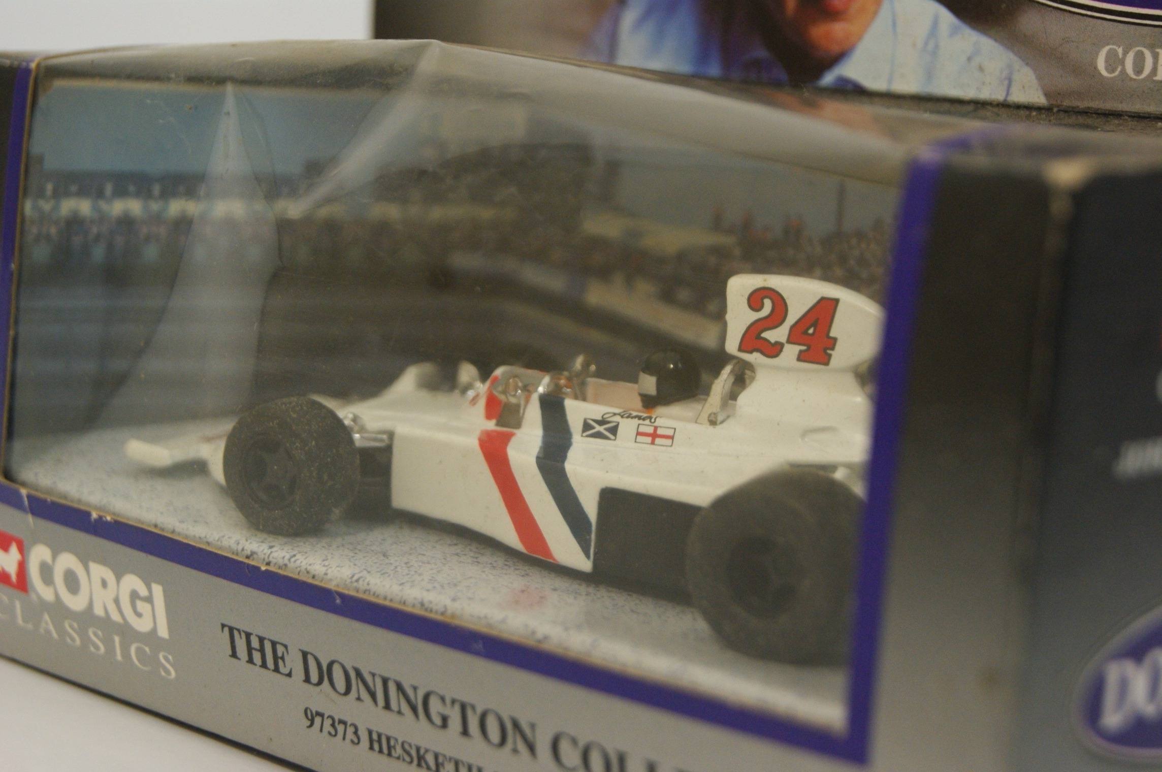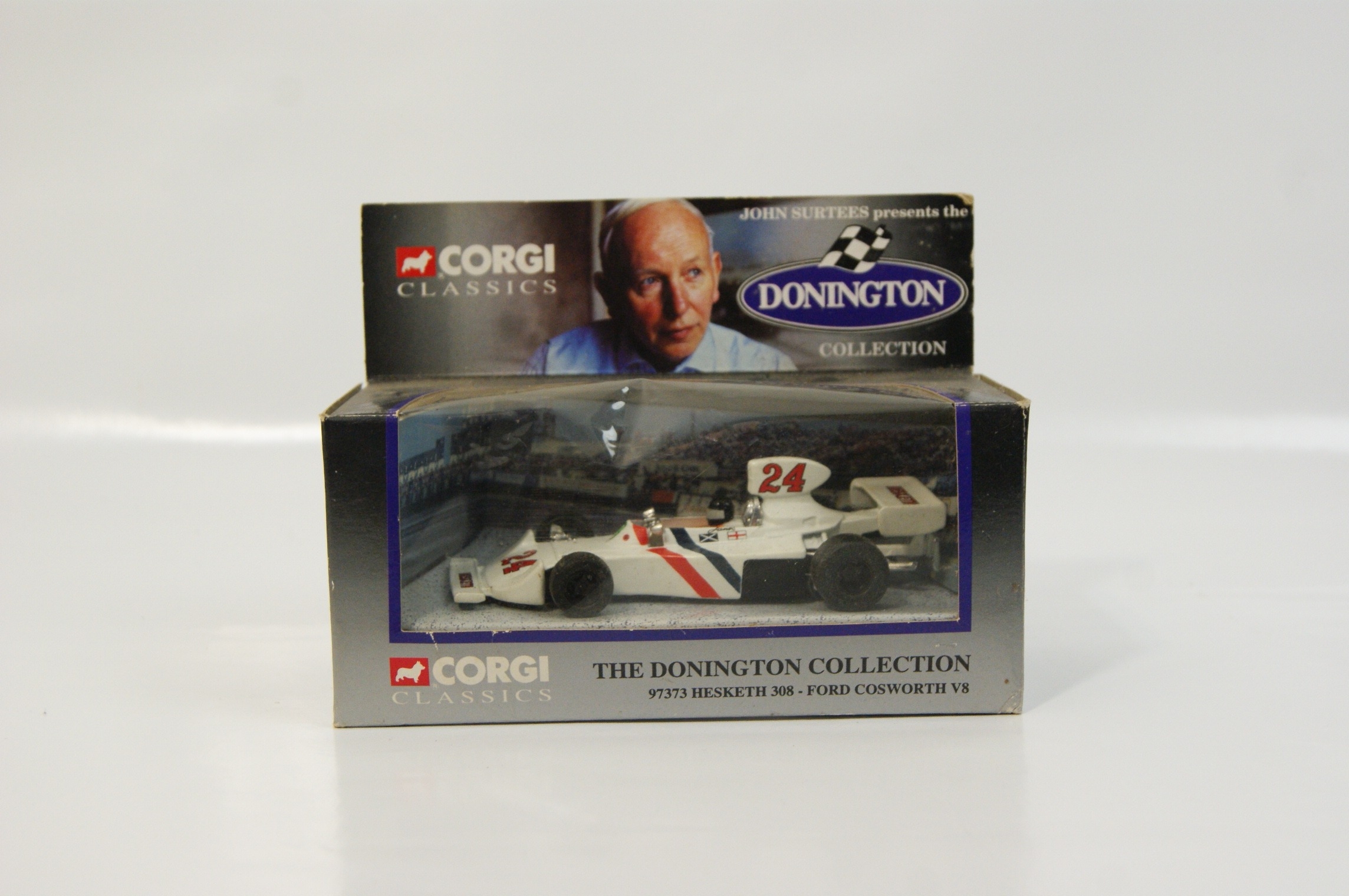 Corgi Classics die-cast metal model of the Hesketh 308 Ford Cosworth V8, released as part of The Donington Collection presented by John Surtees. This approximately 1:43 scale model depicts the iconic Formula 1 car driven by James Hunt, finished in a white base livery with red and blue diagonal stripes and racing number 24. The model features a detailed driver figure with a black helmet, authentic team decals including the Scottish and English flags, and James Hunt’s signature reproduced on the cockpit side. The car is constructed from die-cast metal with plastic components and features a standard free-wheeling mechanism. It is housed in its original grey and blue window display box, which includes a fold-up header card featuring John Surtees and historical text on the reverse detailing the Hesketh-Hunt partnership and Harvey Postlethwaite’s engineering. Item number 97373.