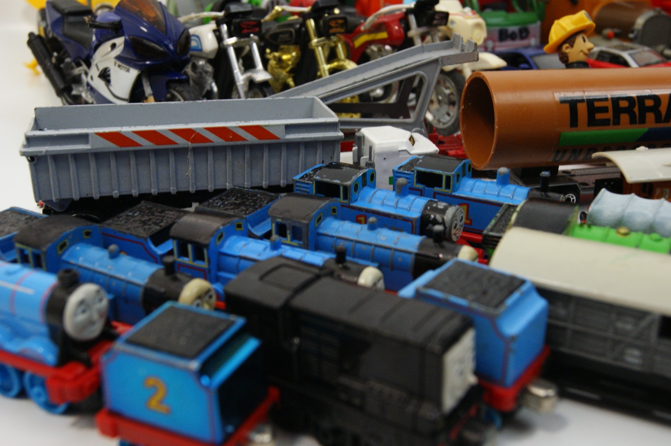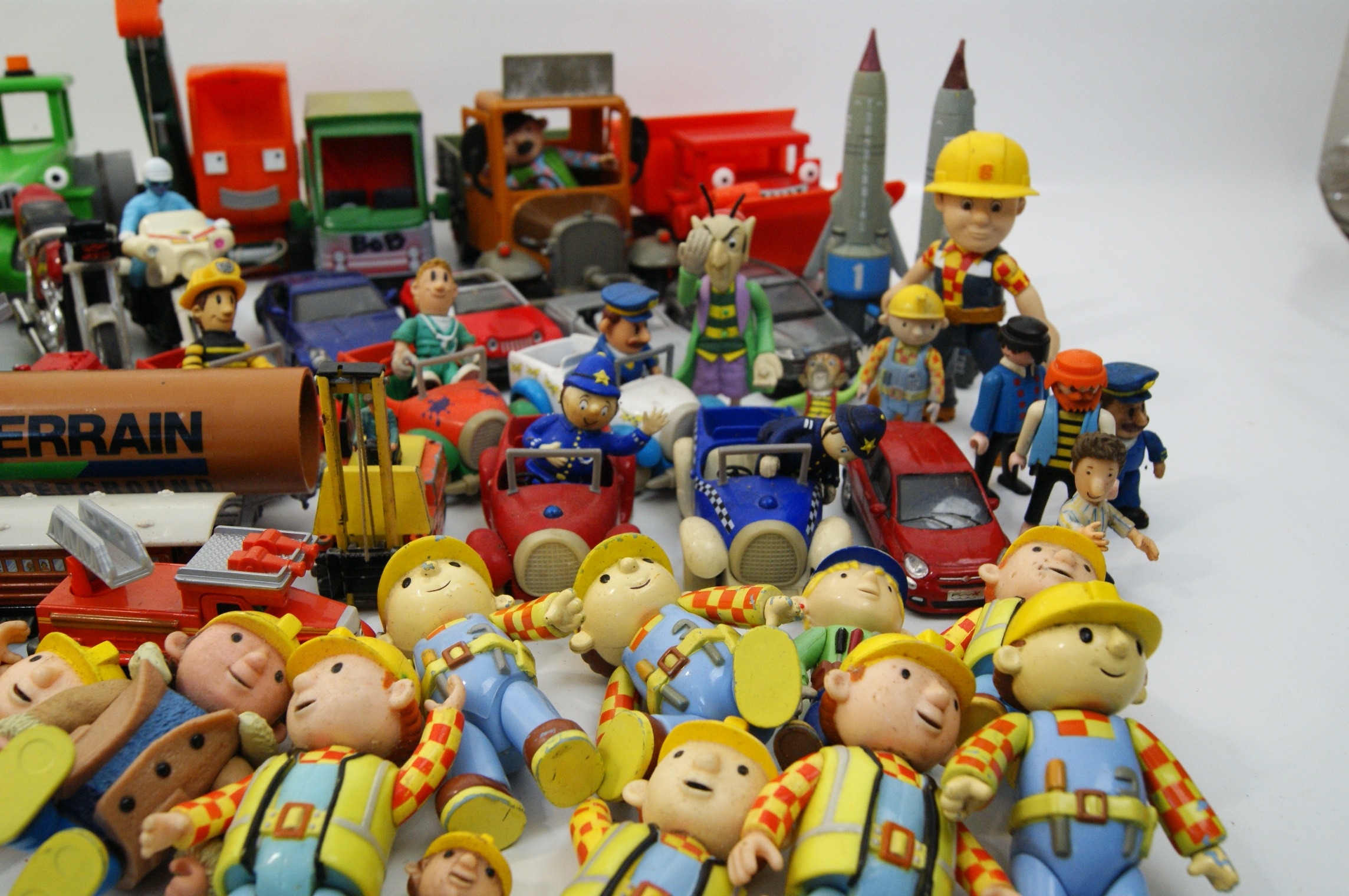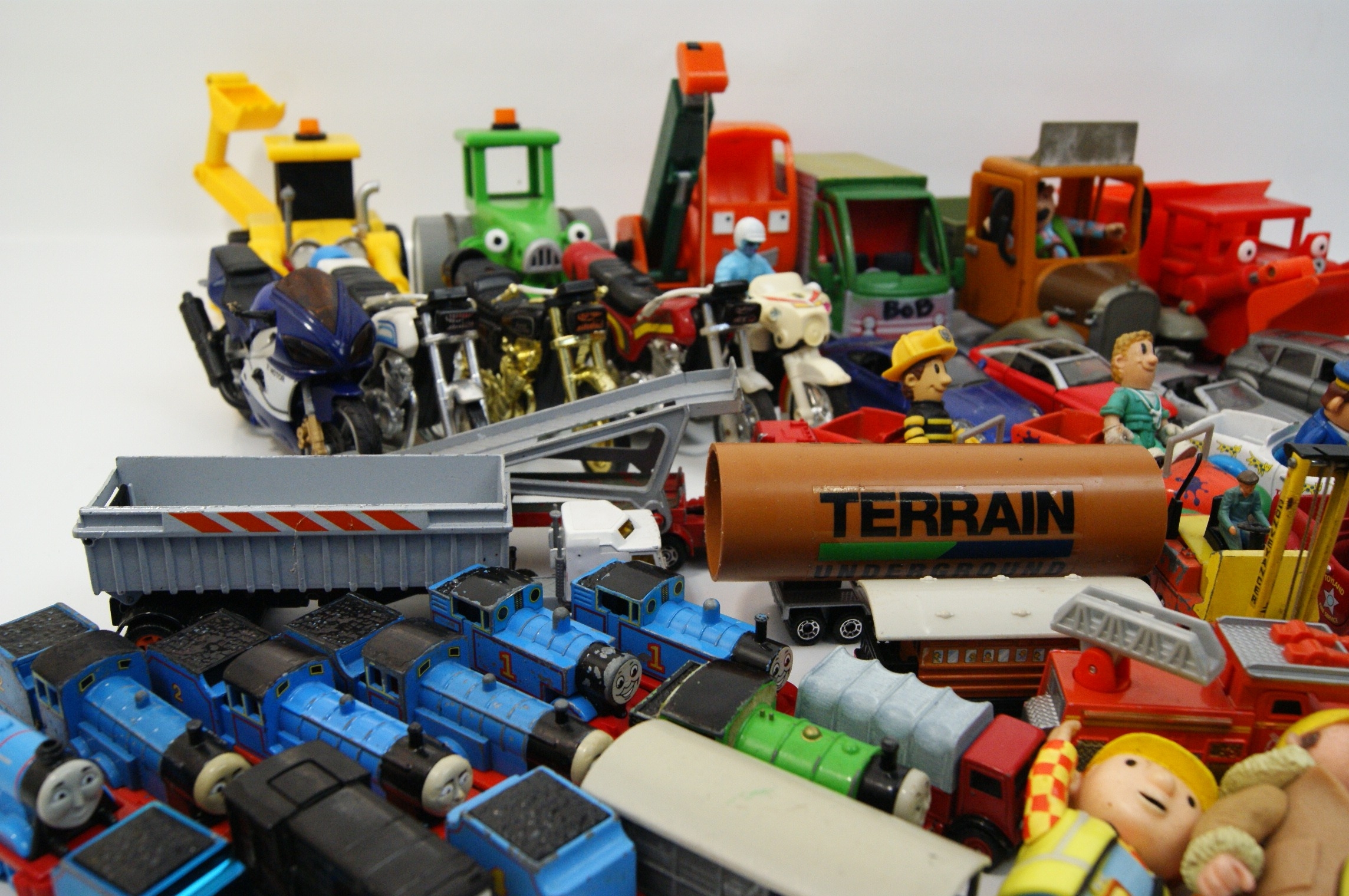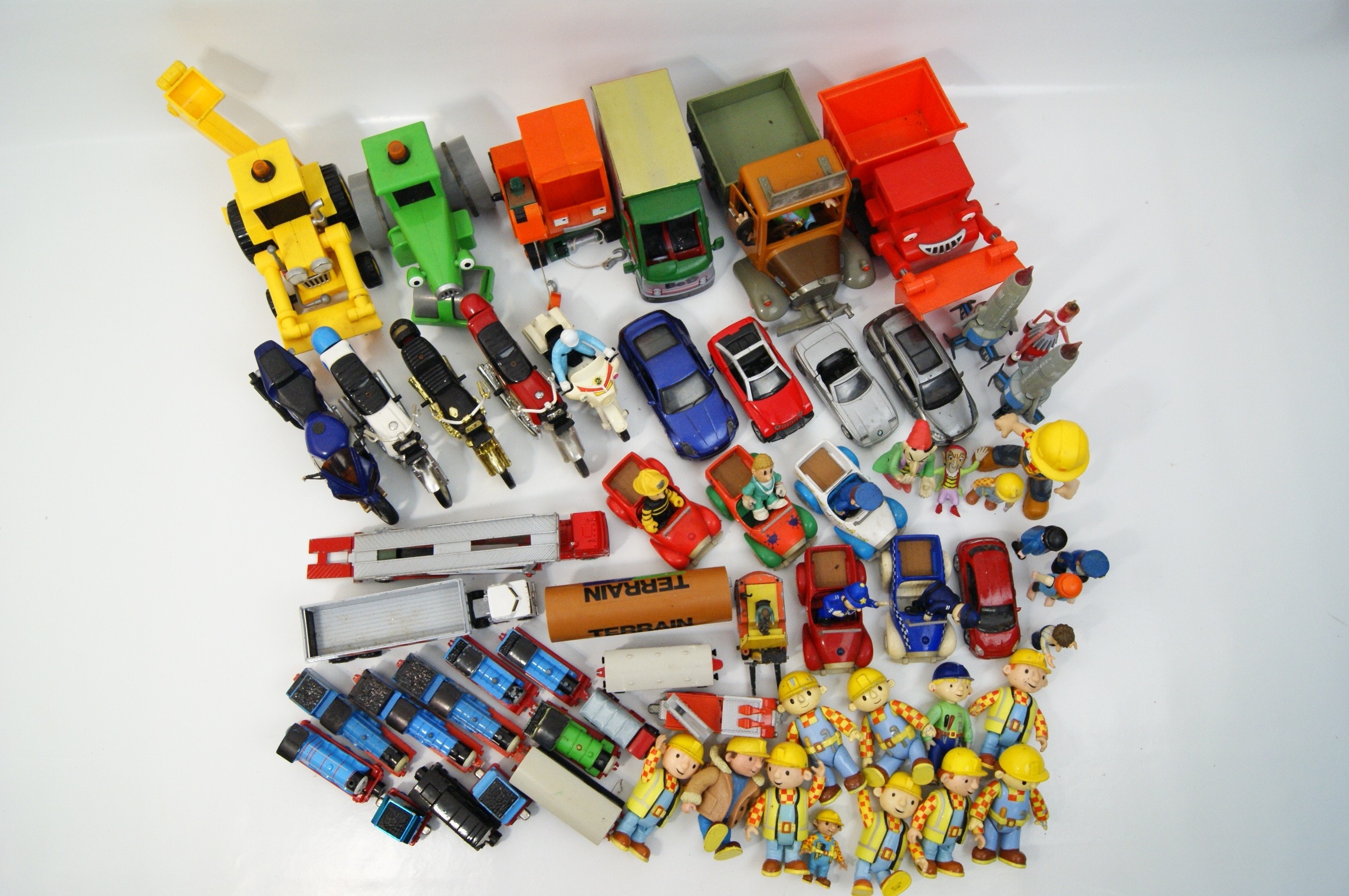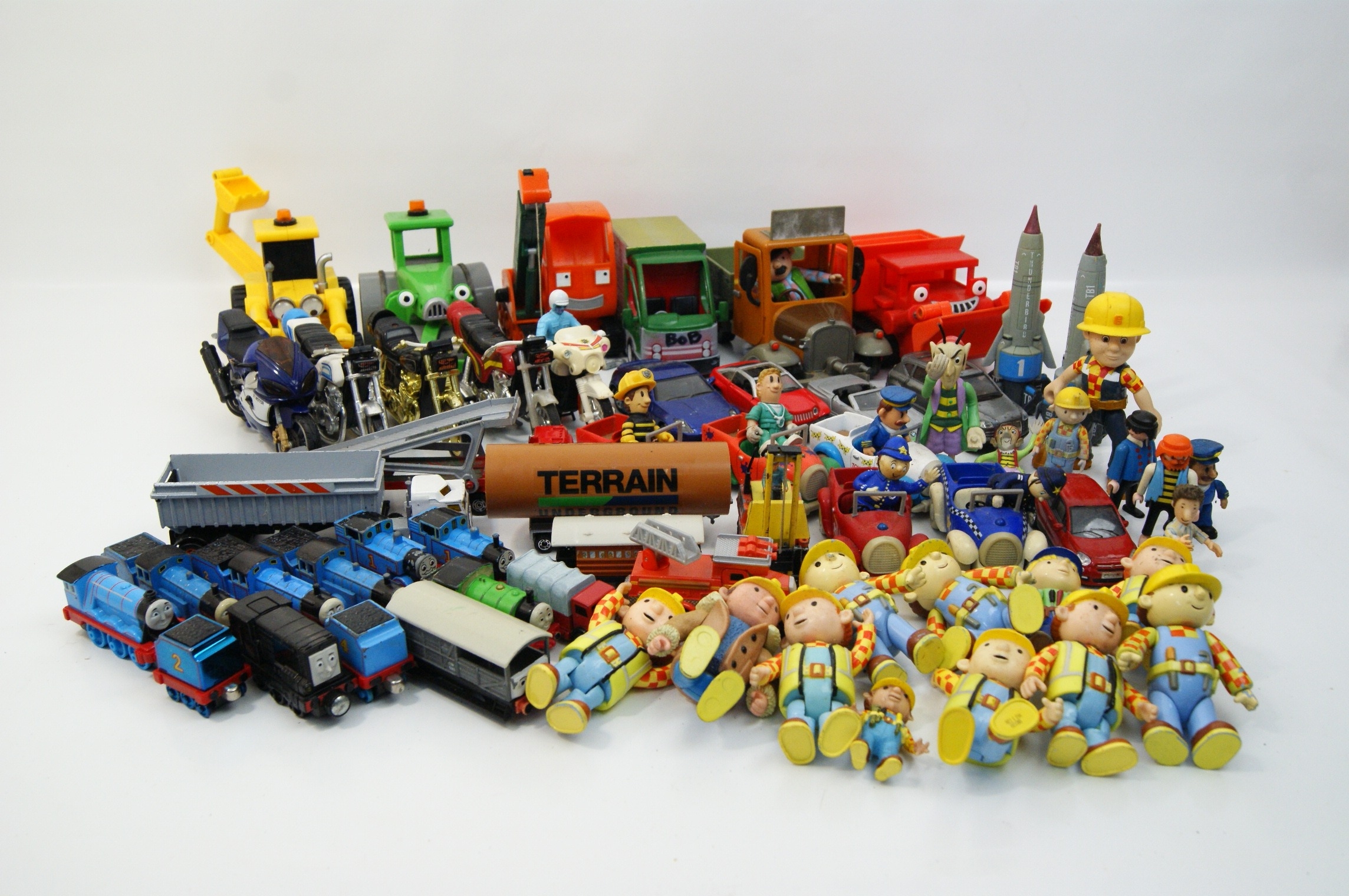 A collection of character figures and vehicles from various popular children’s franchises, primarily featuring Bob the Builder, Thomas & Friends, and Postman Pat. The assortment includes a variety of Bob the Builder figures in different outfits, Wendy figures, and character vehicles such as Scoop, Muck, Travis, Dizzy, and Lofty. The Thomas & Friends selection comprises several locomotives including Thomas, Edward, Gordon, Percy, and Diesel, alongside various items of rolling stock. Postman Pat is represented by figures of Pat and Ted Glen, together with Pat’s van and Ted’s truck. Additional items include a Thunderbird 1 rocket model, various unbranded toy cars, motorcycles, and smaller action figures. The items are constructed from moulded plastic and die-cast metal. Most vehicles are free-wheeling, while larger construction models feature manual articulation such as movable buckets and crane arms. Visible markings include embossed numbers 1, 2, and 4 on the Thomas locomotives, the text BoB on a green truck, and TERRAIN on a pipe accessory. These items are attributed to manufacturers such as Fisher-Price, Learning Curve, and Character Options.