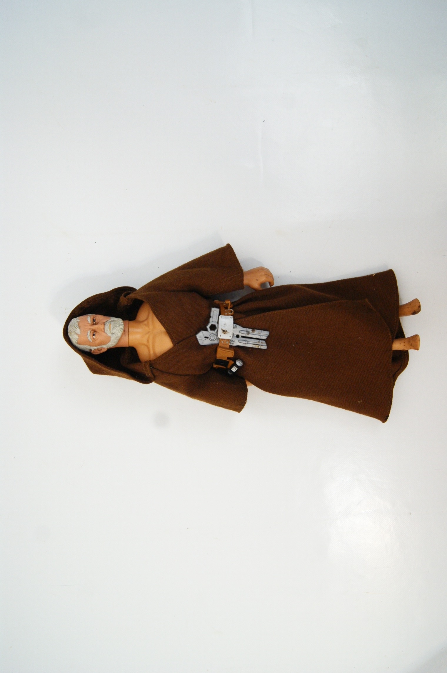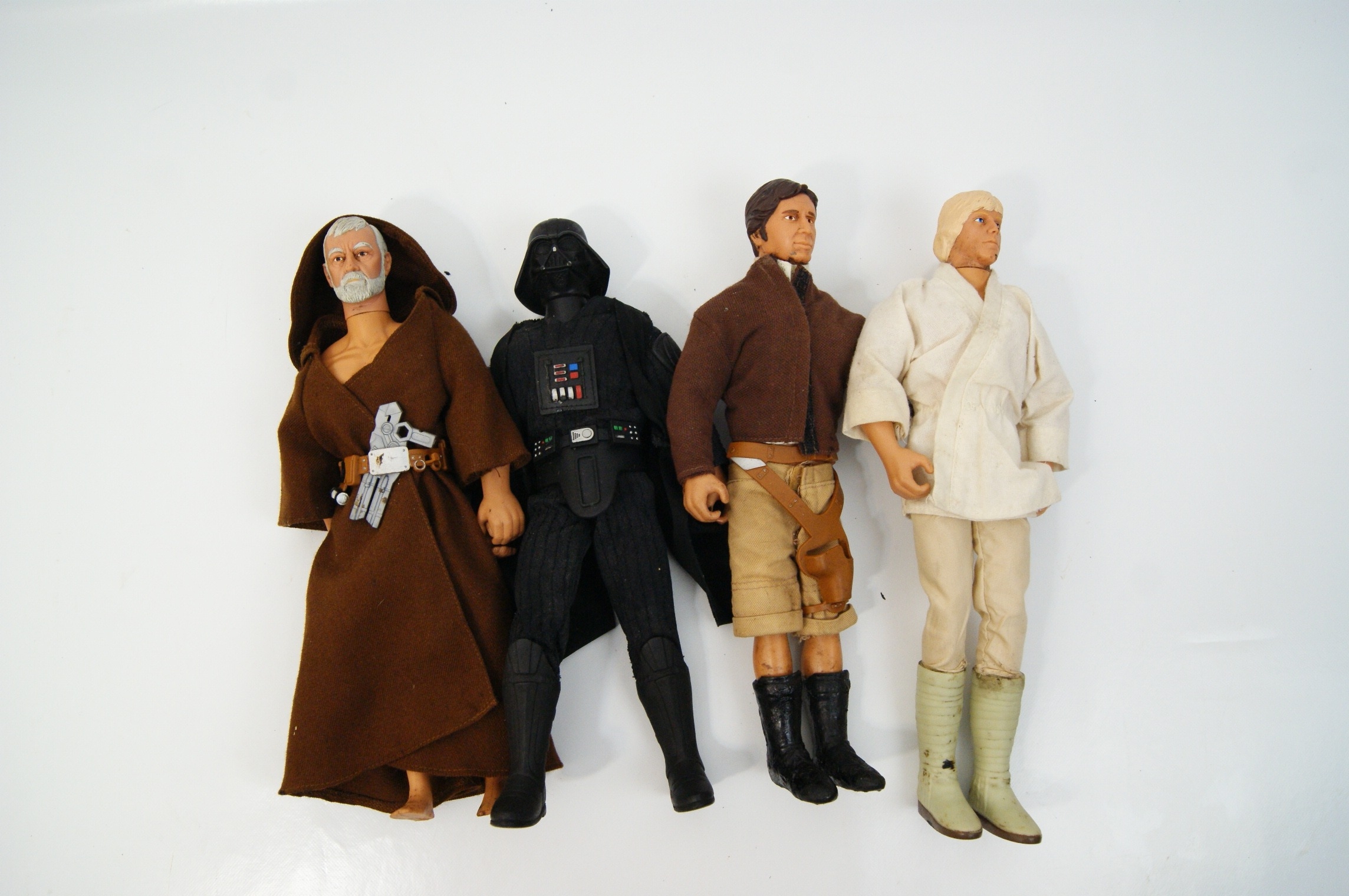 This collection features four articulated plastic action figures from the Star Wars franchise, attributed to the Kenner Large Size Action Figure series, circa 1978. The figures are designed at a 12-inch scale and feature articulated plastic bodies with removable fabric clothing. The collection includes Ben Obi-Wan Kenobi, dressed in a brown hooded fabric robe with a brown plastic belt featuring a grey electronic housing component; Darth Vader, wearing a black fabric suit and cape with plastic helmet, chest plate, and belt, notably featuring skin-toned plastic hands; Han Solo, in a brown fabric jacket and tan trousers with black plastic boots and a utility belt with holster; and Luke Skywalker, in a white fabric tunic and tan trousers with light-coloured plastic boots.