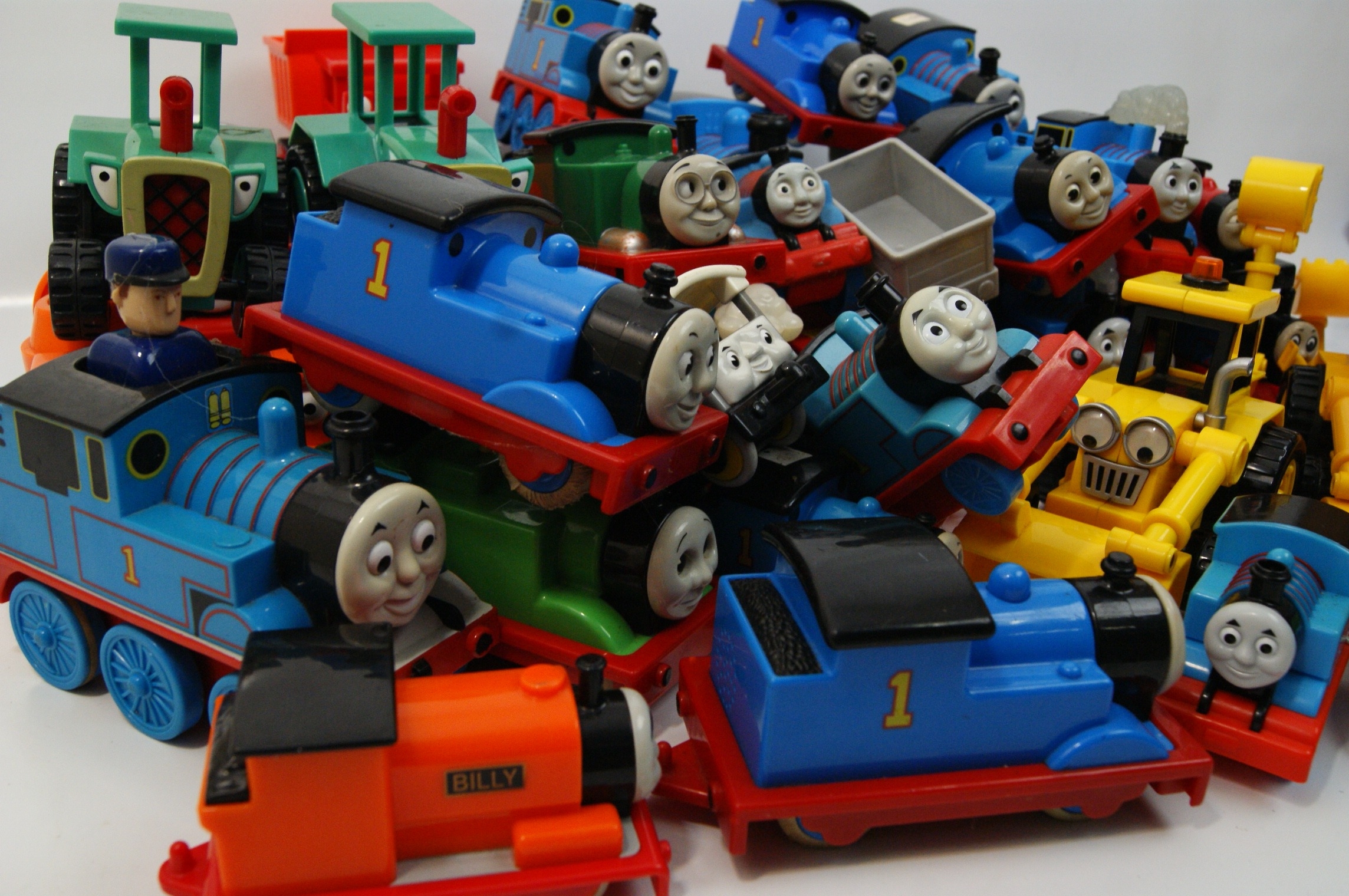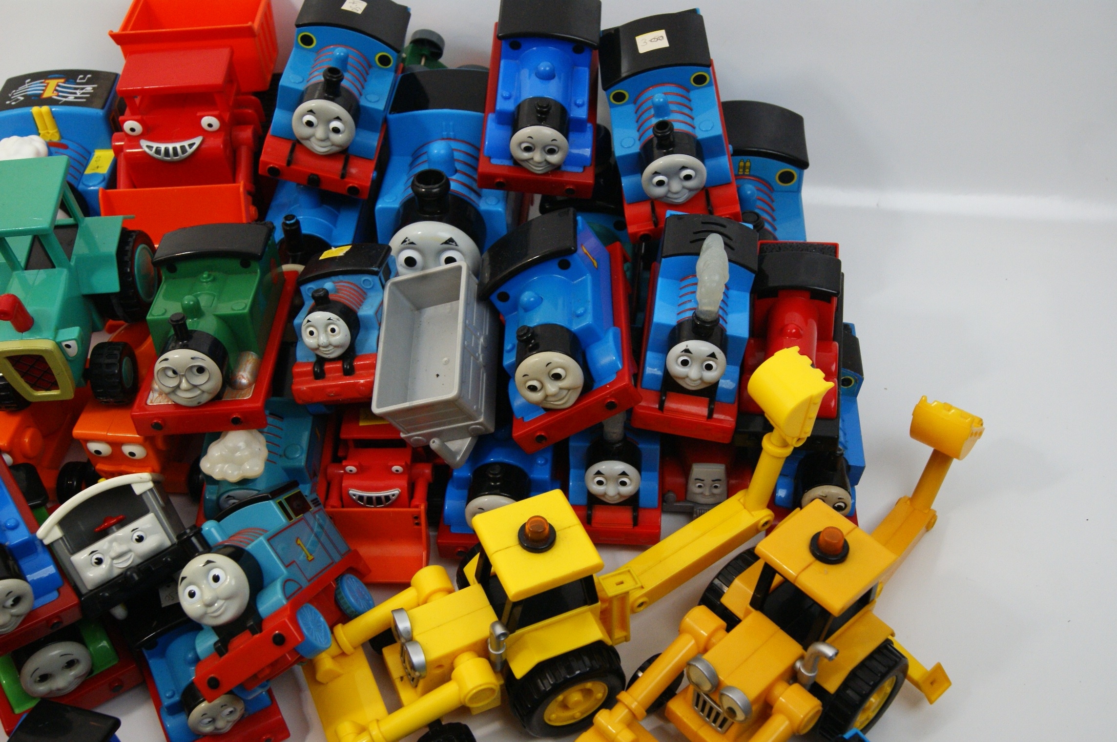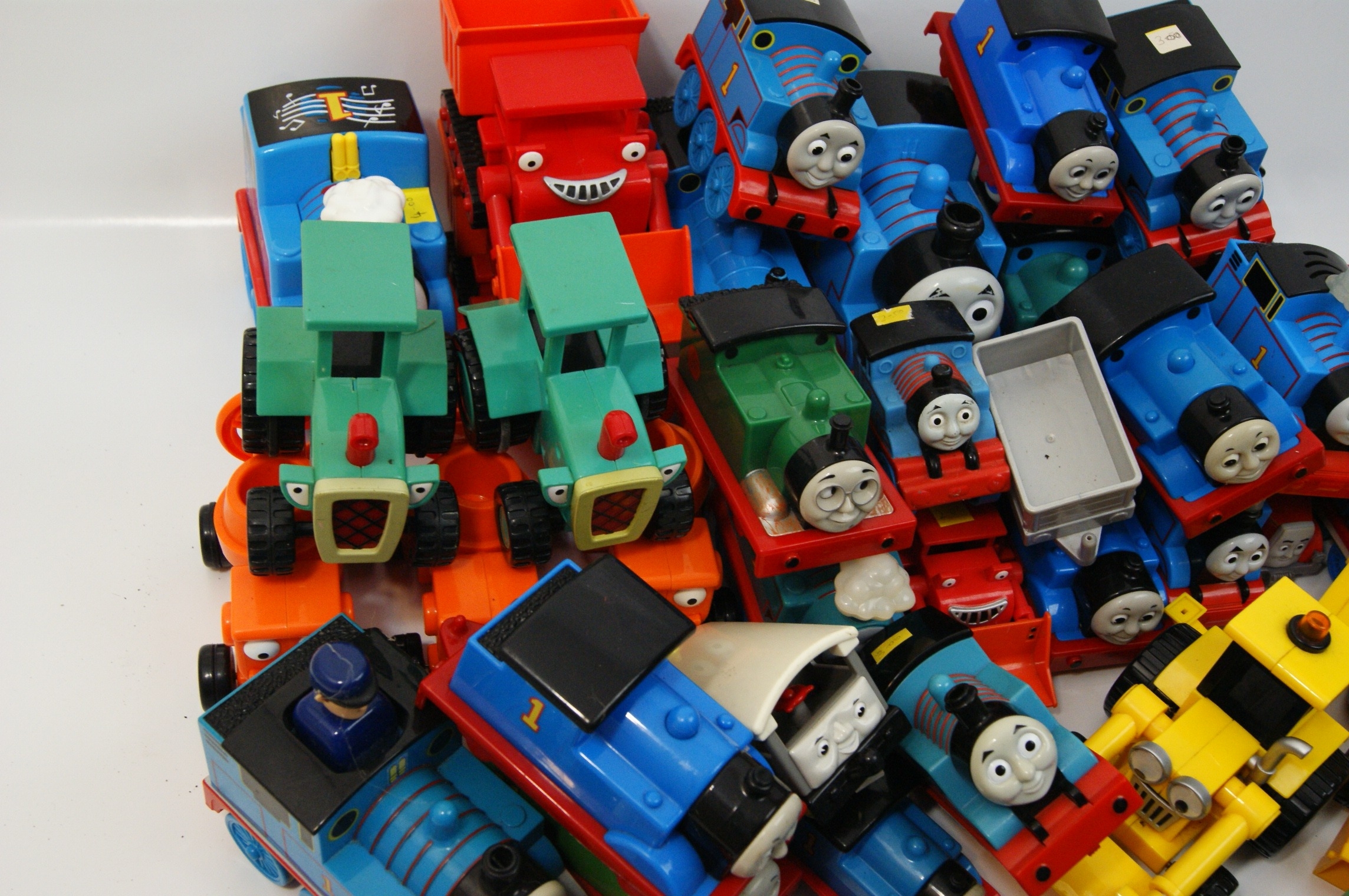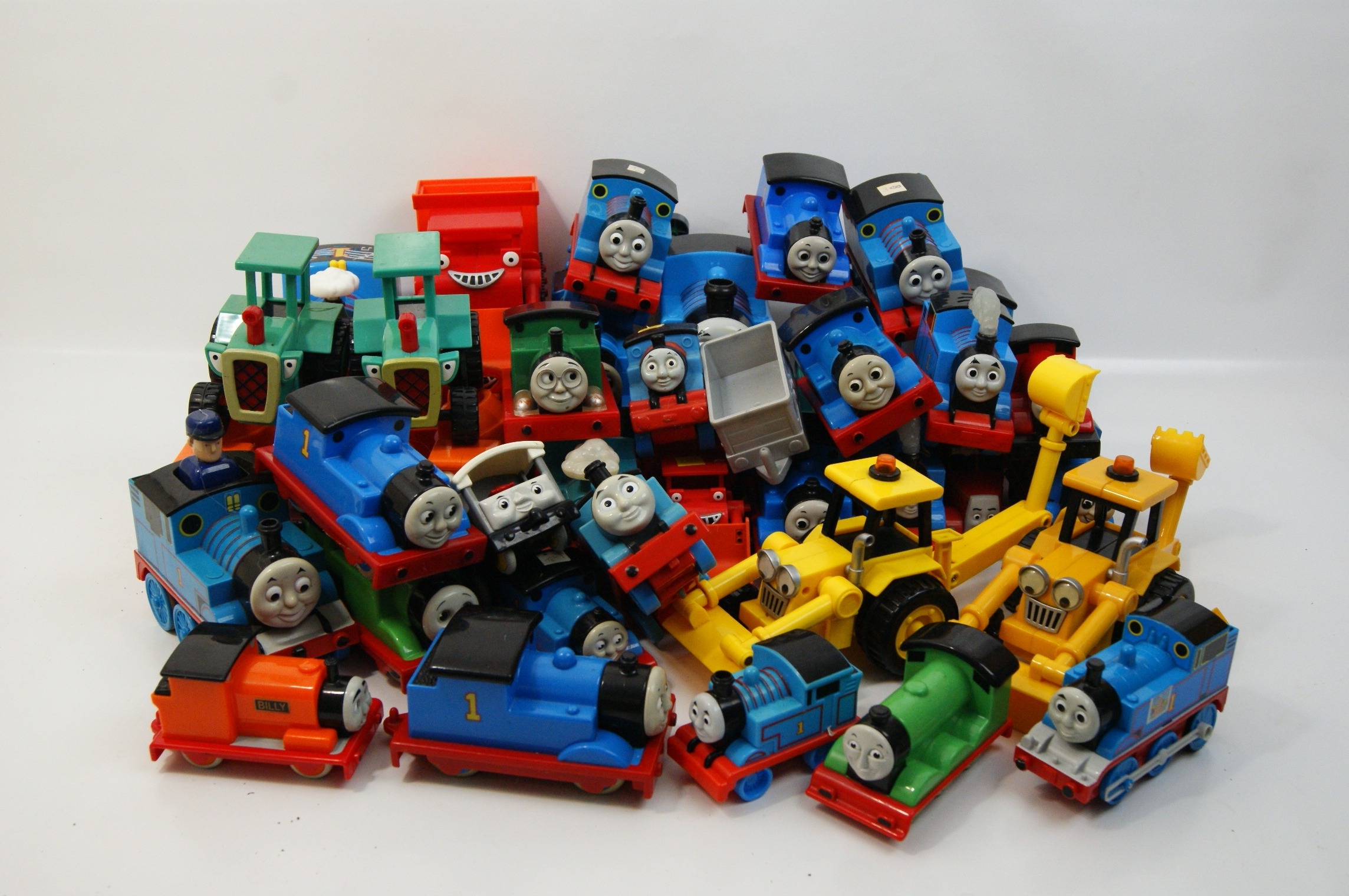 A collection of toy vehicles featuring characters from the Thomas & Friends and Bob the Builder television series. The lot comprises various iterations of Thomas the Tank Engine, including a model with musical notation graphics on the roof, alongside the characters Billy and Percy. The Bob the Builder series is represented by Scoop backhoe loaders, Muck dump trucks, and Travis tractors. The items are primarily constructed from coloured moulded plastic with metal axles and screws. Several engines incorporate battery compartments on the underside, indicating motorised or electronic capabilities. Visible markings include the name BILLY on the orange engine and the number 1 on the blue engines. One yellow construction vehicle bears a small white sticker with the numbers 3.00.