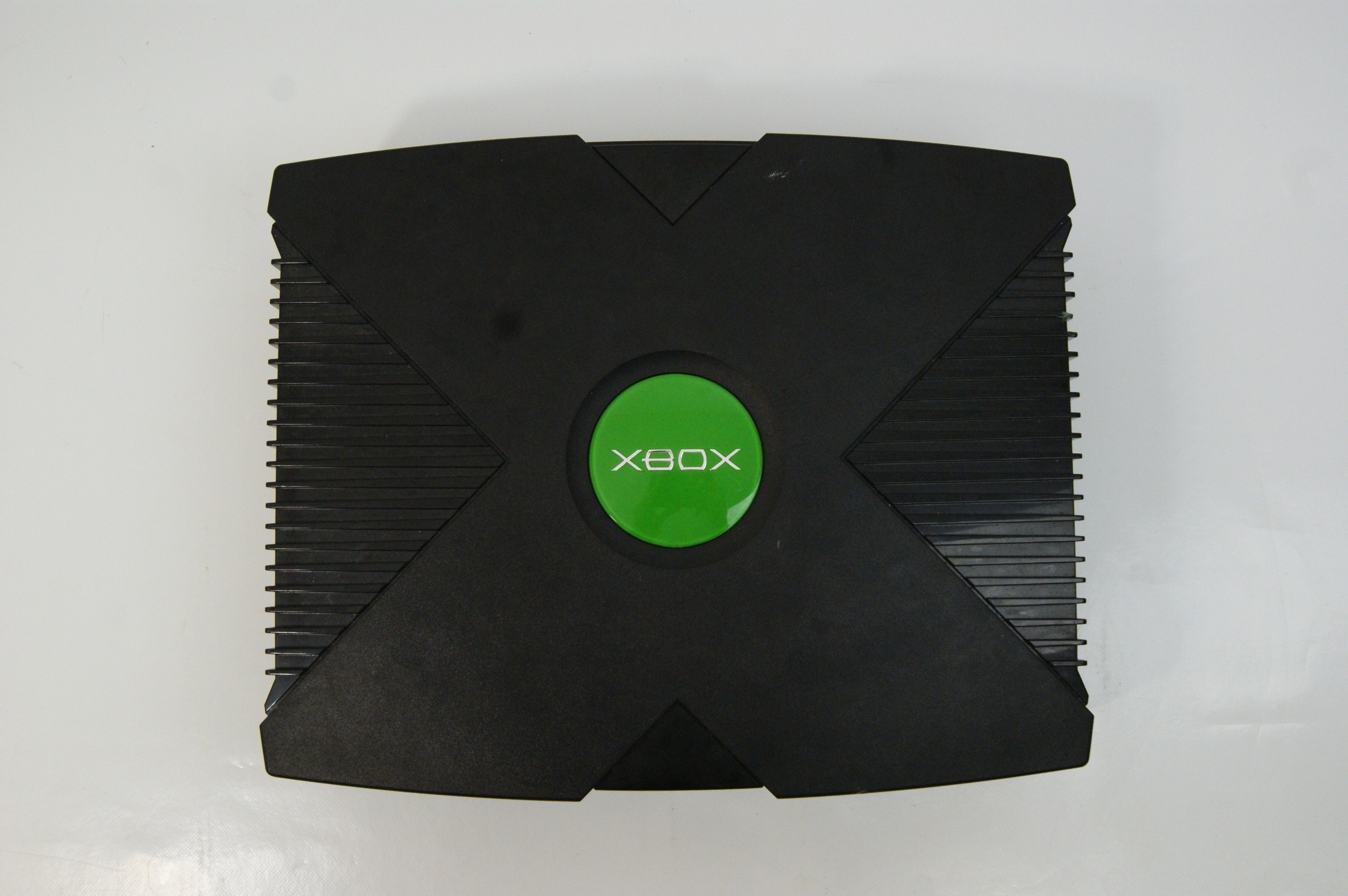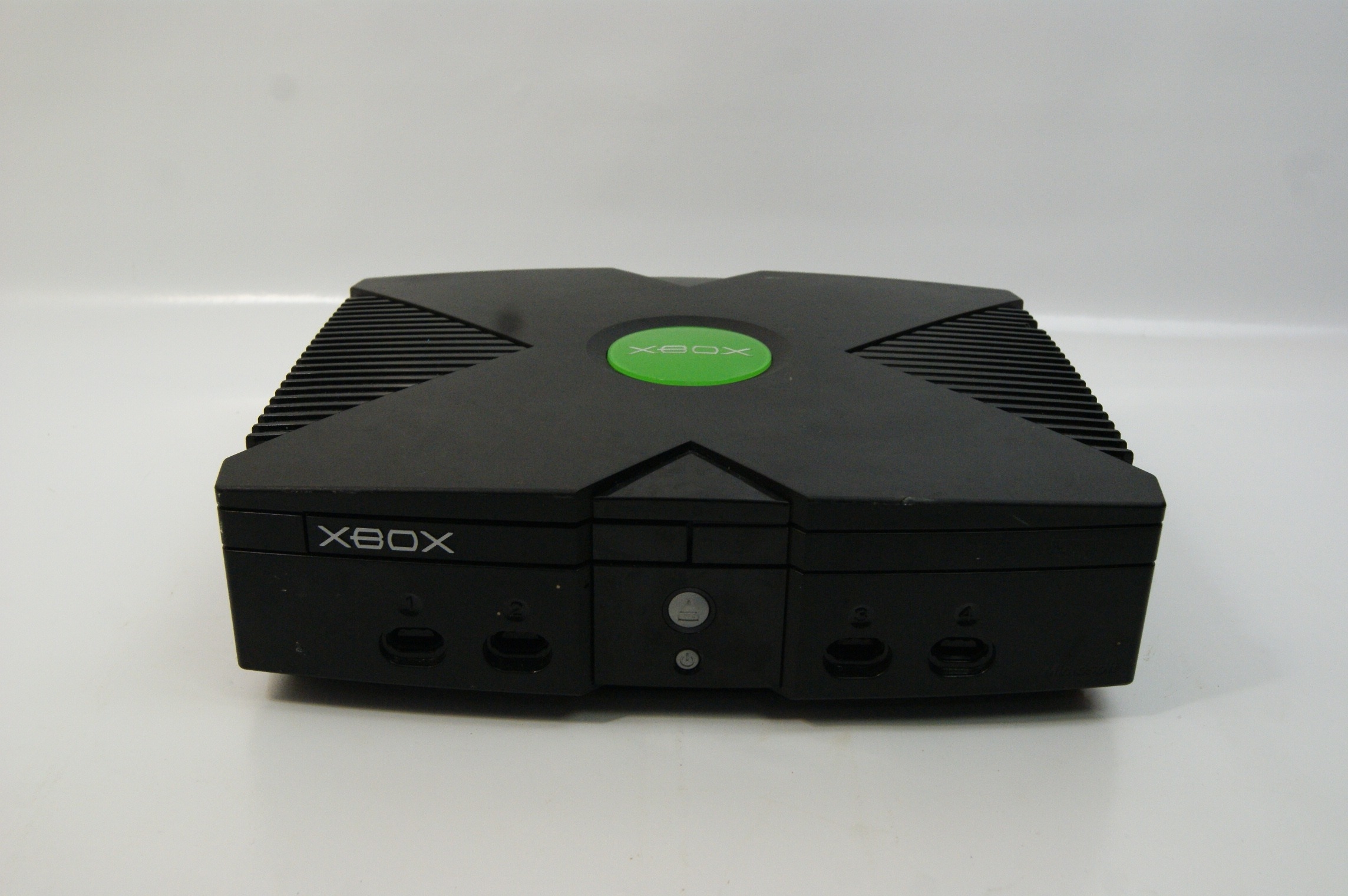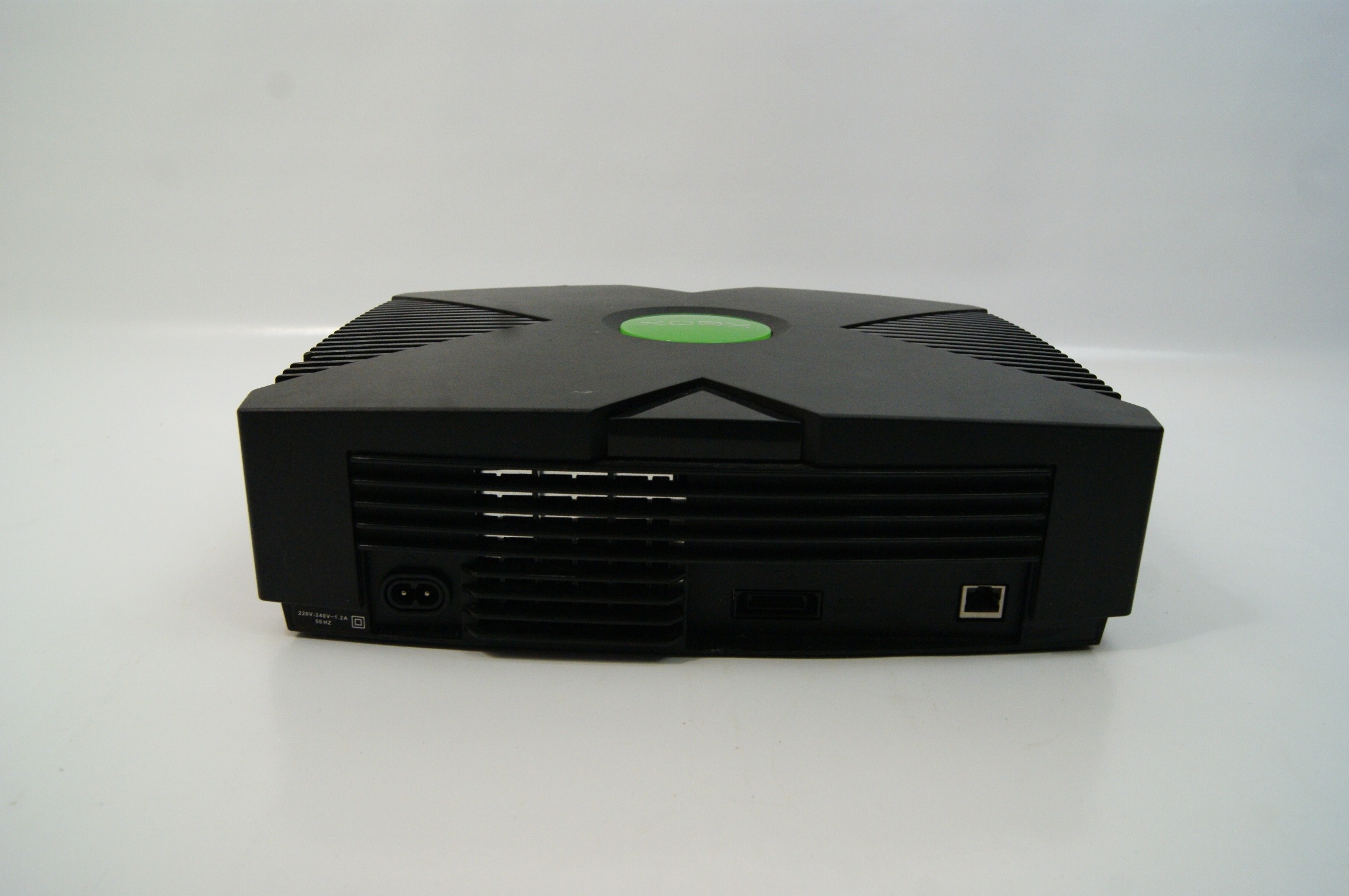 An original Microsoft Xbox video game console, identified by the Xbox branding on the top central green jewel and the front disc tray. This unit is a PAL region model, as indicated by the rear power specifications of 220V-240V ~ 1.2A 50 Hz, suitable for use in the United Kingdom. The standard hardware specifications for this model include an Intel Pentium III-based 733 MHz processor, 64 MB of RAM, and an internal hard disk drive. The rear of the unit features a standard power socket, an audio-visual output, and an Ethernet port for networking. No serial number is visible as the manufacturer label on the base is not shown. The data wiping status of the internal hard drive has not been verified. This lot consists of the console unit only and does not include power cables, AV cables, or controllers.