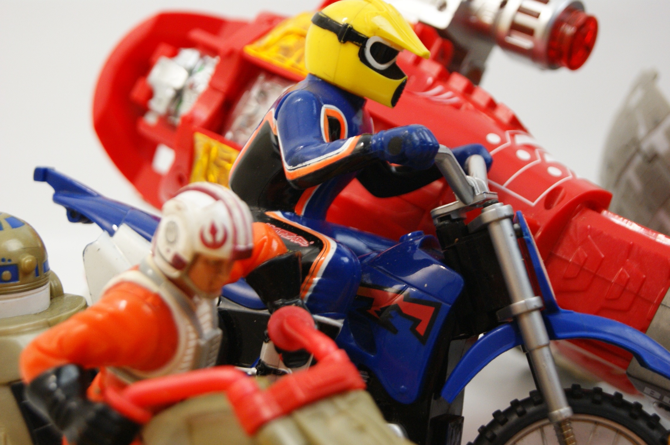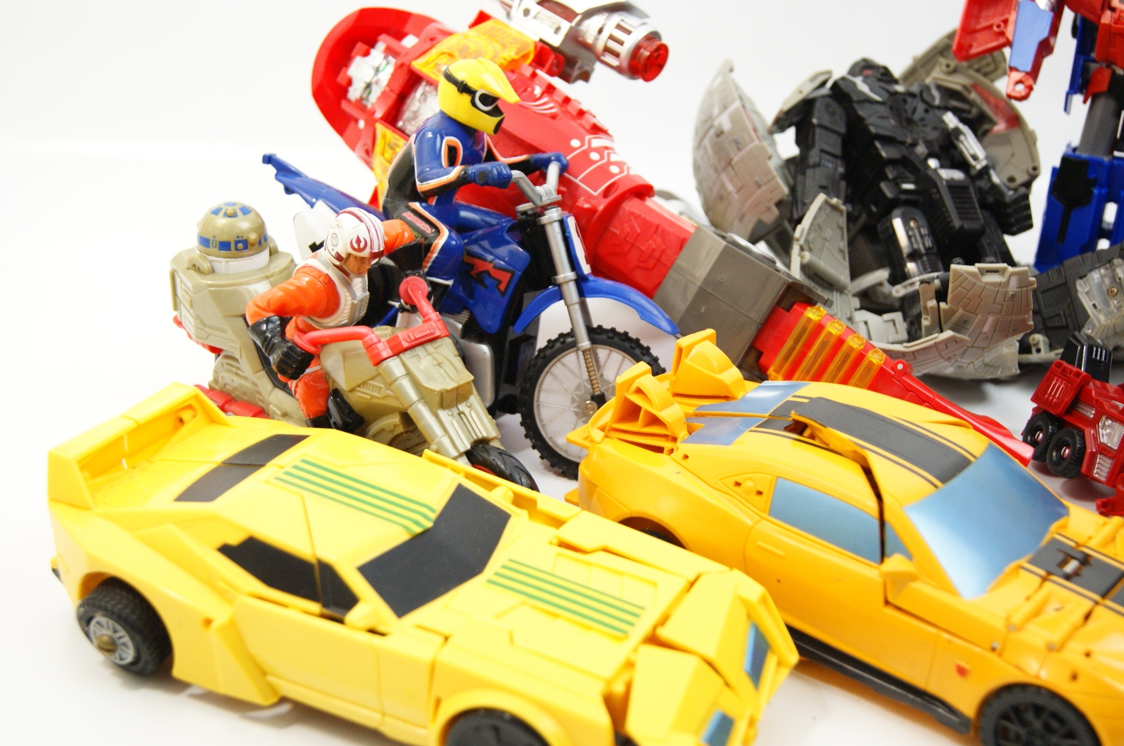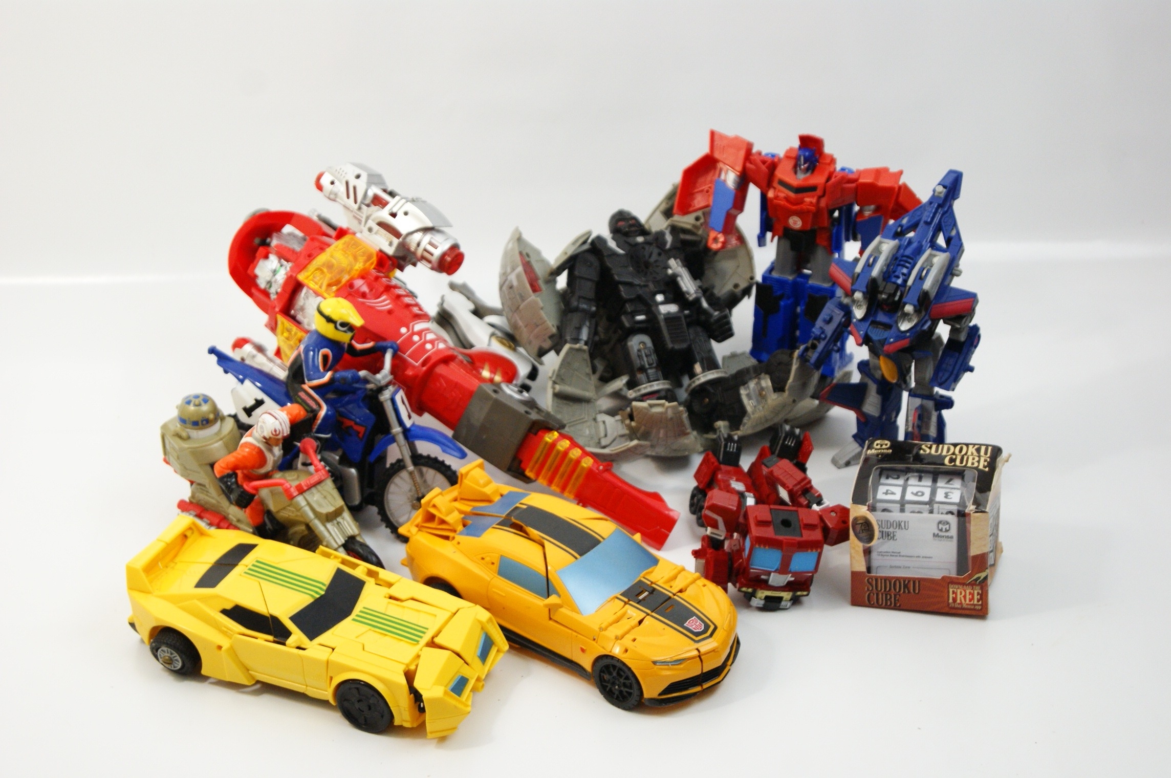 An assortment of moulded plastic action figures, toy vehicles, and a boxed puzzle. The collection features several Transformers figures attributed to Hasbro, including two yellow sports cars in the style of Bumblebee, one with black racing stripes and an Autobot-style symbol, and another with green stripes. The group also includes a large red and blue robot in the style of Optimus Prime, a smaller red and black truck-based robot, a blue jet-style robot with purple wing insignia, and a black and grey robot within a grey plastic shell. The Star Wars items comprise a plastic speeder bike with a Luke Skywalker figure in X-Wing pilot gear and an R2-D2 figure. Additional items include a blue and red plastic motocross motorcycle with a rider in a blue and orange suit, and a large red and silver plastic toy. The lot includes a boxed Mensa Sudoku Cube puzzle, featuring the Mensa High IQ Society logo and a 70th Anniversary gold seal.