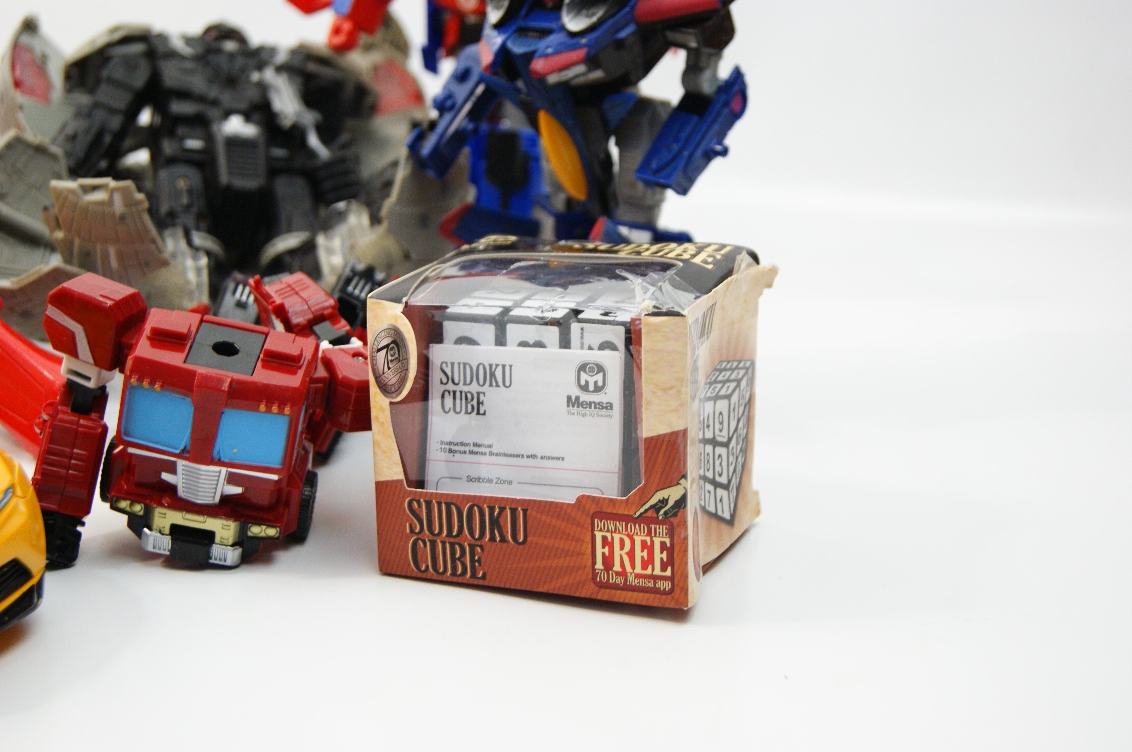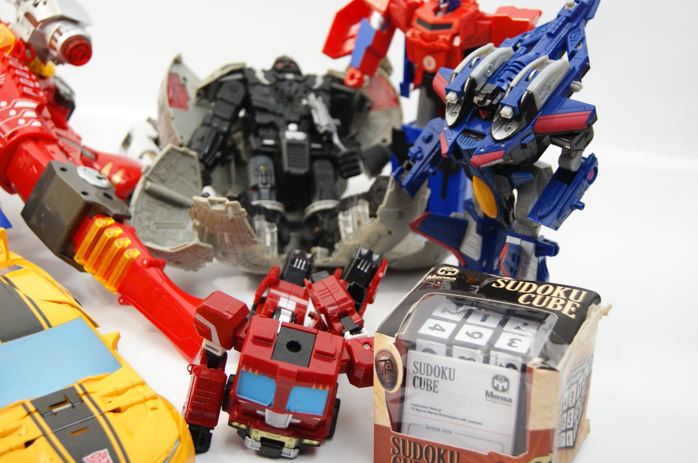 A Collection of Modern Action Figures and Toys including Hasbro Transformers, Star Wars, and Mensa Sudoku Cube