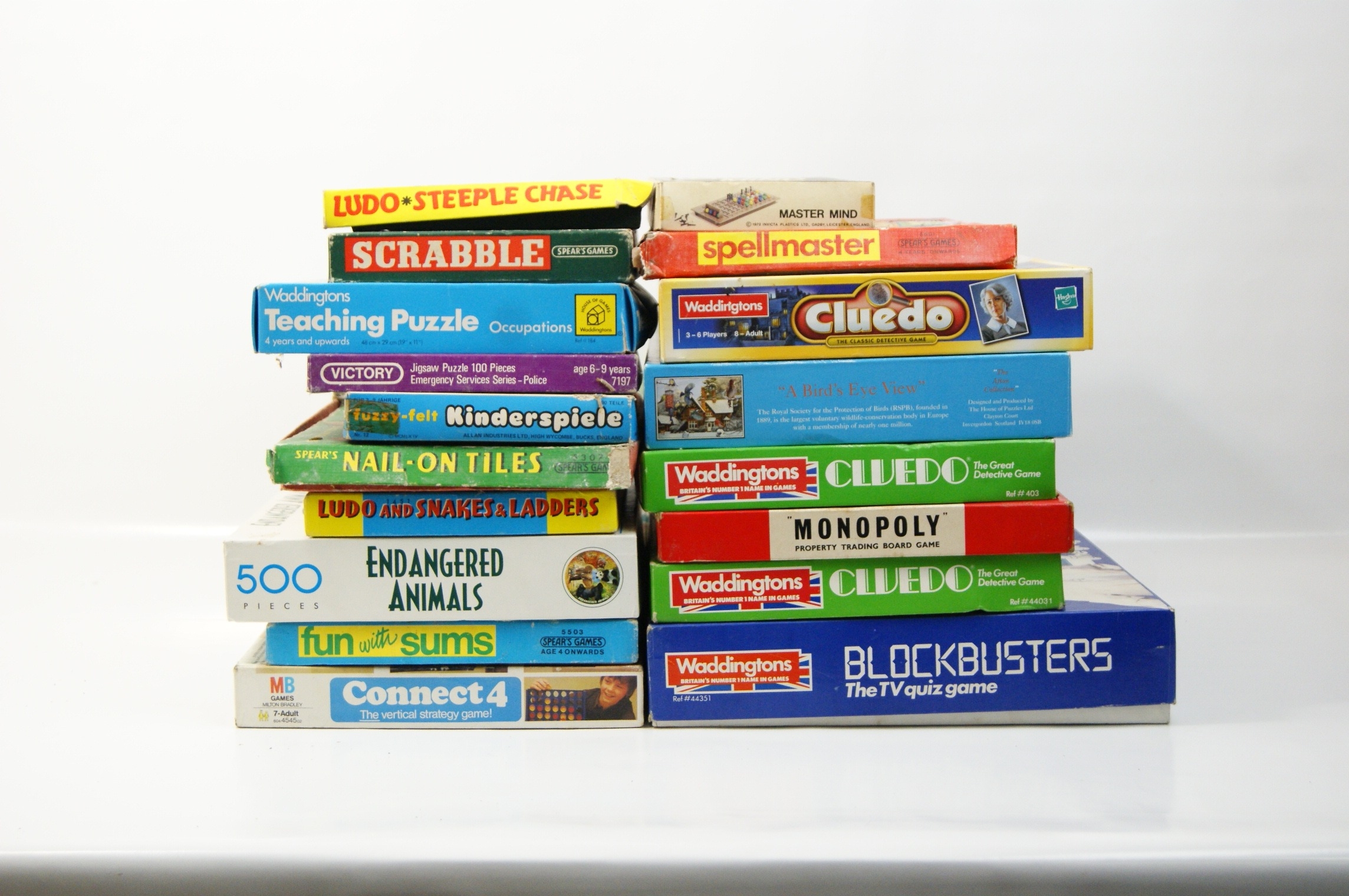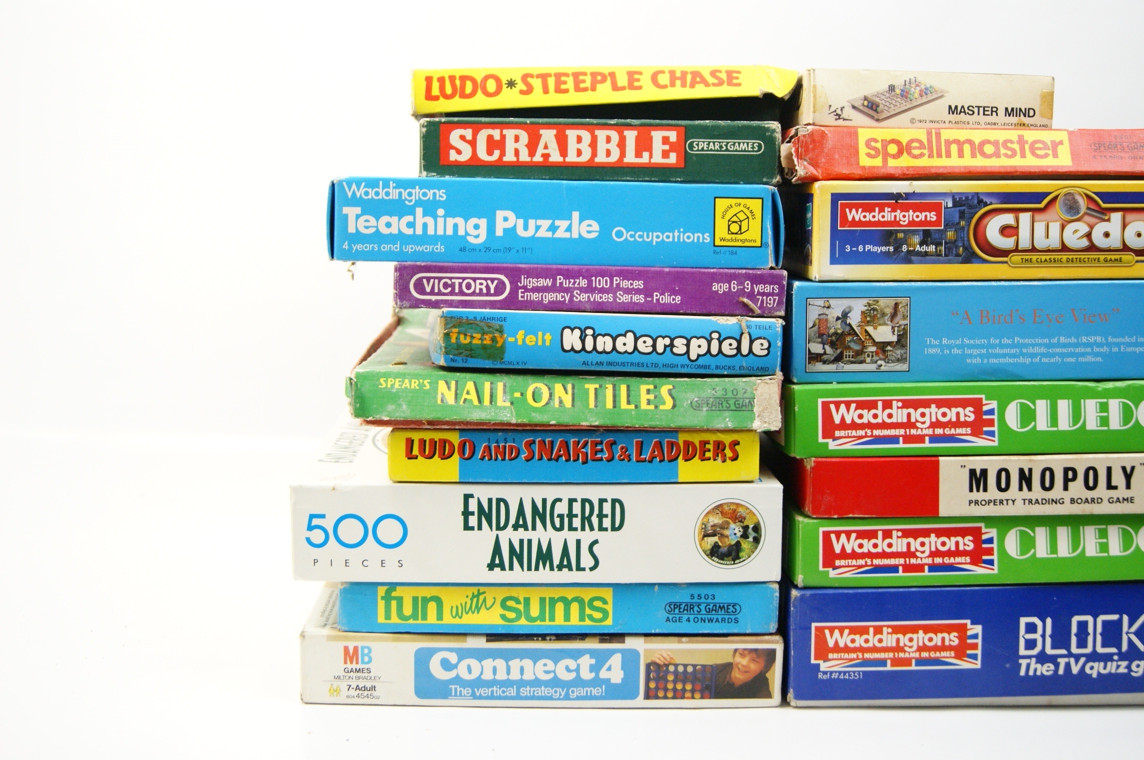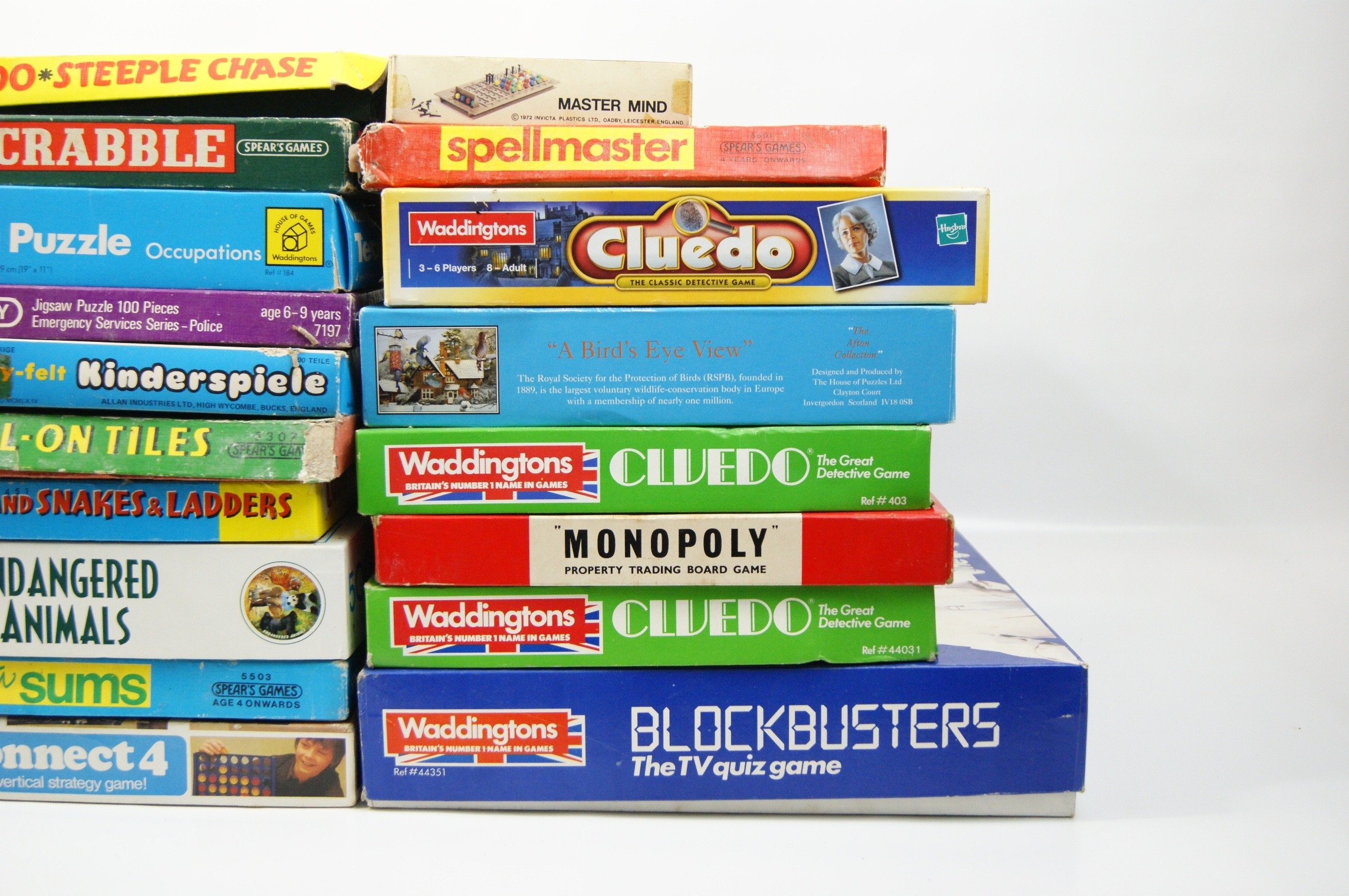 A collection of approximately 18 vintage board games and jigsaw puzzles, primarily from British manufacturers. The assortment includes several titles by Waddingtons and Hasbro, such as multiple editions of Cluedo, Monopoly, and Blockbusters. Spear’s Games titles include Scrabble, Spellmaster, Nail-On Tiles, and Fun with Sums. Also present are Connect 4 by MB Games, Master Mind by Invicta Plastics Ltd, Fuzzy-felt Kinderspiele by Allan Industries Ltd, and a Victory 100-piece jigsaw puzzle from the Emergency Services Series. Further items include A Bird’s Eye View 500-piece jigsaw by The House of Puzzles Ltd, an Endangered Animals 500-piece jigsaw, a Waddingtons Teaching Puzzle (Occupations), and various sets for Ludo, Snakes and Ladders, and Steeple Chase. The games are housed in their original printed cardboard boxes and contain components such as cardboard boards, plastic or wooden playing pieces, card decks, and paper instruction leaflets.