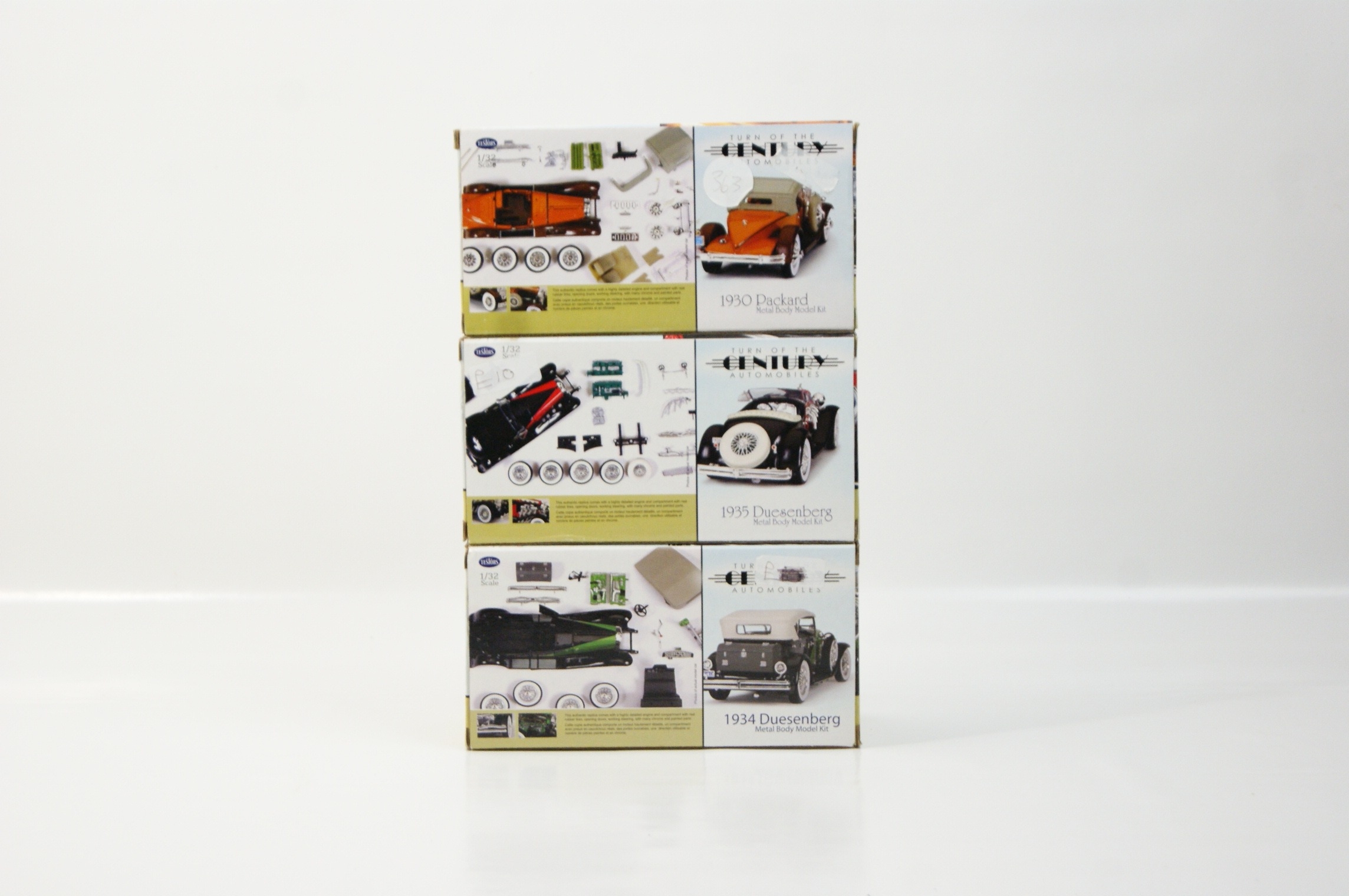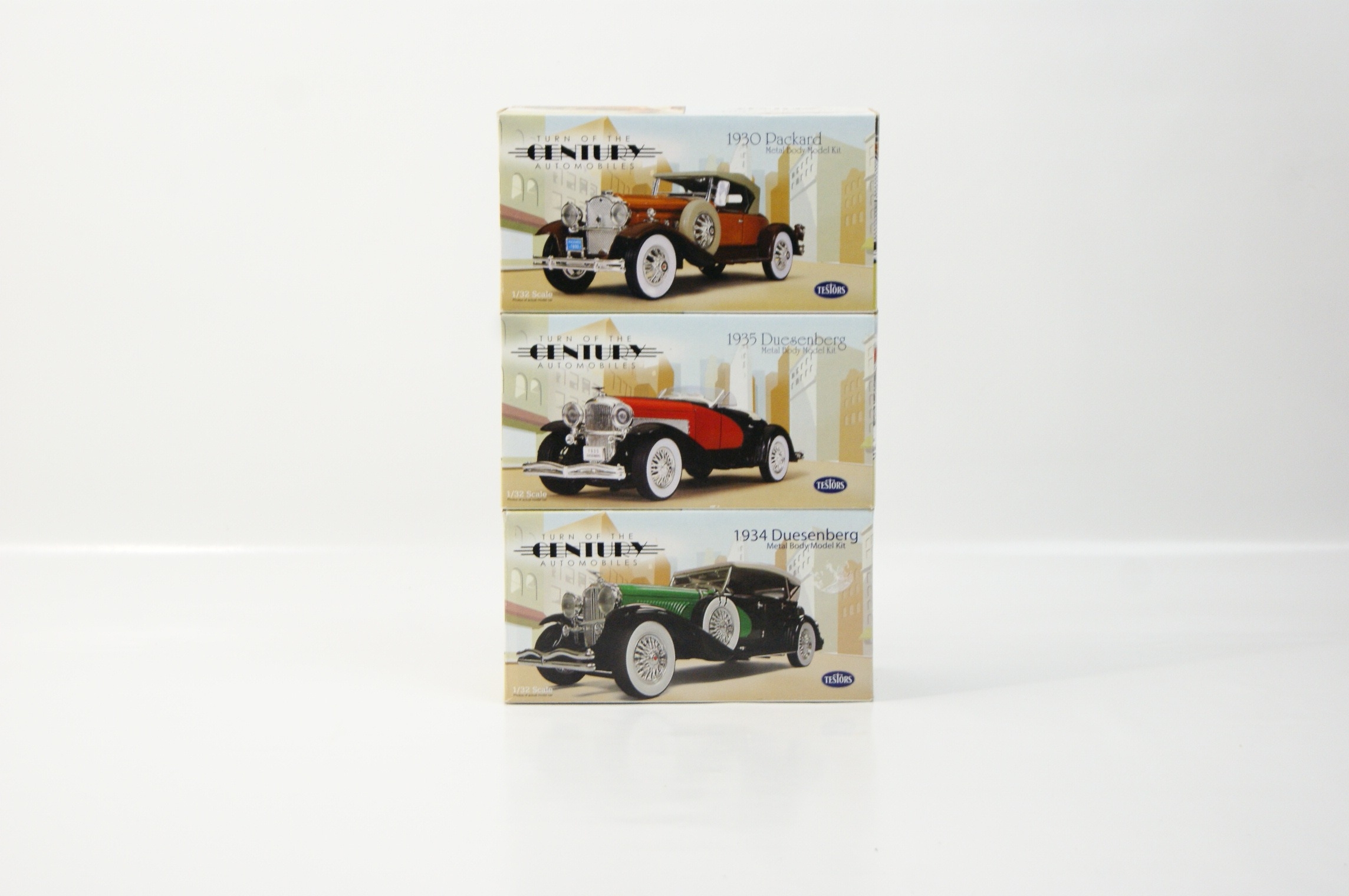 A trio of 1/32 scale model car kits manufactured by Testors as part of the Turn of the Century Automobiles series. The collection comprises three specific classic vehicle models: a 1930 Packard, a 1934 Duesenberg, and a 1935 Duesenberg. Each kit is constructed with a metal body and includes various plastic and rubber components. The packaging indicates that the completed models feature detailed engines, opening hoods, and working steering. The kits are contained within their original colour-illustrated boxes, which display the Testors blue oval logo and provide visual representations of the unassembled parts and the finished automobiles.