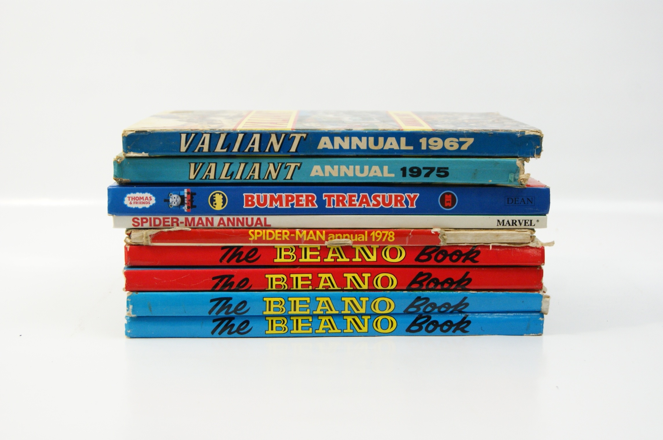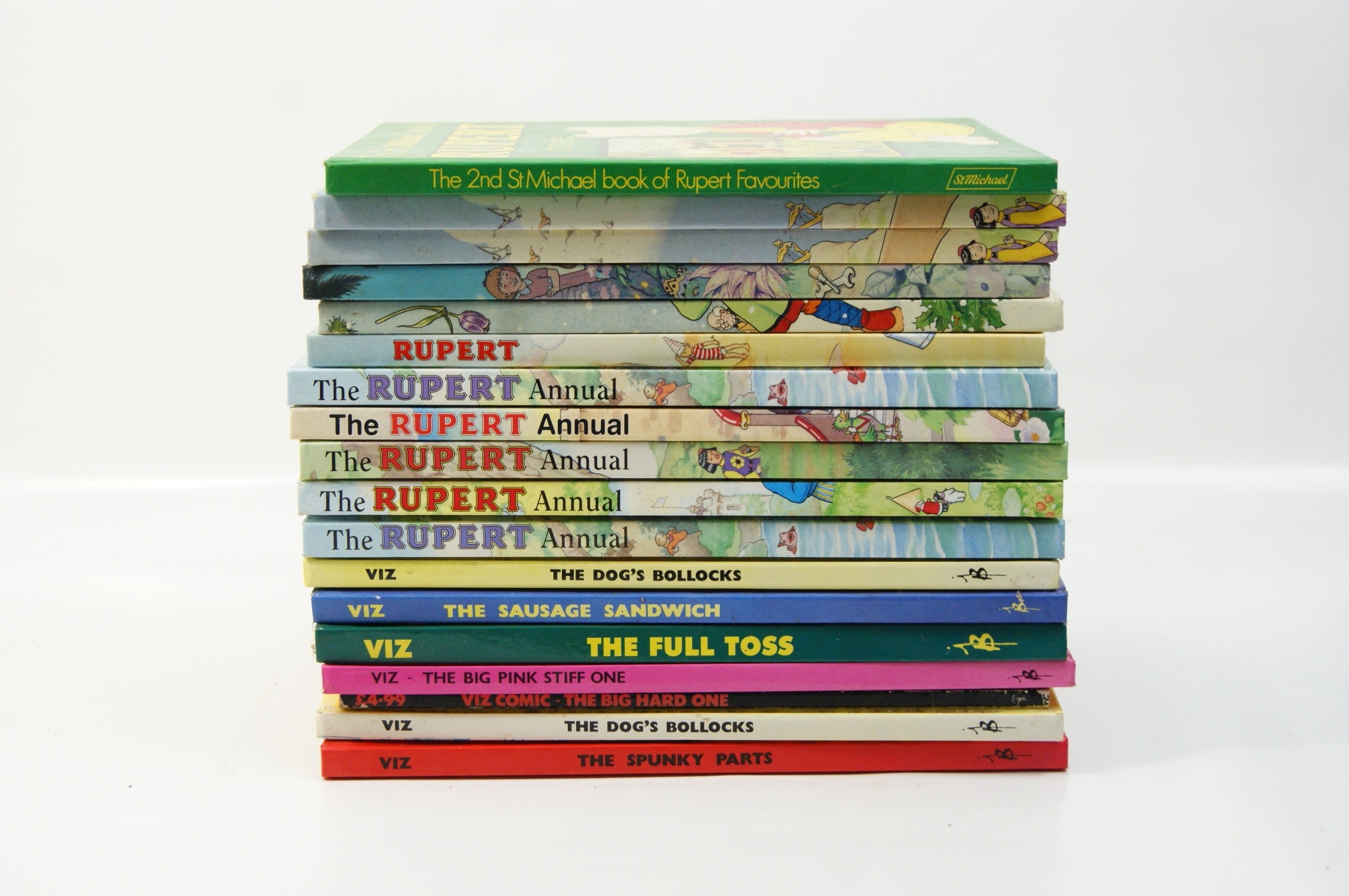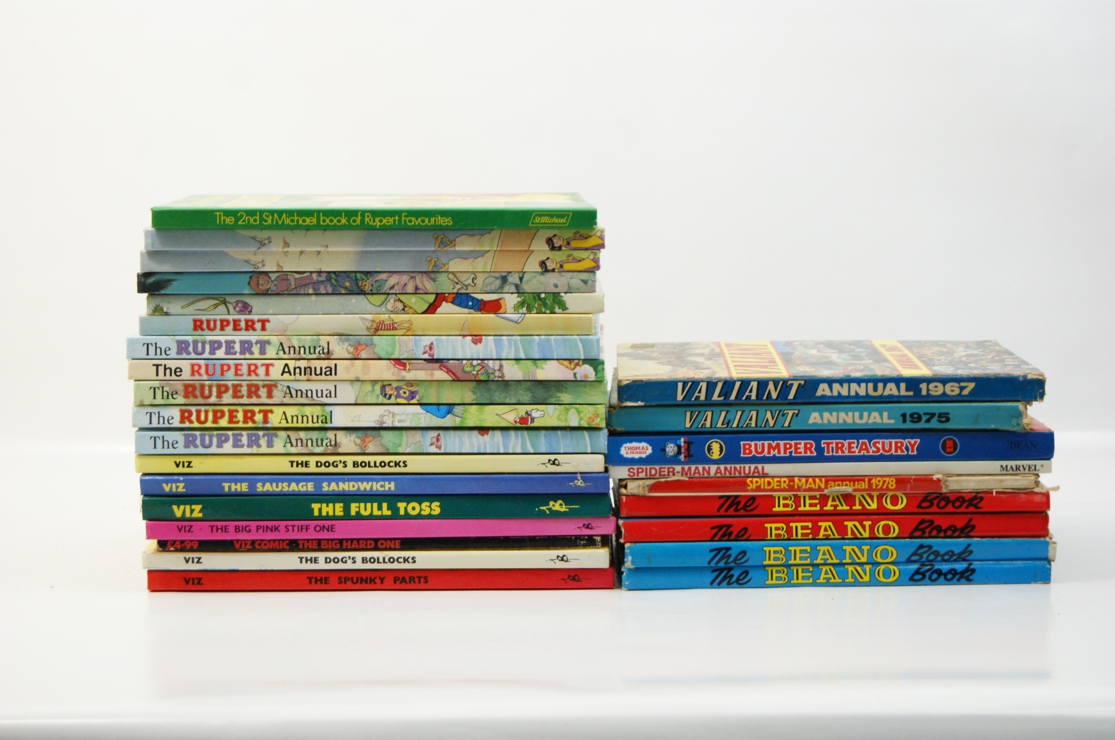 Mixed collection of comic and annual books including several Rupert Annuals, Viz books, Beano books, Spider-Man Annual 1978, Valiant Annuals (1967 and 1975) and a Thomas & Friends Bumper Treasury. Also includes St Michael Rupert favourites books. A varied lot of classic British comics and humour books featuring popular characters and titles.