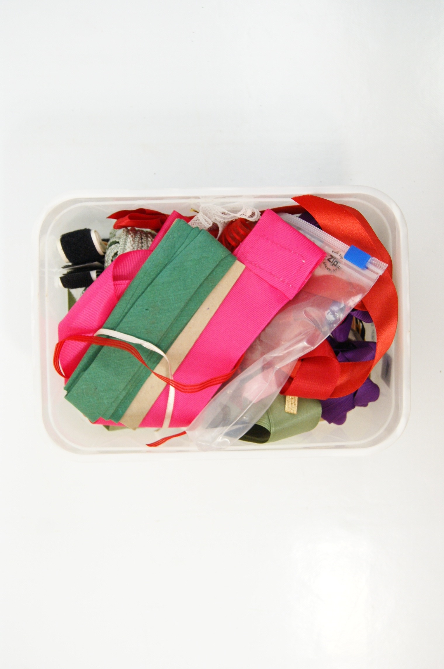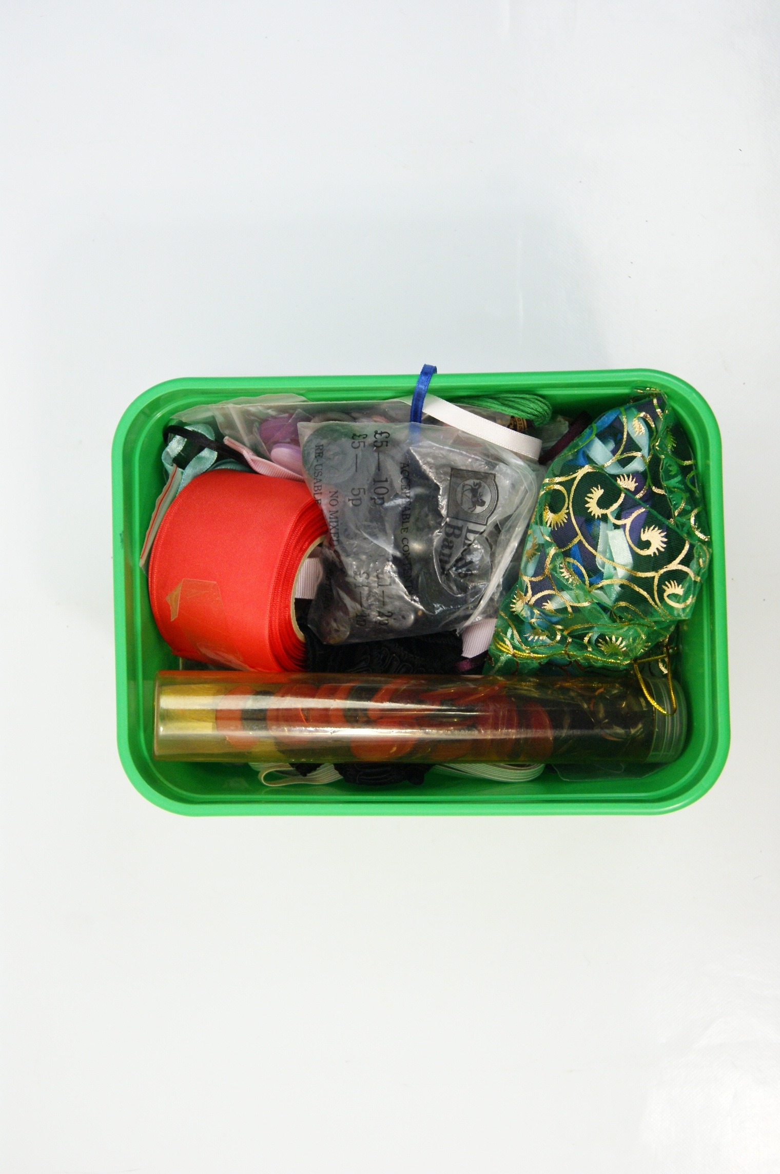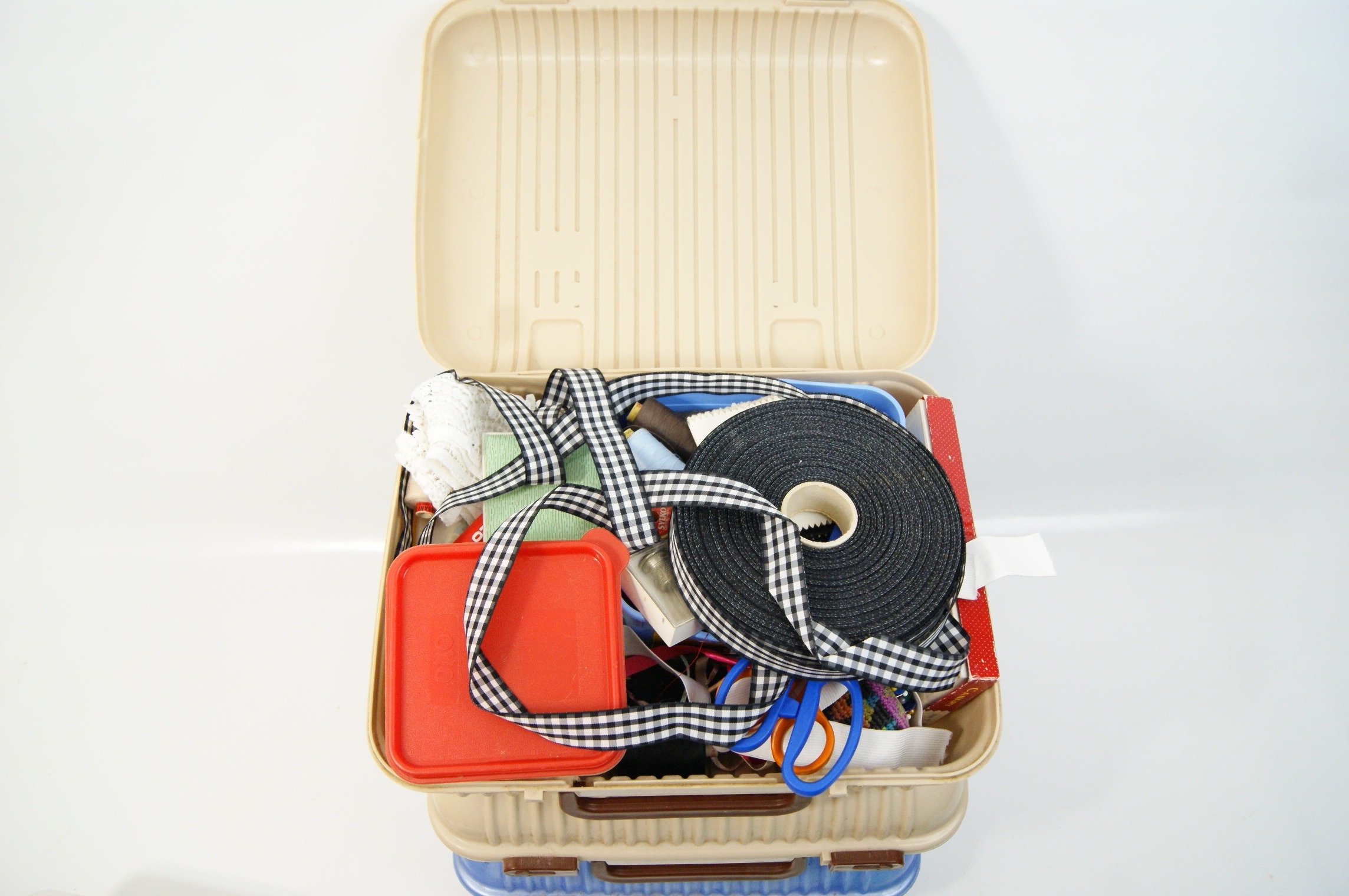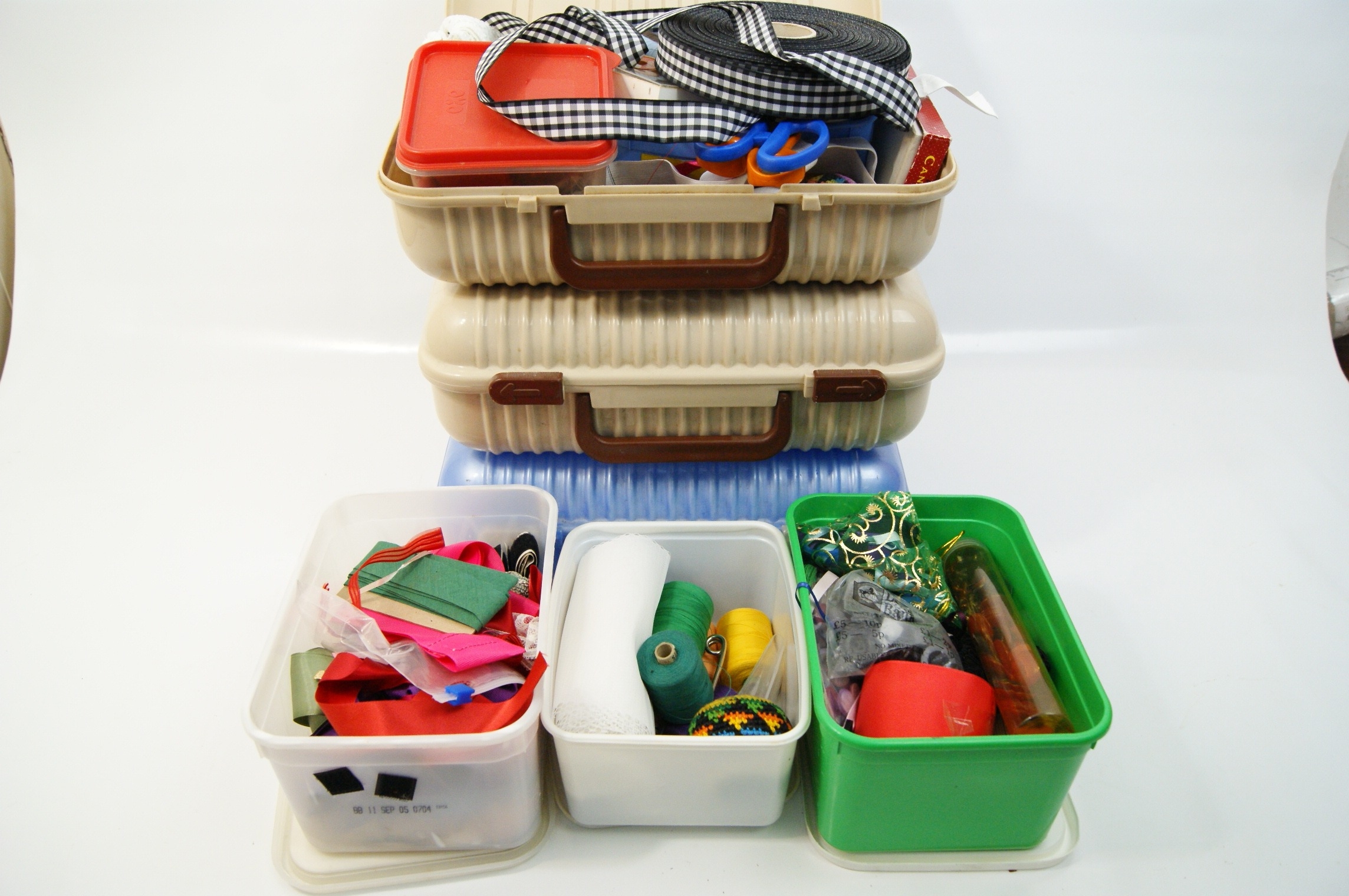 A collection of vintage-style haberdashery and sewing supplies housed within six plastic storage containers. The storage includes three vanity-style cases, two in beige and one in translucent blue, alongside three smaller plastic tubs in white and green. The contents comprise an assortment of craft materials including multiple spools of sewing thread in various colours such as green, yellow, and purple. Also included are various ribbons, featuring a large roll of black and white gingham check, and lengths of red, green, and pink ribbon. The lot further contains fabric remnants, lace trimmings, a knitted pincushion, a pair of small scissors with blue plastic handles, and a quantity of buttons and fasteners. One white plastic tub bears a printed date stamp of 11 September 2005. A small plastic storage bag within the collection is marked with the Lloyds Bank logo.