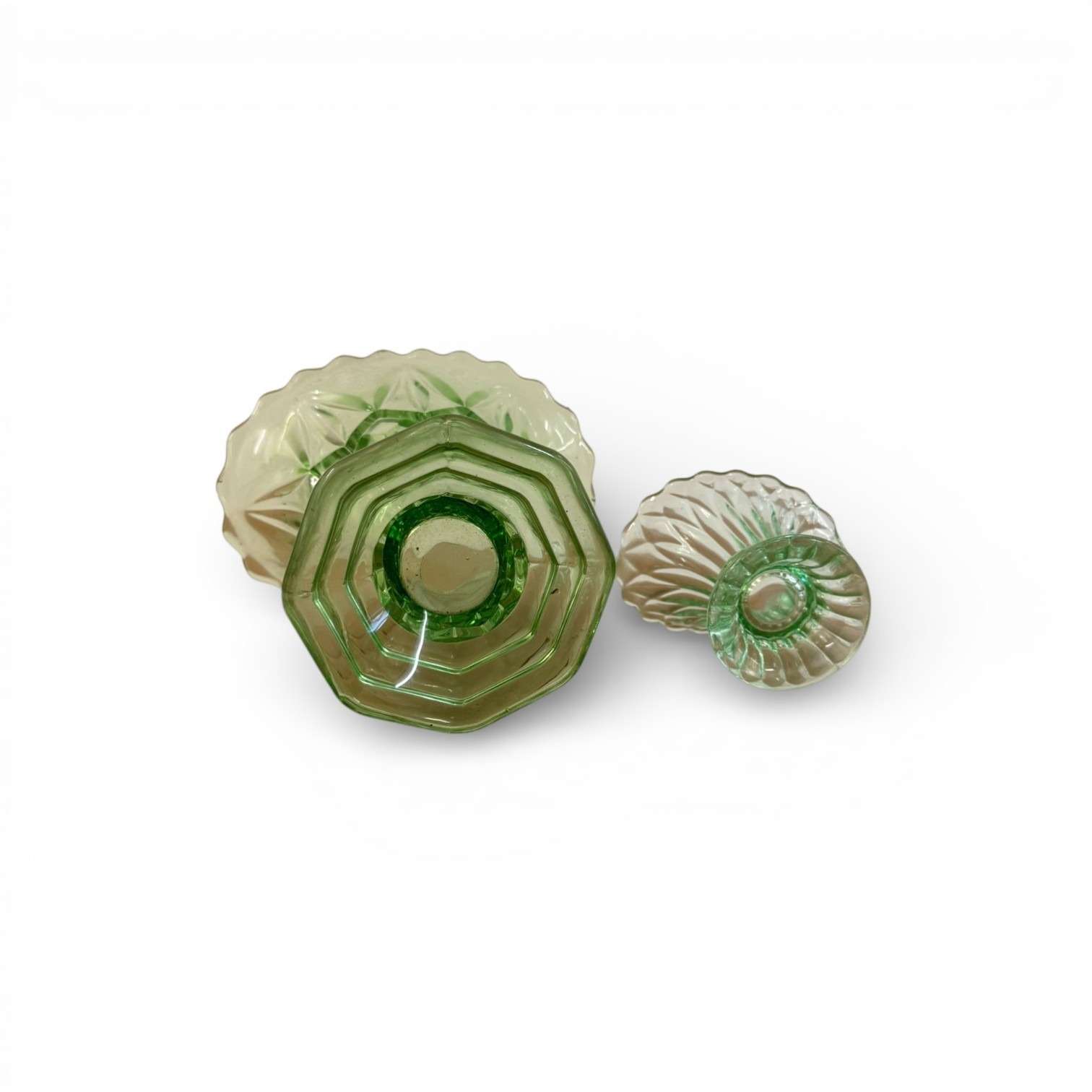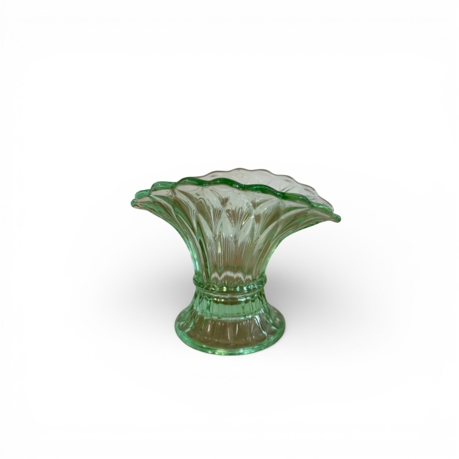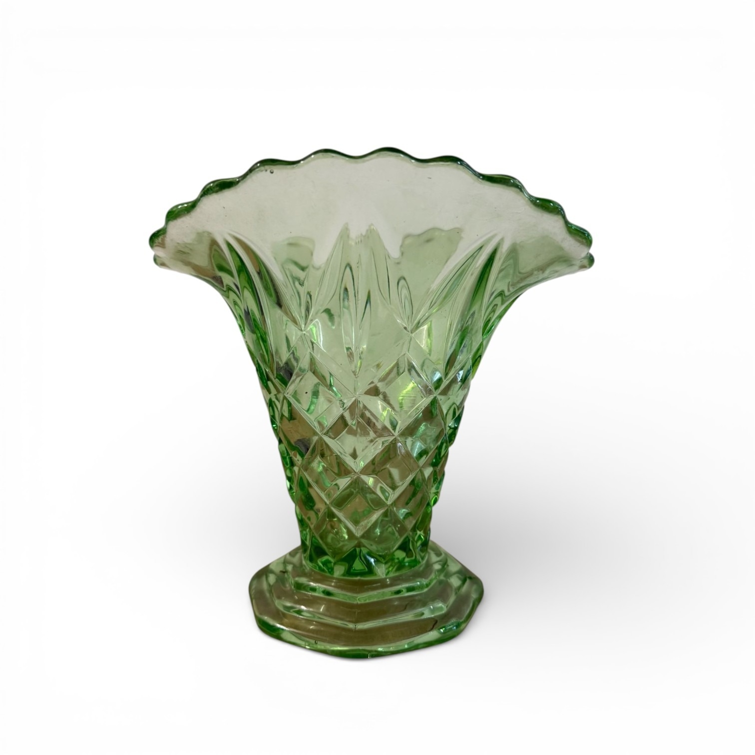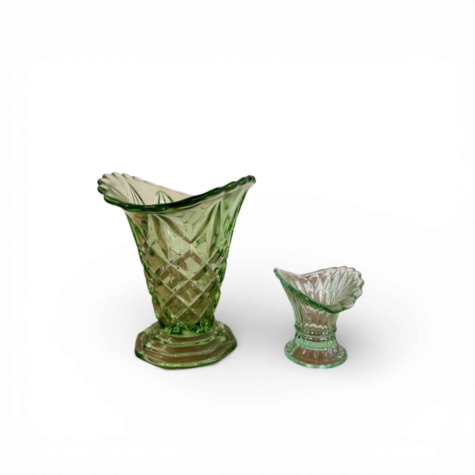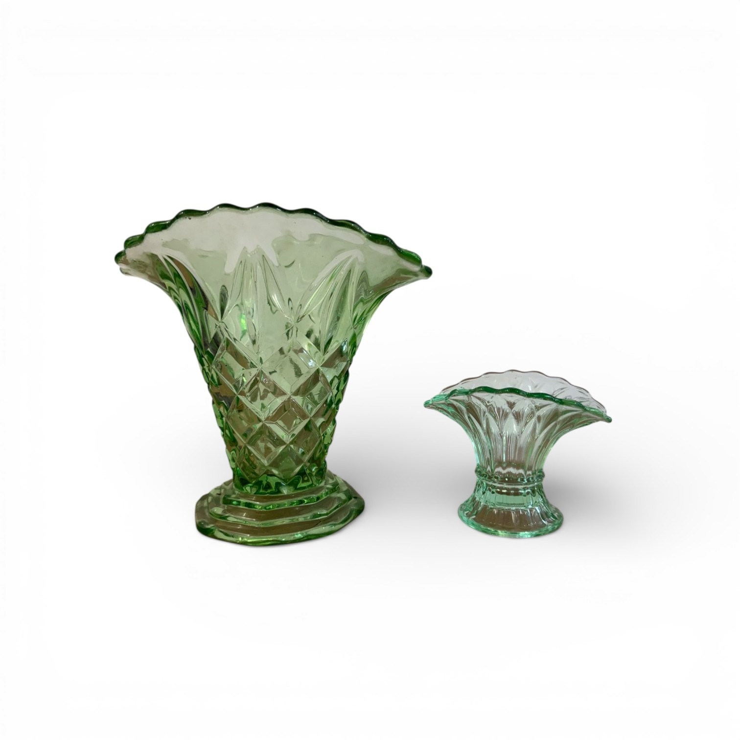 A Pair of Likely Bagley Green Pressed Glass Posy Vases
