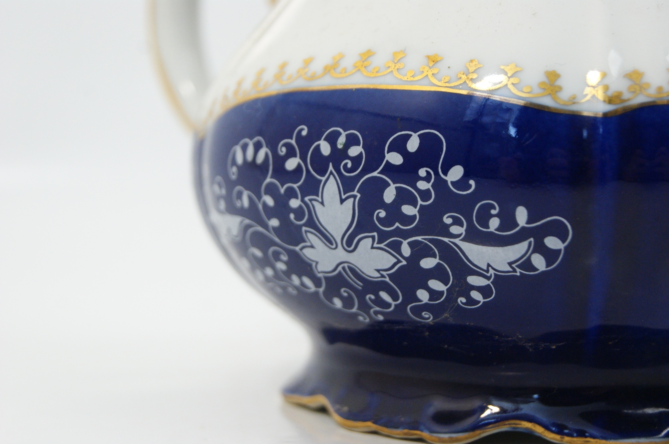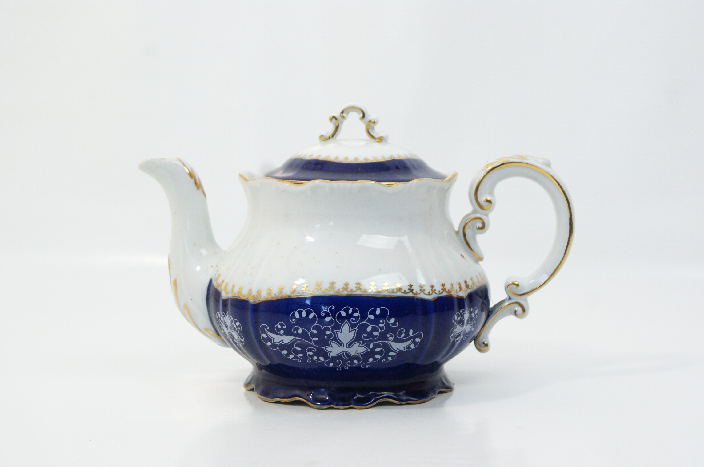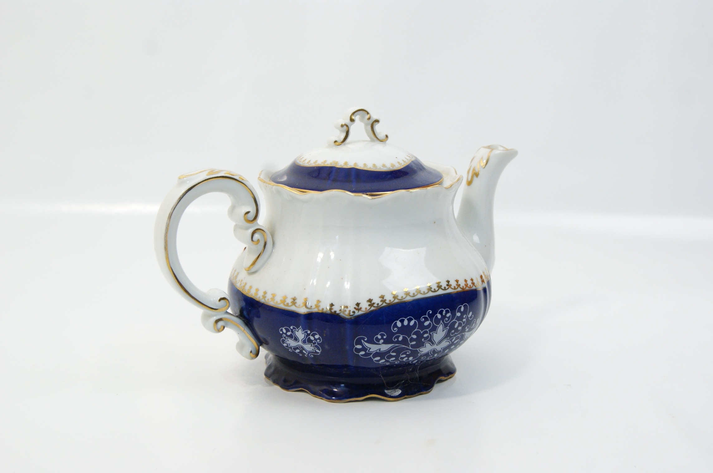 A Zsolnay porcelain teapot in the Pompadour pattern, featuring a lobed, squat body. The lower portion and the domed lid are decorated with a deep cobalt blue ground, enriched with white transfer-printed foliate and scrolling vine motifs. The upper section of the body is finished in white, with a hand-applied gilt trefoil border at the transition. The piece includes a scrolling handle with a thumb-rest, a curved spout, and a decorative scroll-form finial, all heightened with gilt accents. The base bears the purple printed factory mark with five towers, EST. 1868, ZSOLNAY, HUNGARY, and PÉCS. Additional marks include a small underglaze blue character within a circle and handwritten 1/2 in black ink. Dimensions: Height 13cm, Width 18cm (approximate).