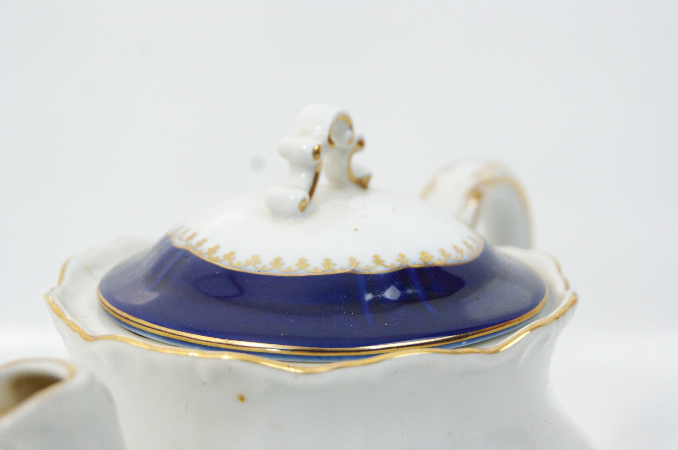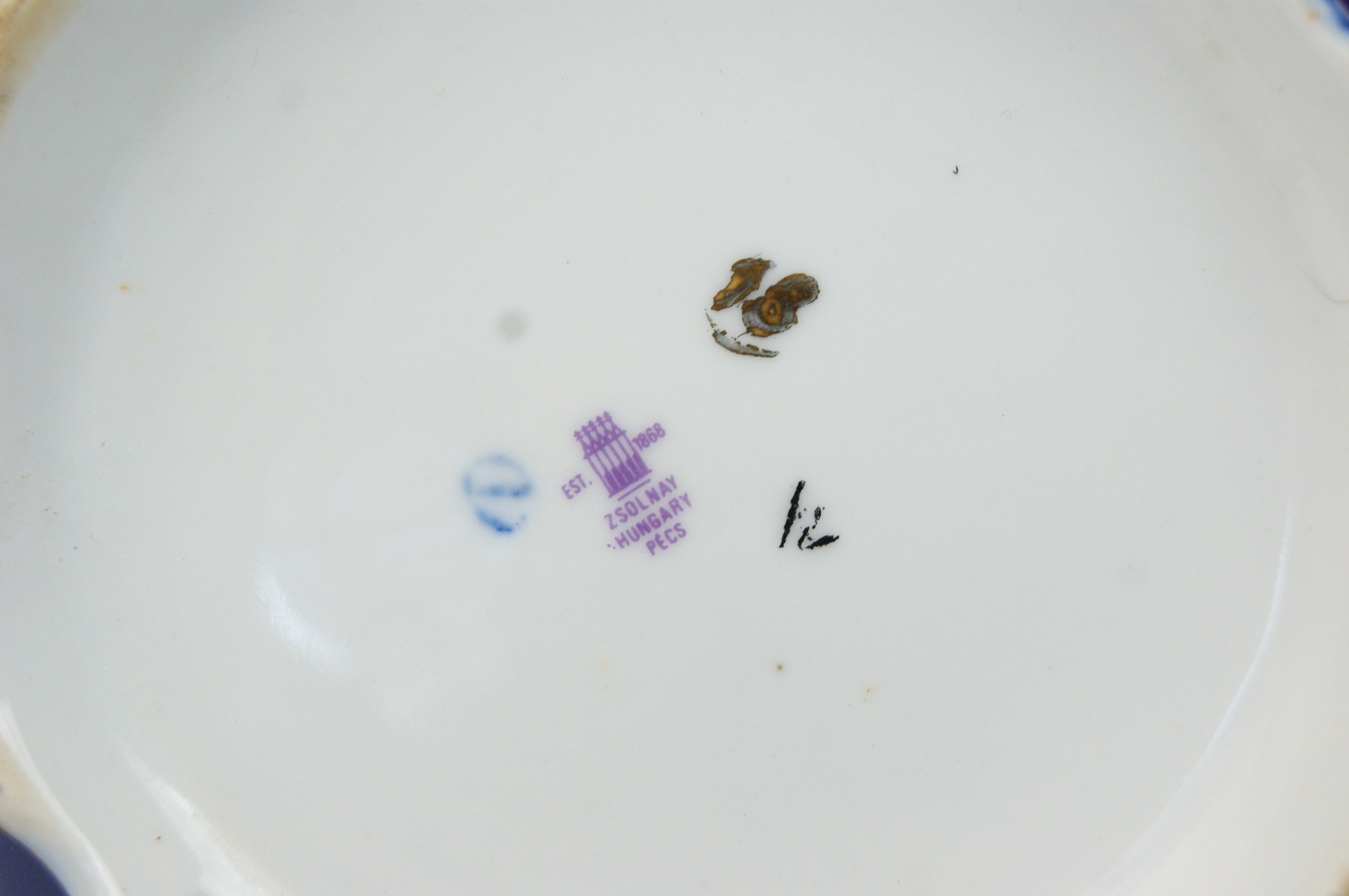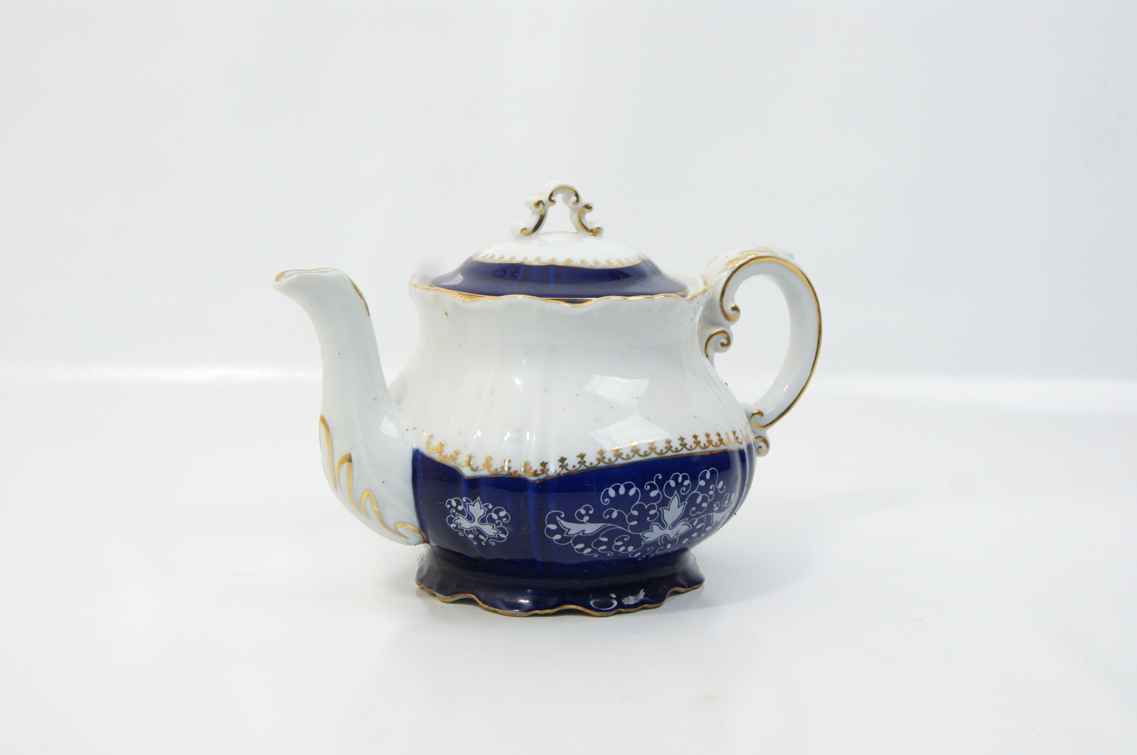 A Zsolnay porcelain teapot in the Pompadour pattern, featuring a lobed, squat body. The lower portion and the domed lid are decorated with a deep cobalt blue ground, enriched with white transfer-printed foliate and scrolling vine motifs. The upper section of the body is finished in white, with a hand-applied gilt trefoil border at the transition. The piece includes a scrolling handle with a thumb-rest, a curved spout, and a decorative scroll-form finial, all heightened with gilt accents. The base bears the purple printed factory mark with five towers, EST. 1868, ZSOLNAY, HUNGARY, and PÉCS. Additional marks include a small underglaze blue character within a circle and handwritten 1/2 in black ink. Dimensions: Height 13cm, Width 18cm (approximate).