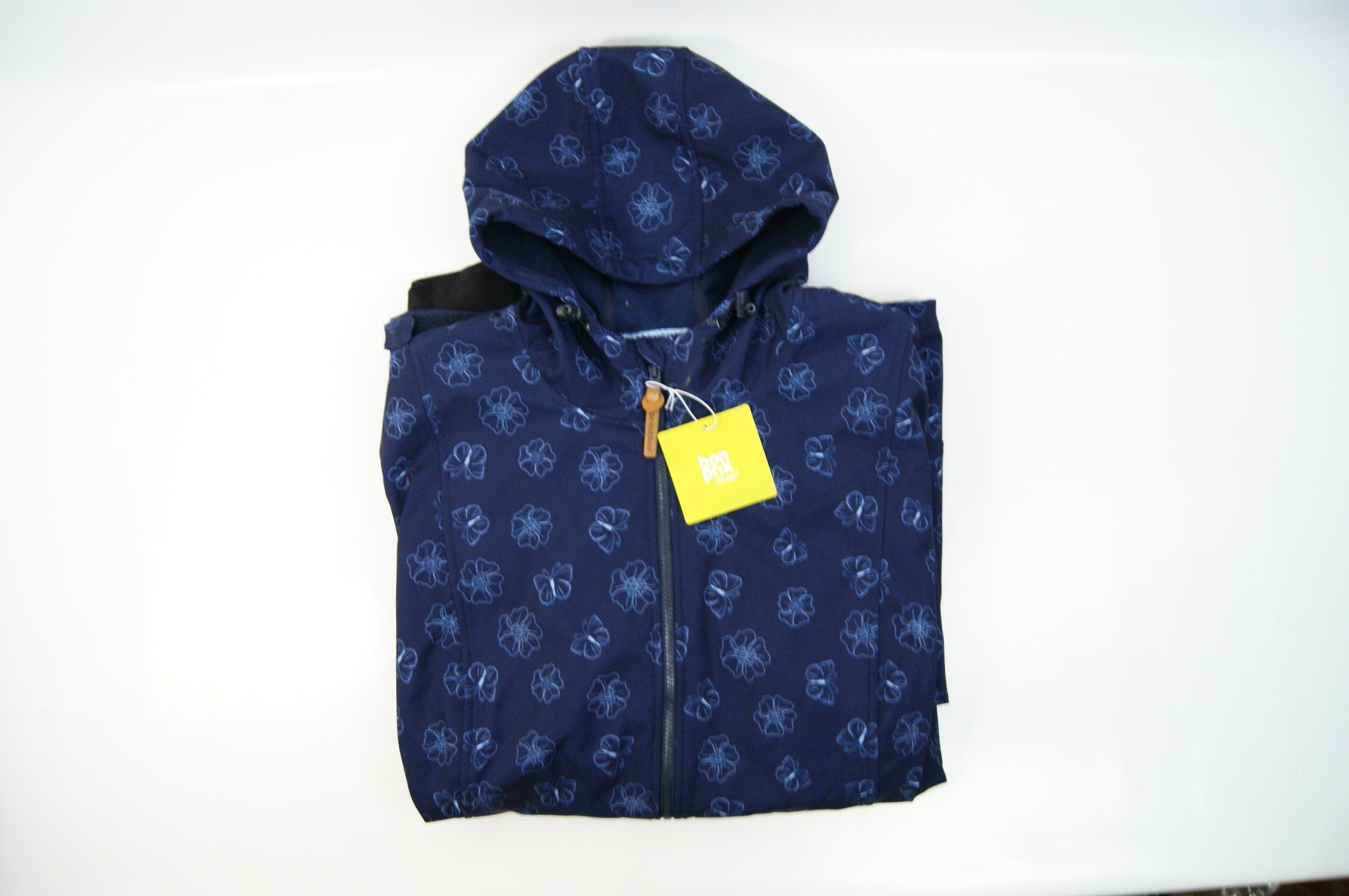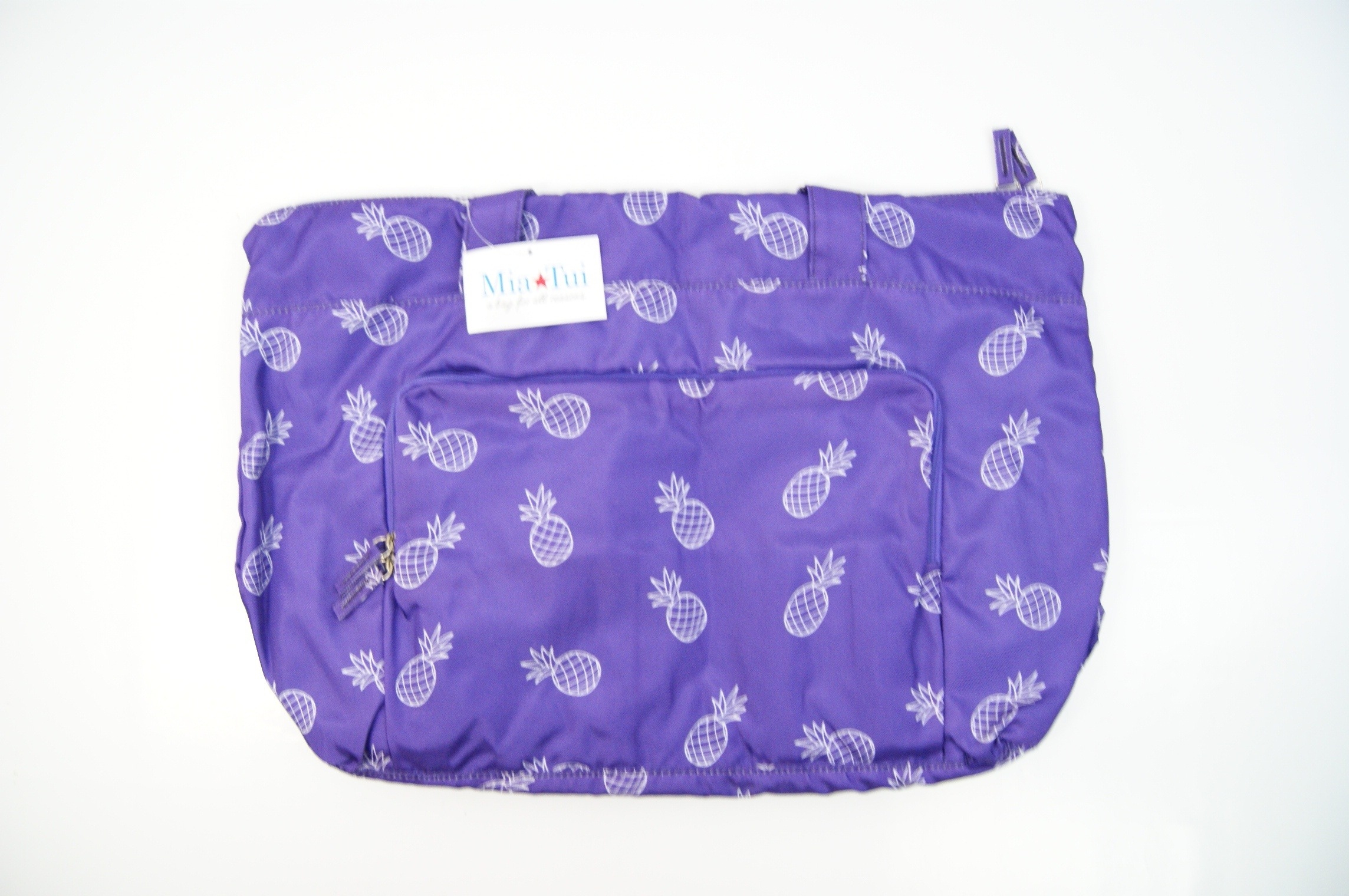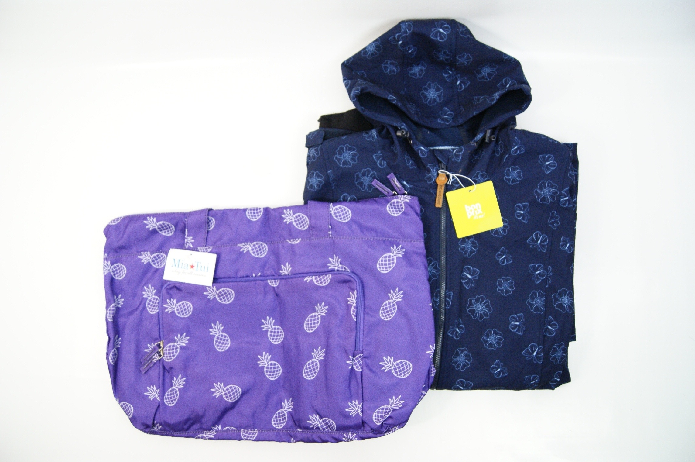 A lot consisting of two contemporary items, both retaining original retail tags. The first item is a Mia Tui tote bag constructed from a purple synthetic fabric featuring an all-over white pineapple print. The bag includes a large main zippered compartment, a prominent front zippered pocket, and double shoulder straps. The hardware consists of purple plastic zippers with matching fabric pullers. A white rectangular tag is attached, printed with the text Mia Tui a bag for all reasons. The second item is a bonprix hooded outdoor jacket from the bc outdoor range. The garment is made from a navy blue synthetic performance fabric with a tonal light blue floral and butterfly print. It features a full-length front zipper, a drawstring hood, and a tan faux-leather zipper puller embossed with bc outdoor. A yellow square swing tag is attached with the bonprix brand name.