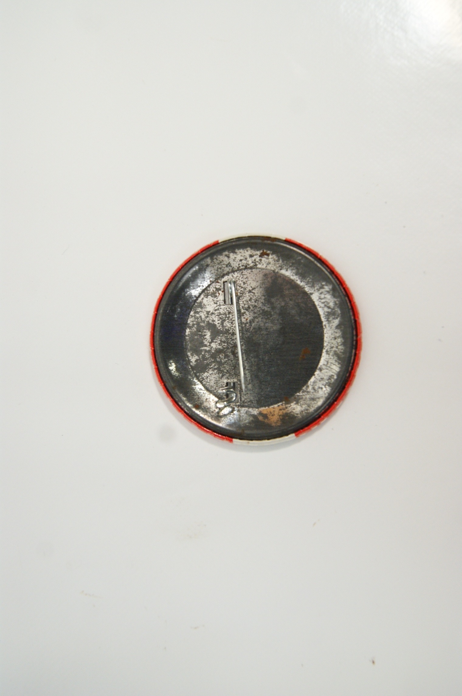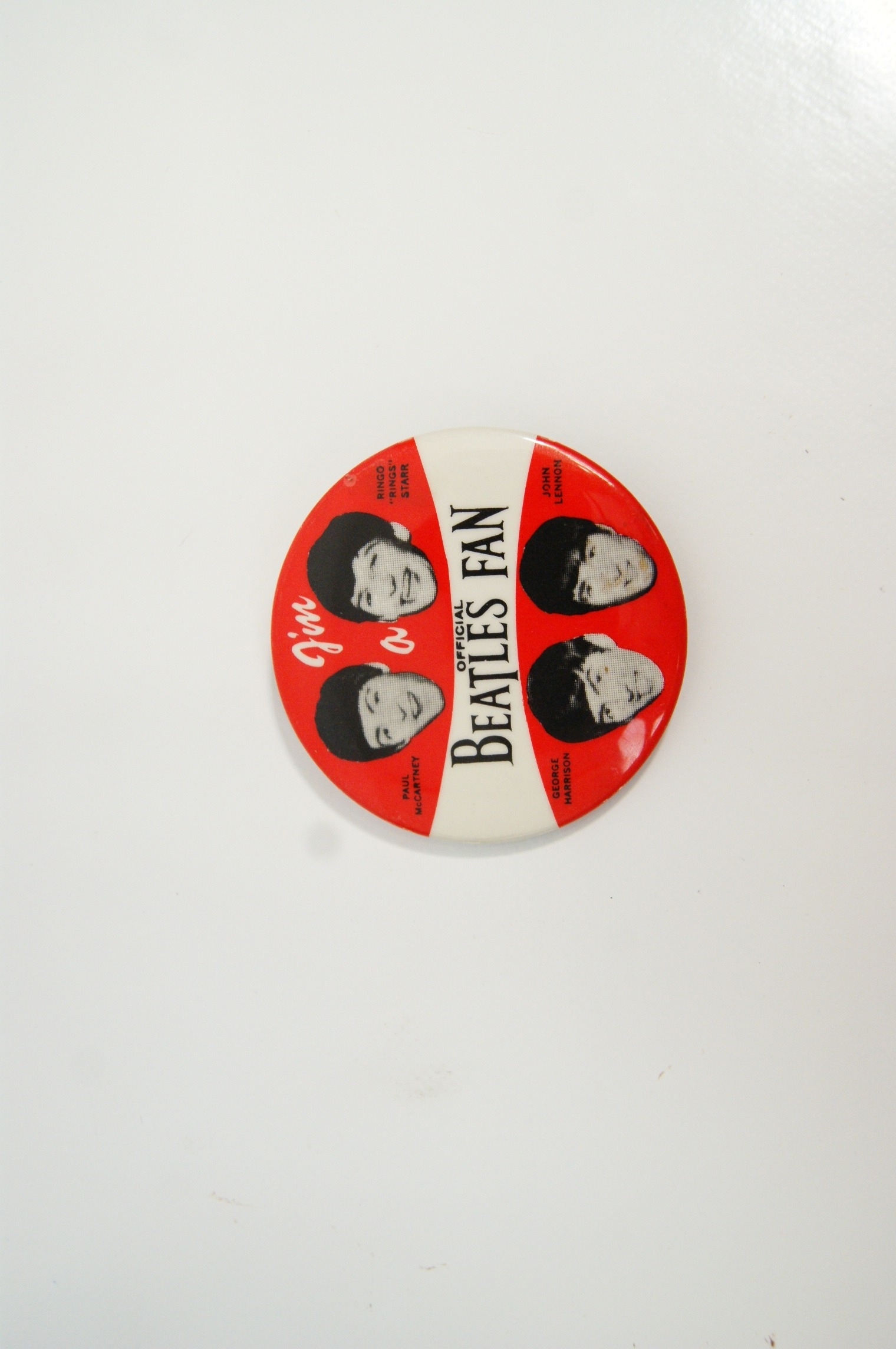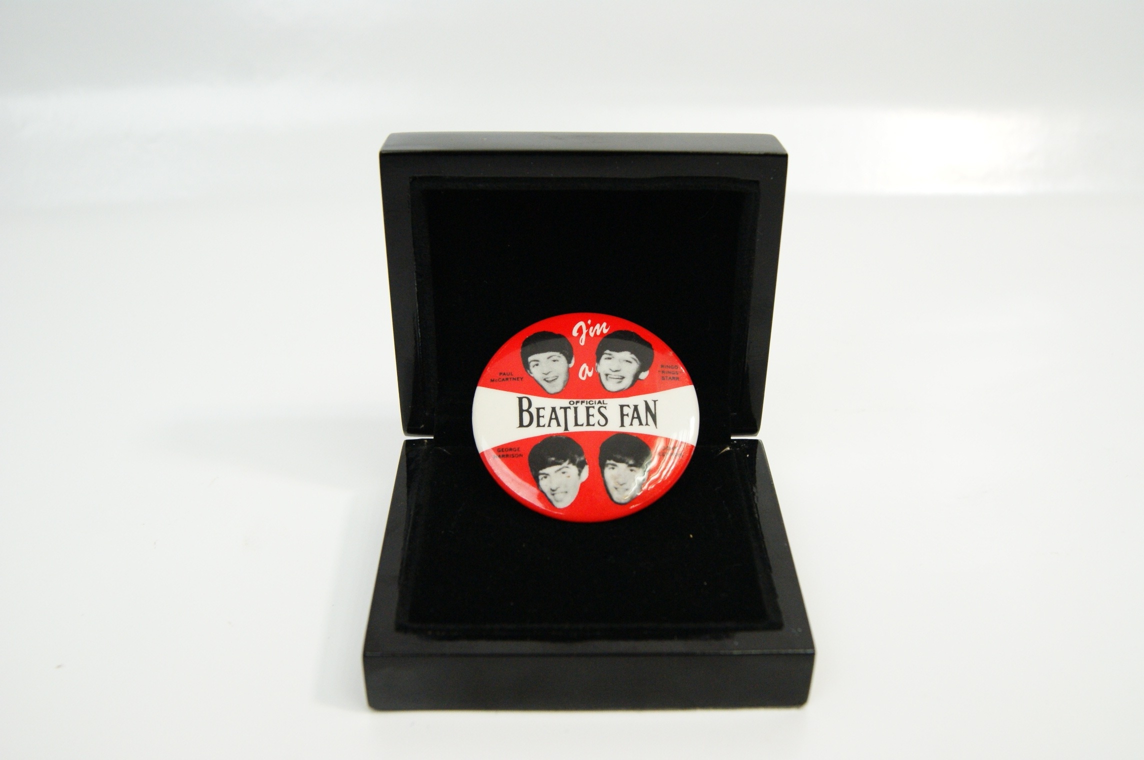 Printed in red, white and black, the badge retains its original pin fastening to the reverse. Such fan badges were widely produced during the band’s early touring years and remain popular collectibles associated with the global cultural phenomenon of Beatlemania.