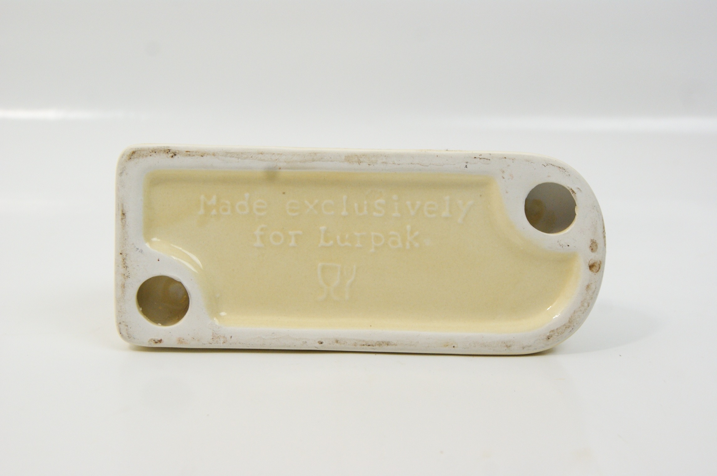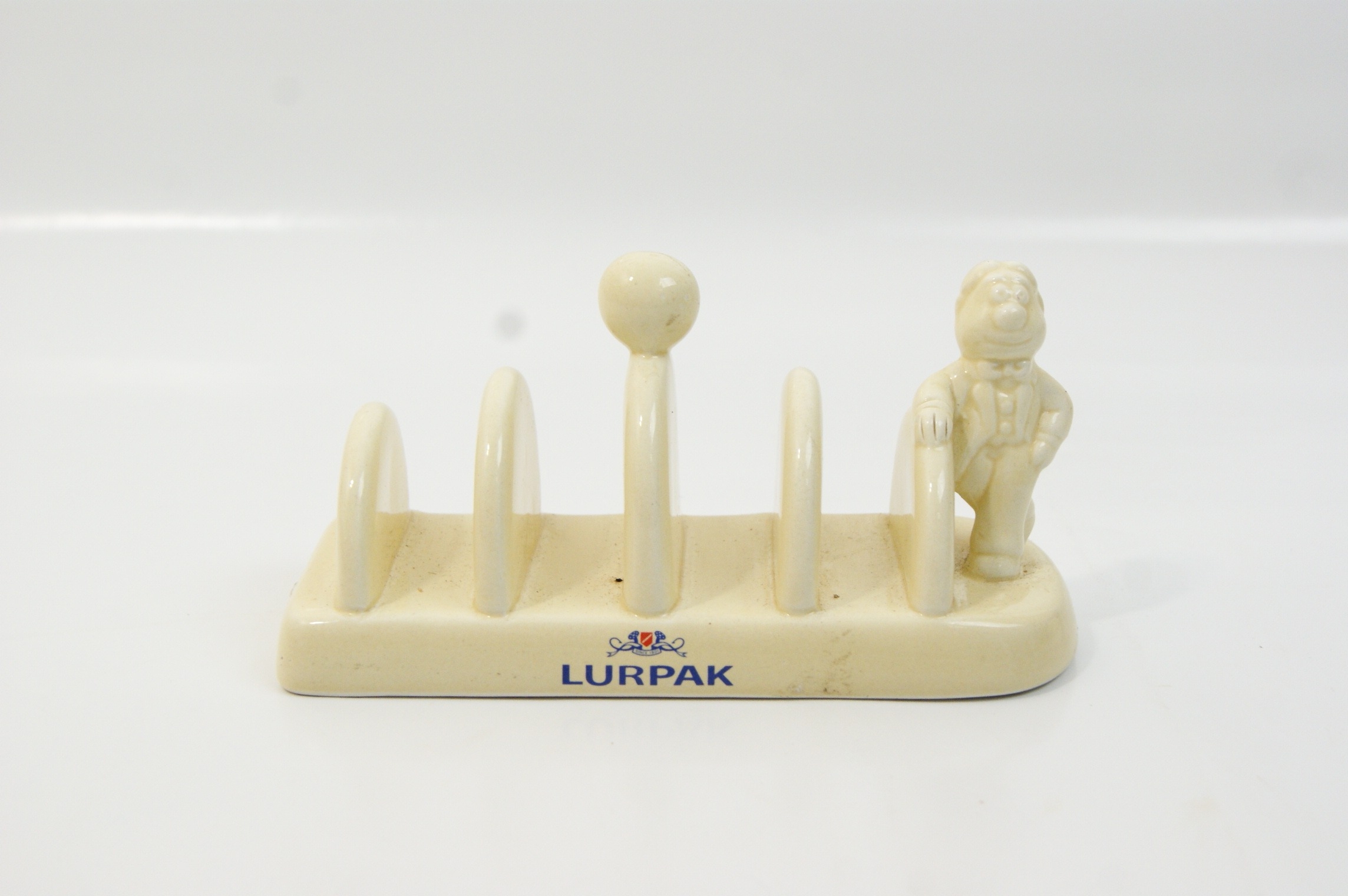 Collection of five novelty advertising toast racks featuring Marmite and Lurpak branding. The lot includes two Marmite jar shaped toast racks and 3 Lurpak toast rack featuring the well known Douglas butterman figure.