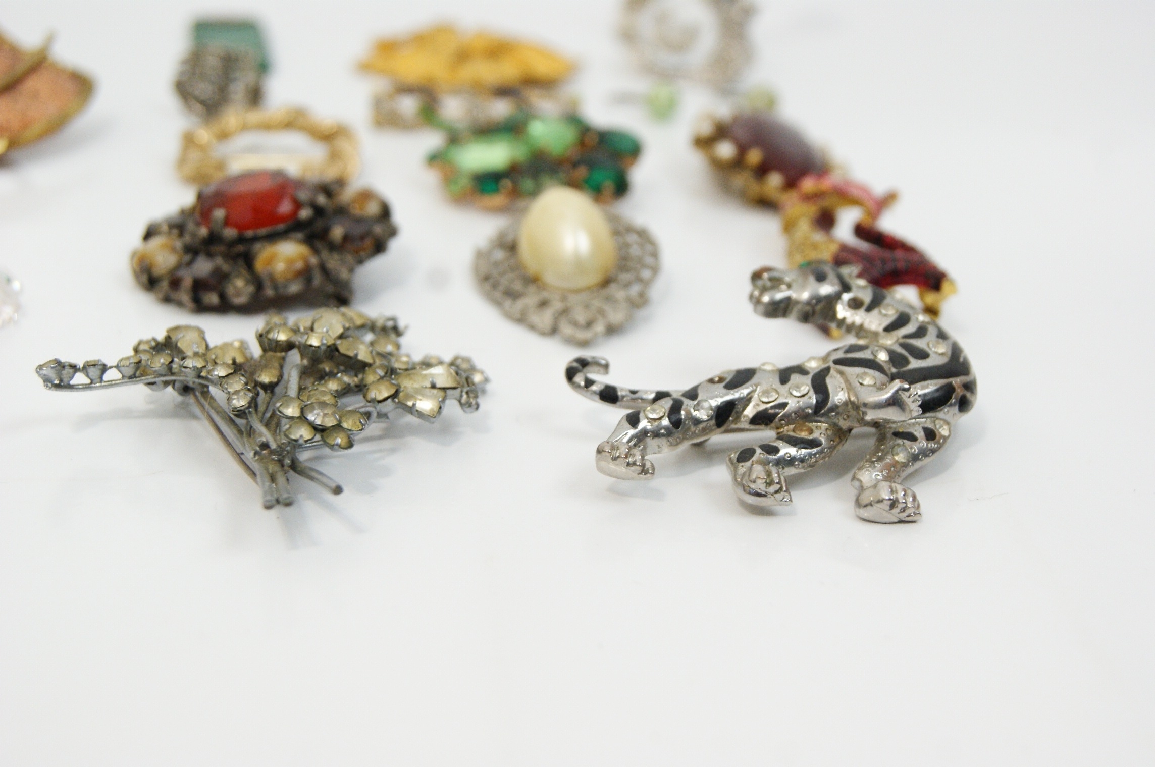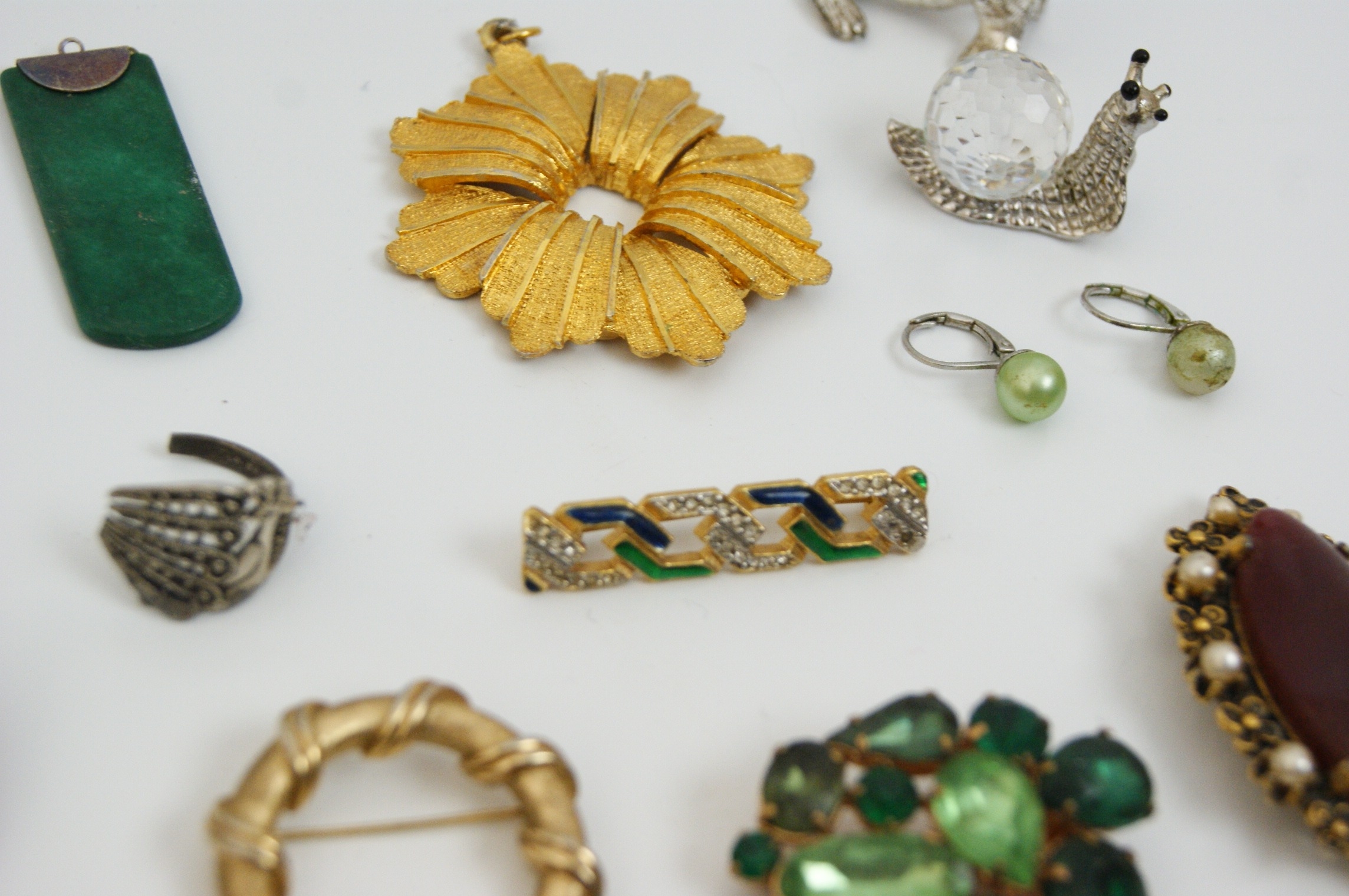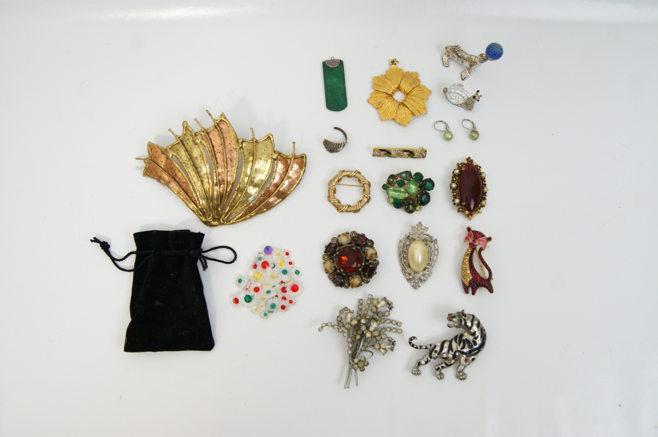 A varied collection of 20th-century costume jewellery and small decorative objects. The lot features a large modernist fan-form brooch in bi-colour gold and copper-toned metal with a textured finish; a large silver-tone tiger brooch detailed with black enamel stripes and clear rhinestone accents; and a stylised red and gold-tone enamel cat brooch. Included is a textured gold-tone wreath brooch in the style of Crown Trifari, alongside a large floral spray brooch set with clear rhinestones and a cluster brooch featuring various shades of green glass stones. The collection further contains an ornate circular brooch with a central red faceted stone and faux pearl border, an Art Deco style bar brooch with blue and green enamel, a silver-tone filigree brooch with a faux pearl cabochon, and an oval burgundy cabochon brooch. Supplemental items include a green rectangular pendant, a pair of light green pearl-effect drop earrings, a marcasite-style ring, and two silver-tone animal figurines—a snail and a seal—each set with a faceted crystal. Accompanied by a selection of loose decorative elements and a black velvet drawstring pouch. Dimensions: Various.