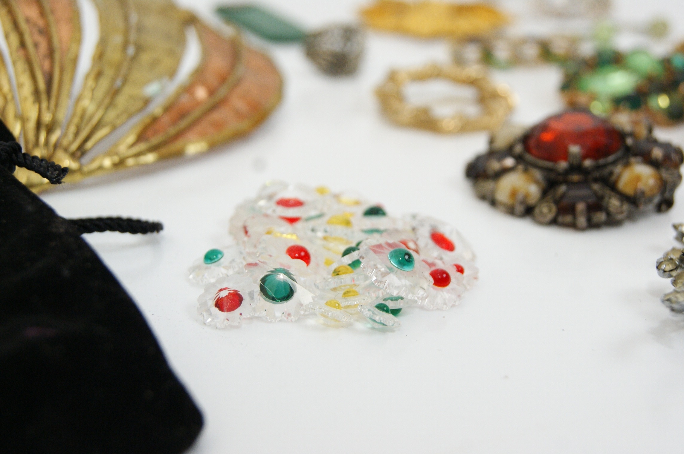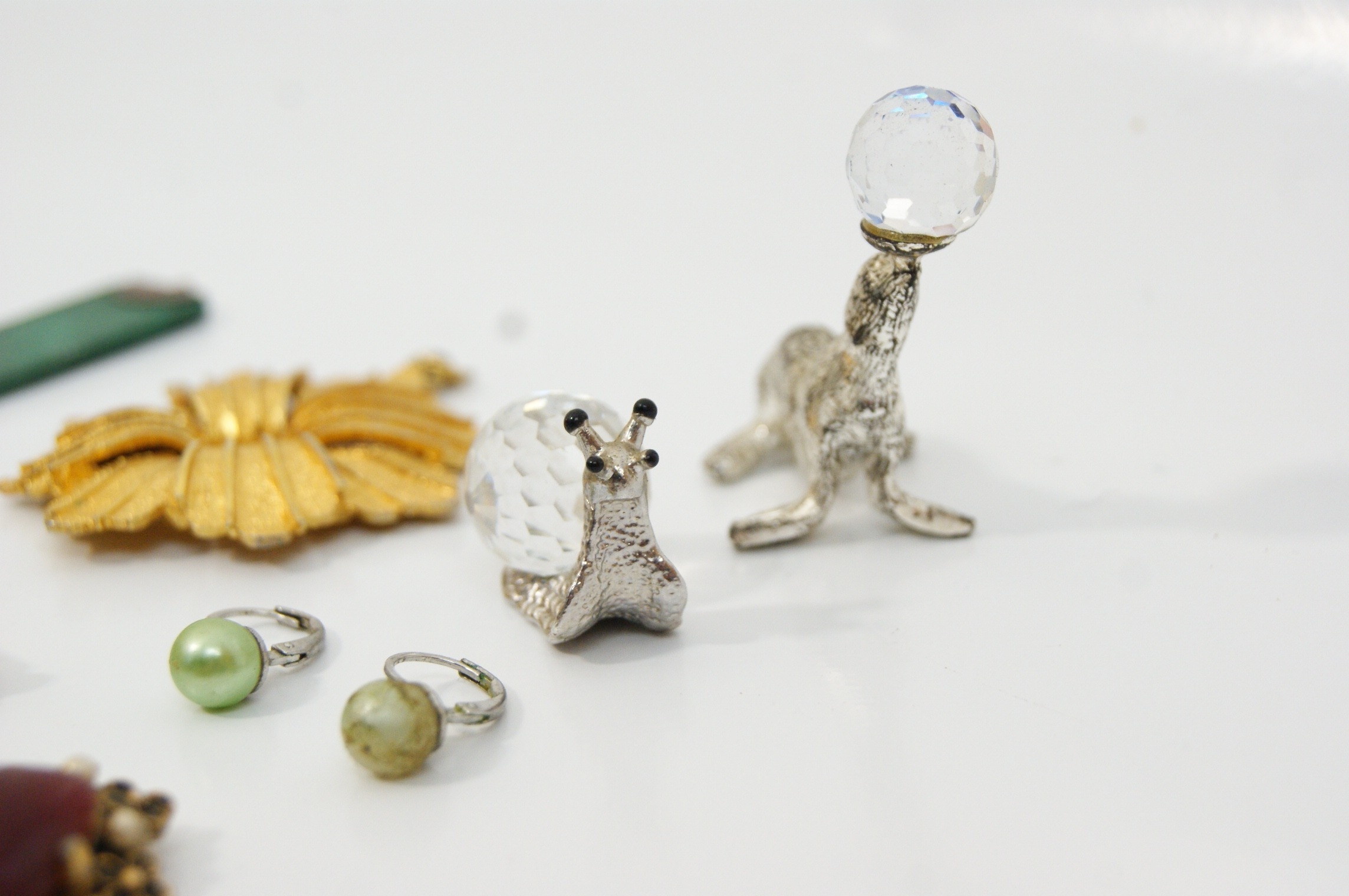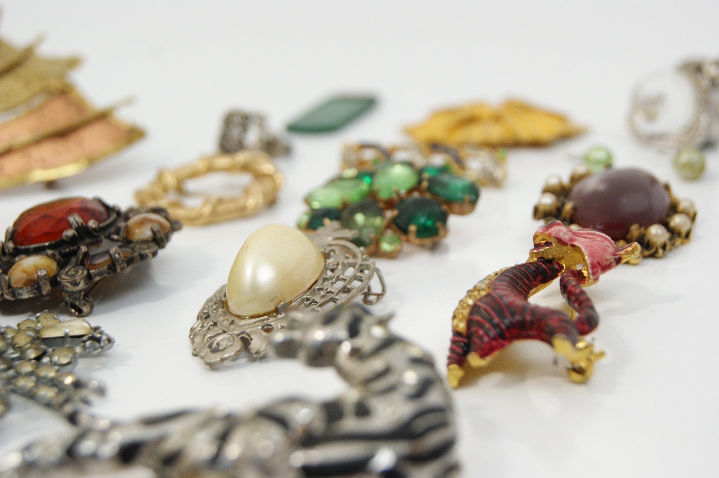A varied collection of 20th-century costume jewellery and small decorative objects. The lot features a large modernist fan-form brooch in bi-colour gold and copper-toned metal with a textured finish; a large silver-tone tiger brooch detailed with black enamel stripes and clear rhinestone accents; and a stylised red and gold-tone enamel cat brooch. Included is a textured gold-tone wreath brooch in the style of Crown Trifari, alongside a large floral spray brooch set with clear rhinestones and a cluster brooch featuring various shades of green glass stones. The collection further contains an ornate circular brooch with a central red faceted stone and faux pearl border, an Art Deco style bar brooch with blue and green enamel, a silver-tone filigree brooch with a faux pearl cabochon, and an oval burgundy cabochon brooch. Supplemental items include a green rectangular pendant, a pair of light green pearl-effect drop earrings, a marcasite-style ring, and two silver-tone animal figurines—a snail and a seal—each set with a faceted crystal. Accompanied by a selection of loose decorative elements and a black velvet drawstring pouch. Dimensions: Various.