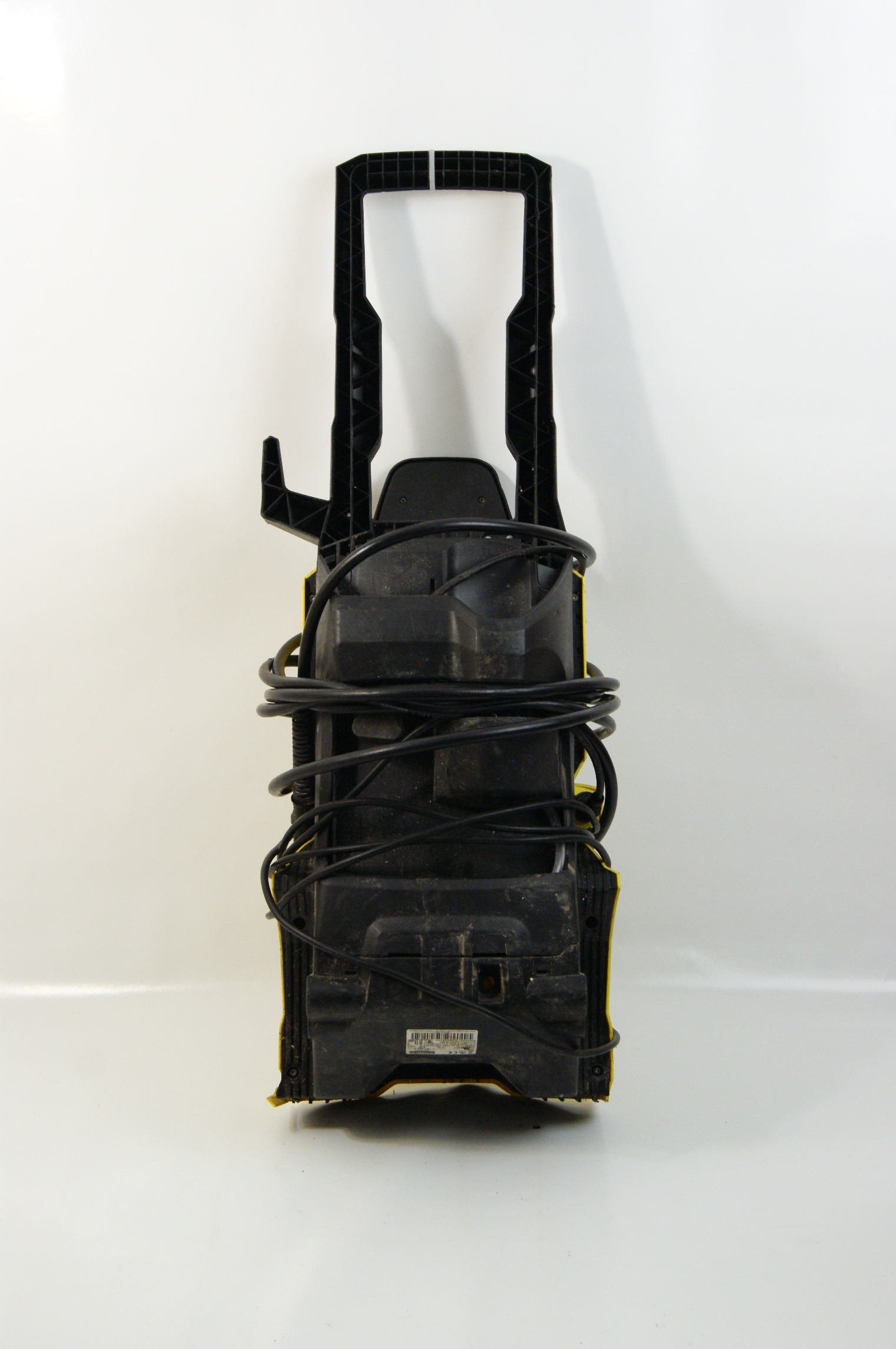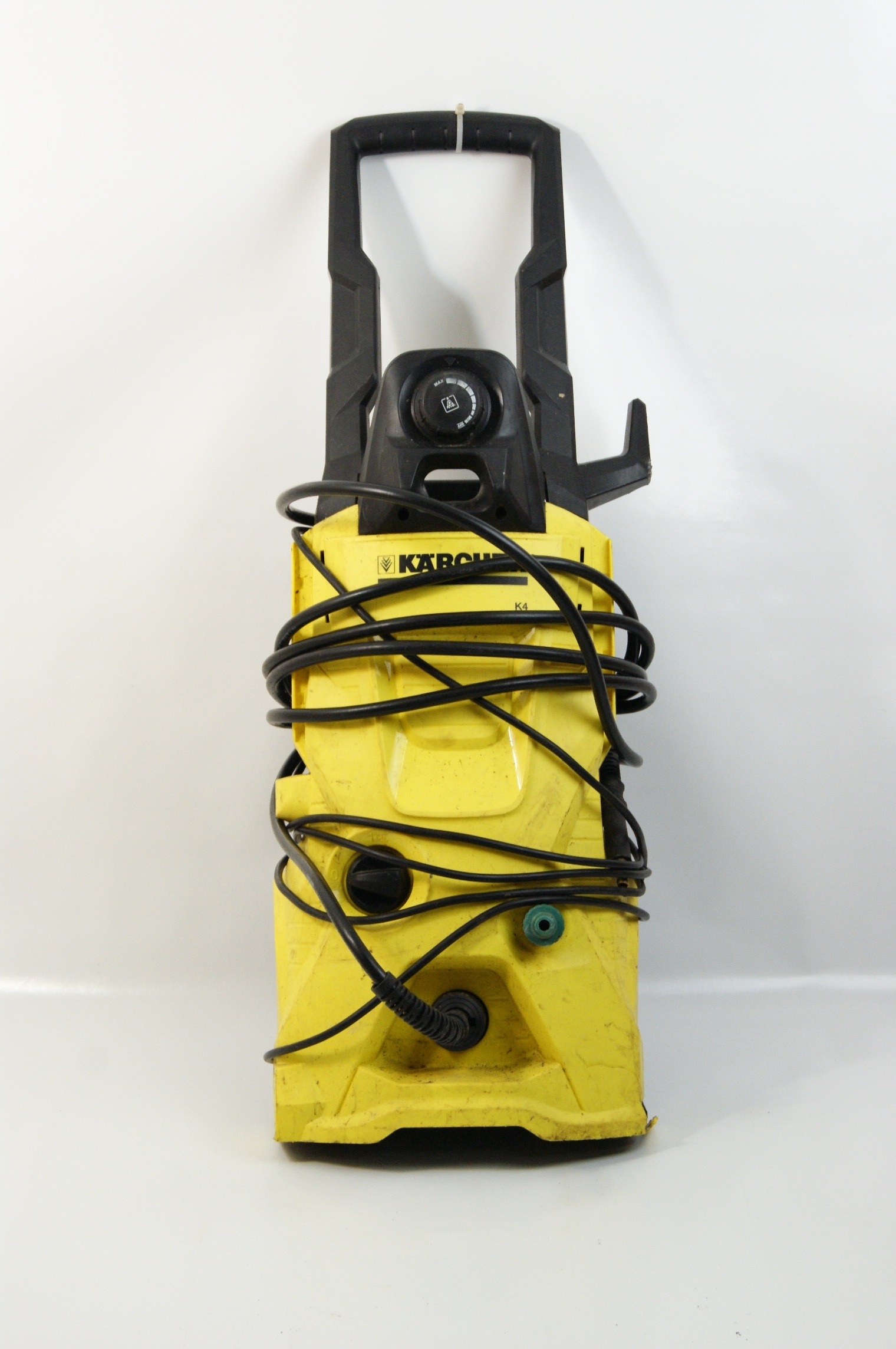 A Karcher K4 electric pressure washer featuring a yellow and black plastic housing. The unit is designed with an integrated top carry handle and a front-mounted rotary control dial. The exterior includes a visible water inlet connection with a green-tinted coupling and a power cable wrapped around the main body. A technical label with a barcode is present on the reverse. This lot consists of the main motor unit only; no additional hoses, lances, or spray guns are included.