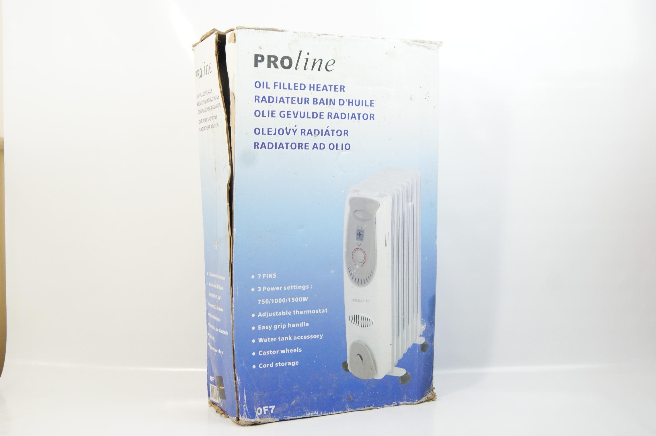 A Proline model OF7 portable oil-filled radiator heater. The unit is equipped with seven heating fins and features three power settings of 750W, 1000W, and 1500W. As specified on the manufacturer packaging, the device includes an adjustable thermostat, an integrated easy-grip handle, castor wheels for mobility, and a cord storage compartment. The box also notes the inclusion of a water tank accessory. The branding PROLine is printed on the front and side of the retail box. The packaging displays product information in multiple languages including English, French, Dutch, Czech, and Italian. The heater is contained within its original cardboard retail box and was not removed for internal inspection.