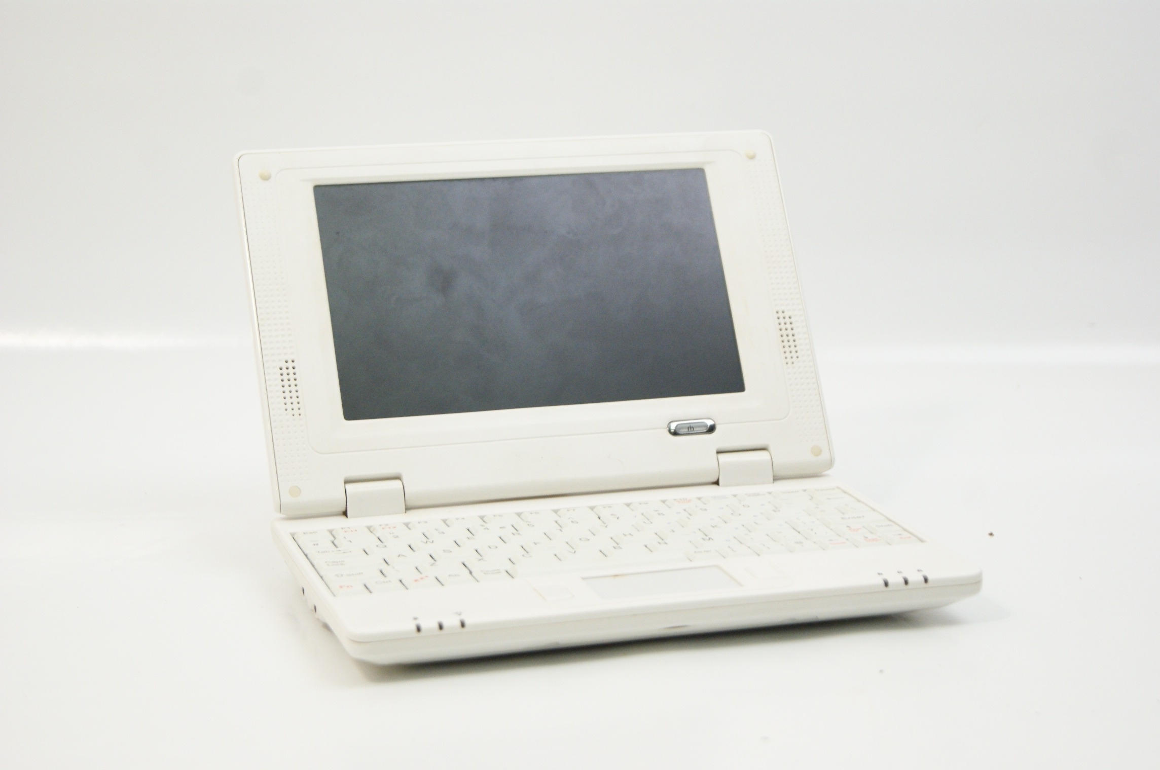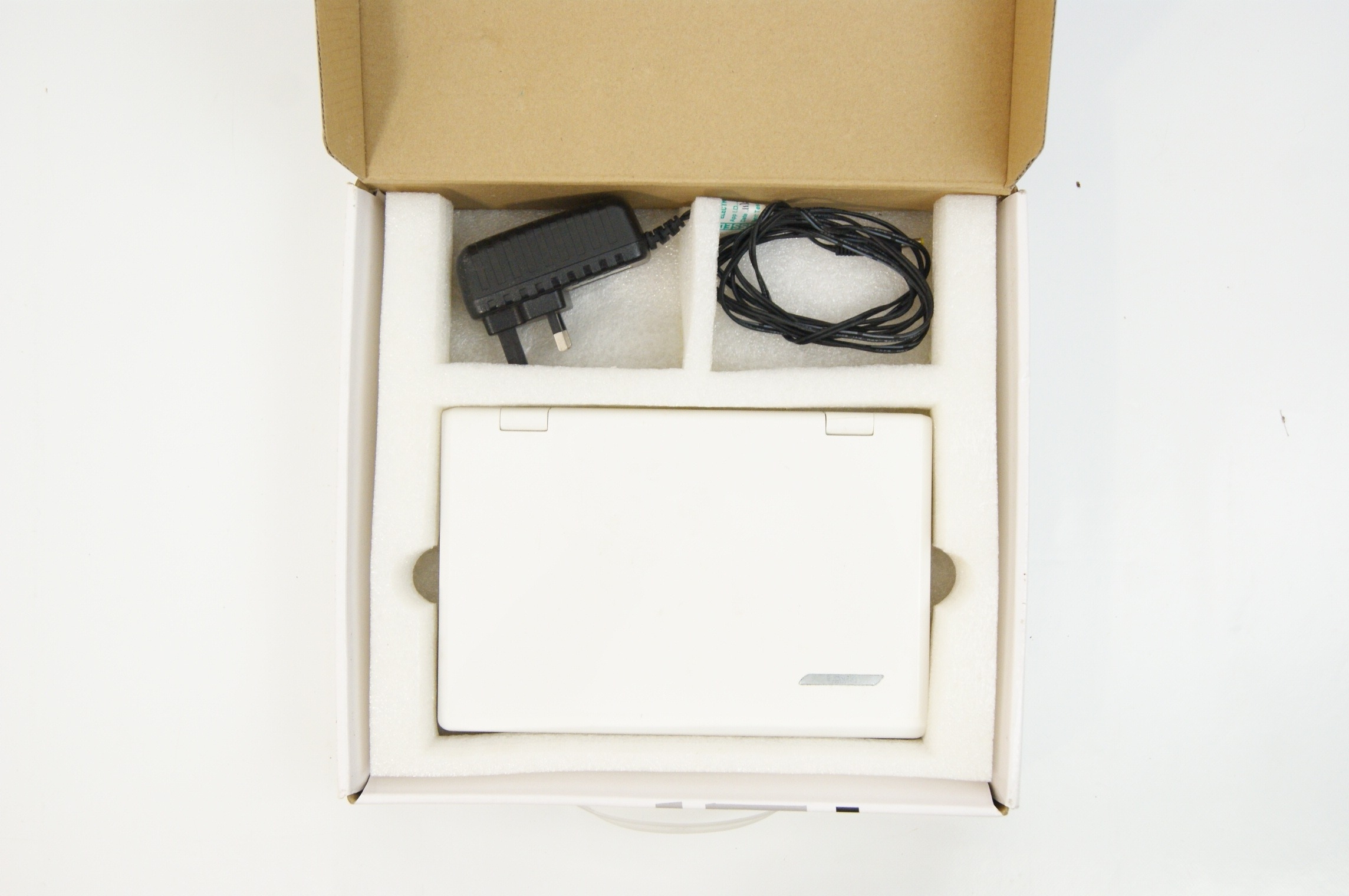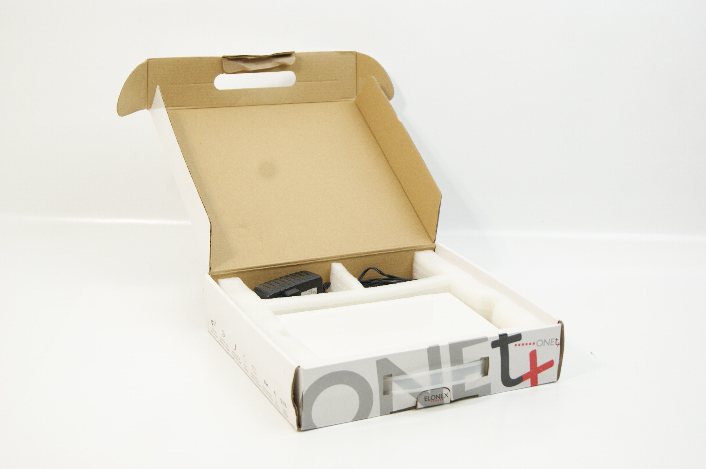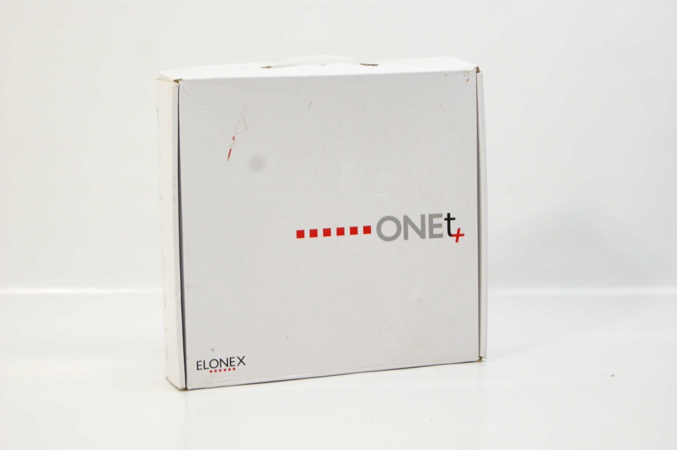An Elonex Onet+ netbook computer featuring a white plastic casing and an approximately 7-inch screen. The device is equipped with a compact QWERTY keyboard and an integrated touchpad. The original cardboard packaging is present and features the manufacturer name Elonex and the model designation ONEt+. Included accessories comprise the original box with foam inserts, an AC/DC power adapter with a UK three-pin plug, and a black cable. Technical specifications including processor, RAM, and storage capacity are not stated on the exterior of the device. No serial number is visible. The unit has not been tested for functionality, and the data wiping status is unknown.