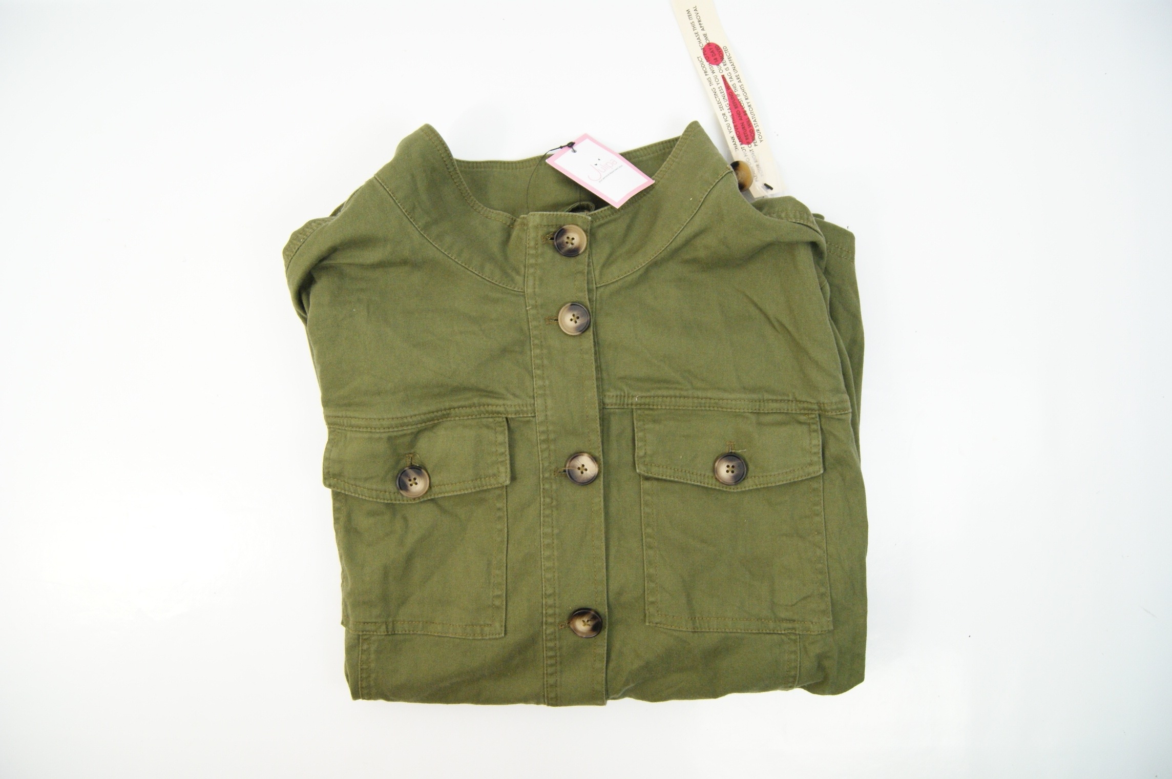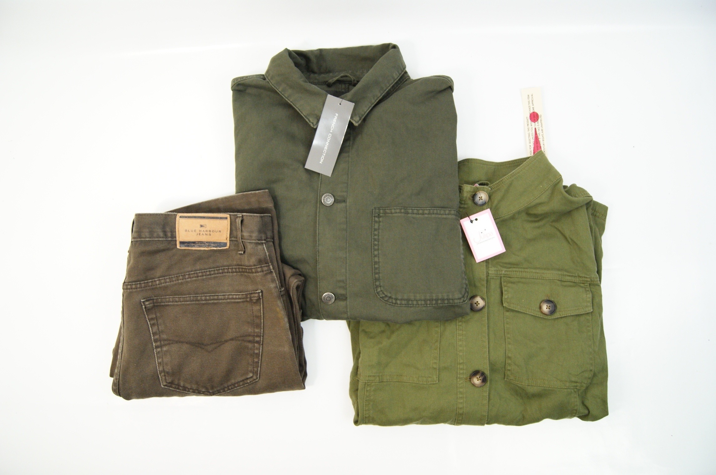 This lot comprises three contemporary garments consisting of a pair of jeans and two jackets. The first item is a pair of Marks and Spencer Blue Harbour regular fit jeans in brown cotton twill, featuring a branded external waistband patch and internal care labels. The second item is a French Connection button-front overshirt or chore jacket in dark olive green heavyweight cotton, designed with a single breast pocket and metallic buttons. The third item is a Julipa utility-style jacket in olive green cotton twill, featuring two flap chest pockets and tortoiseshell-effect buttons.