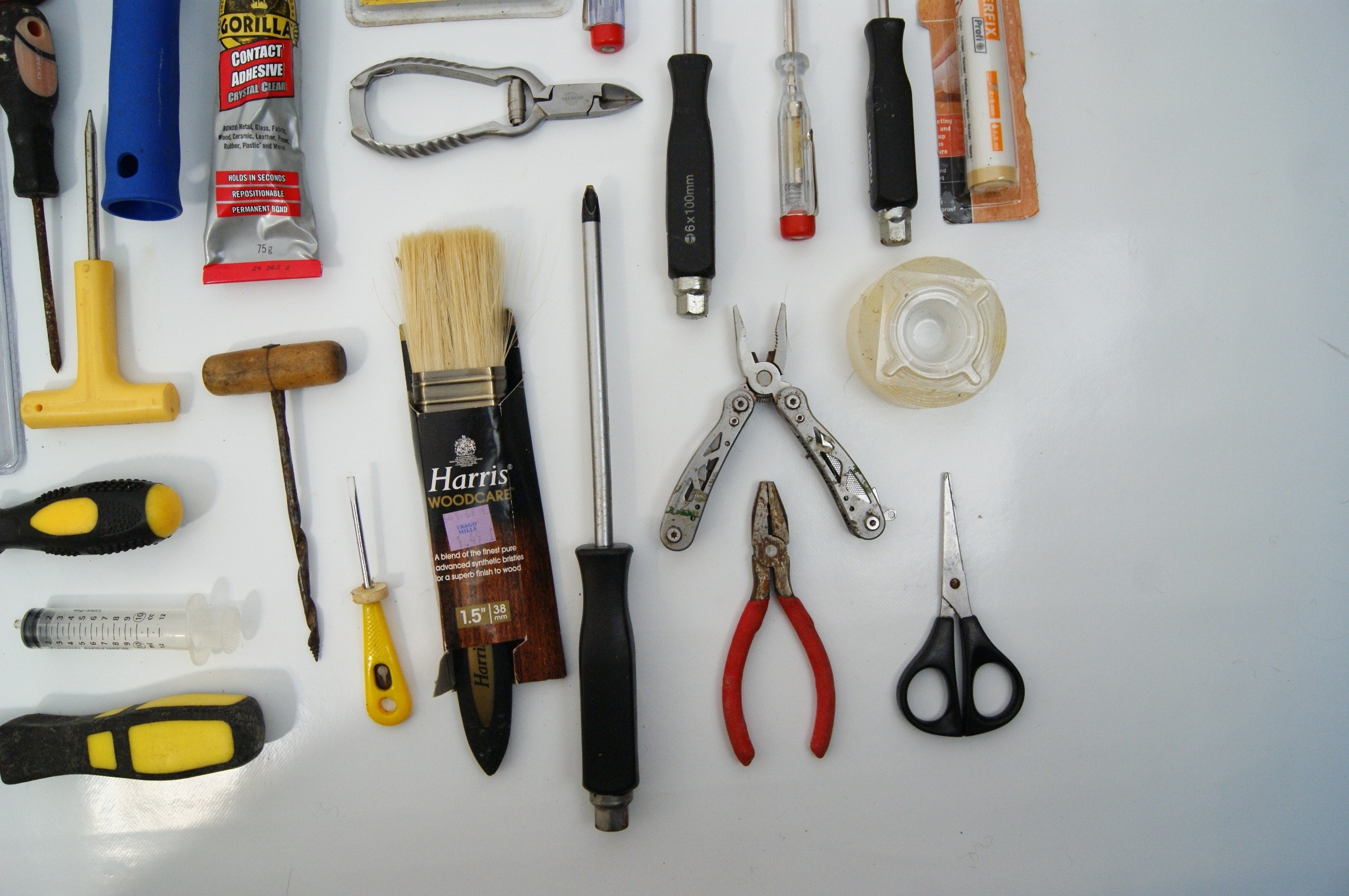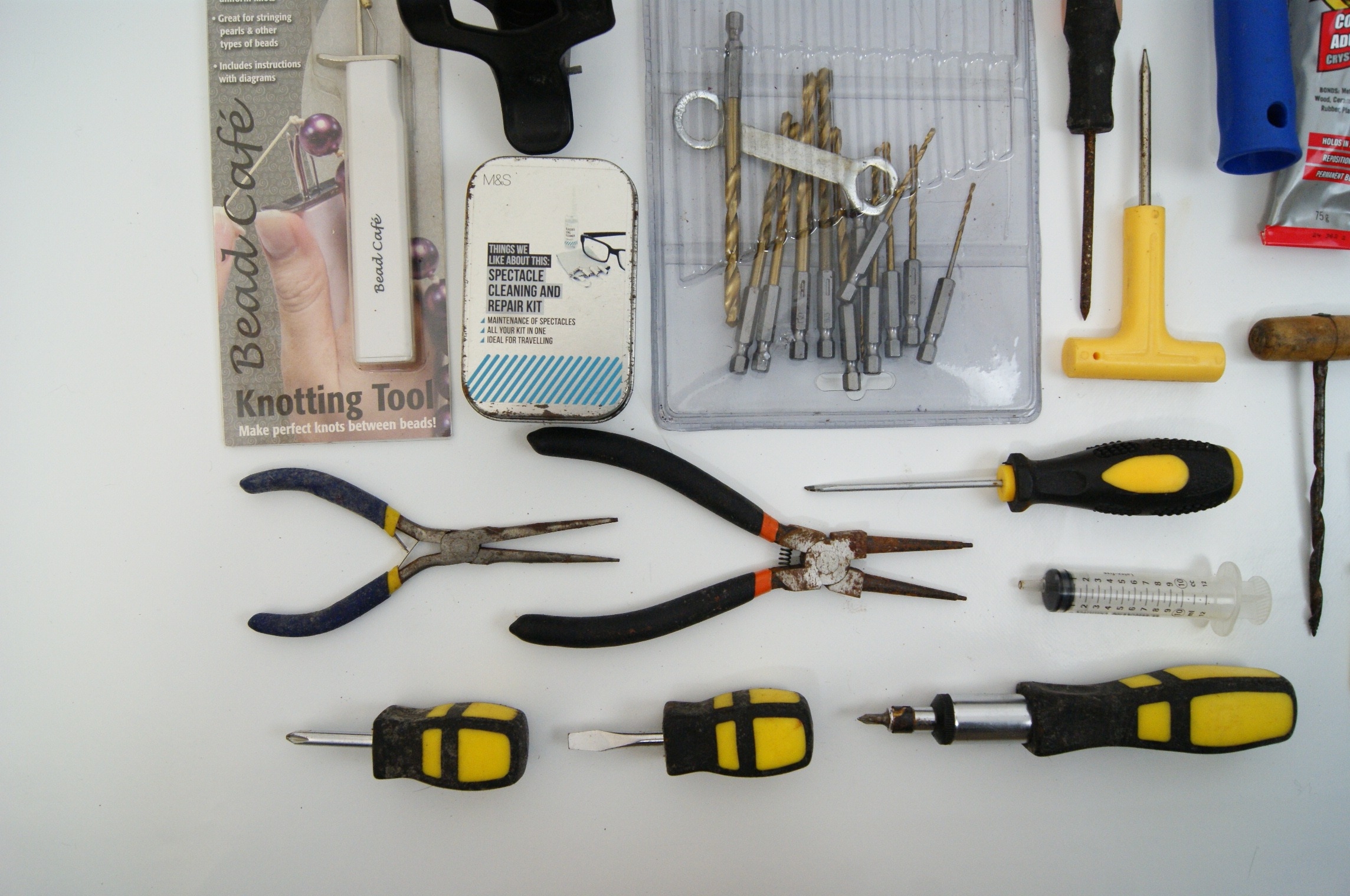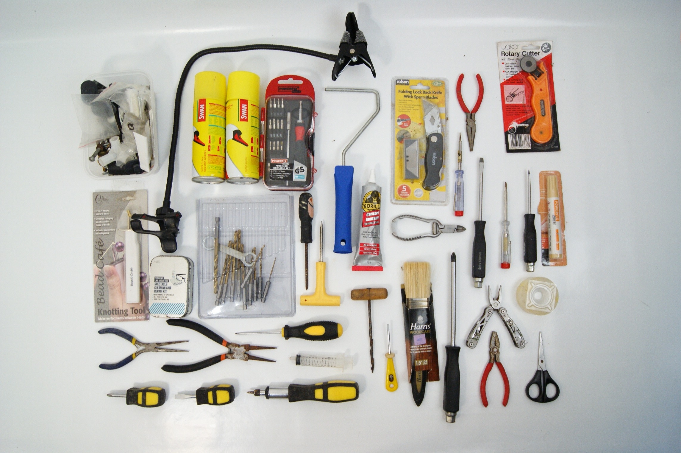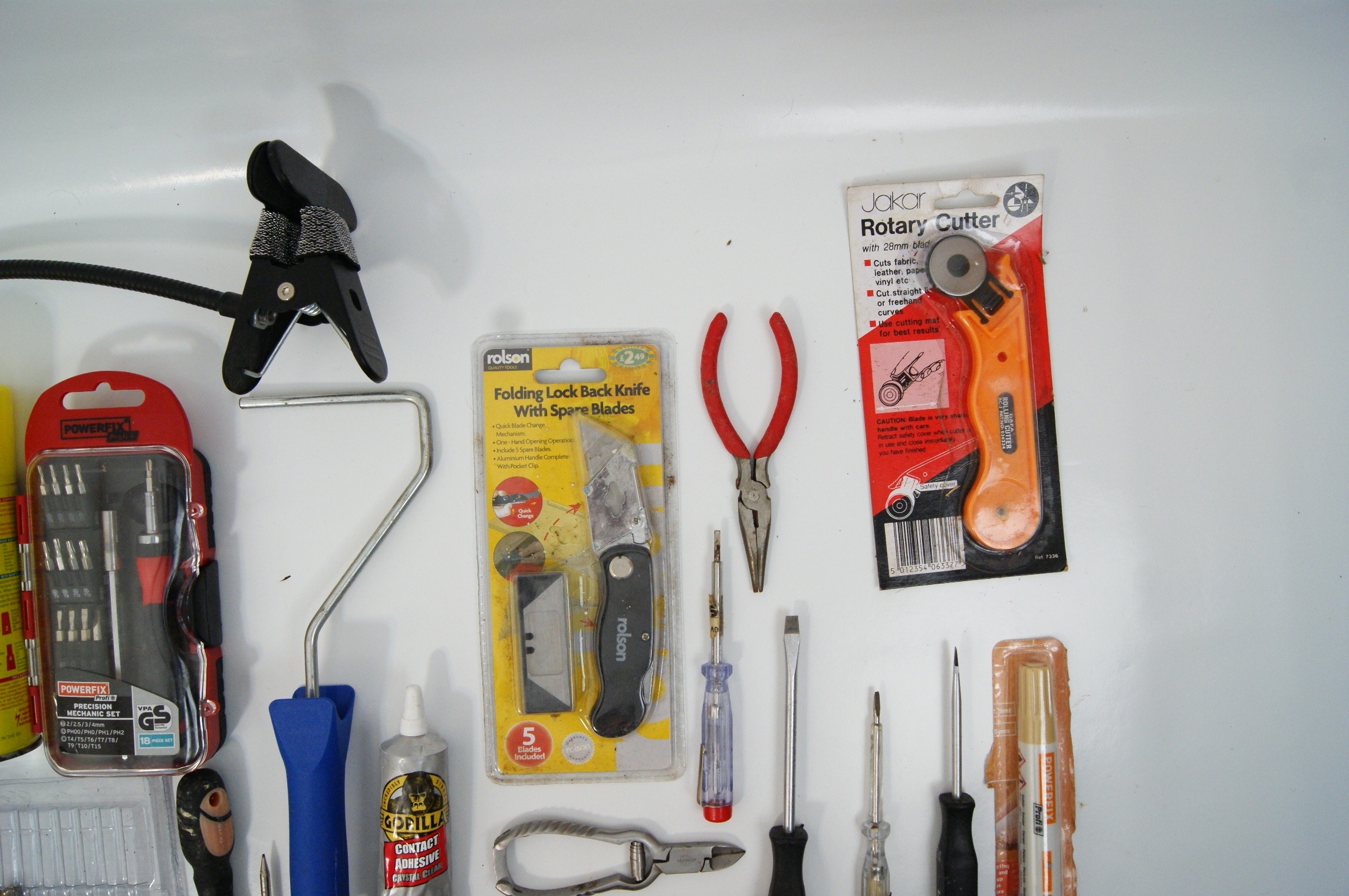 Mixed lot of approximately 35 assorted hand tools, crafting supplies, and household maintenance items including Powerfix, Rolson, and Harris, Mixed Condition