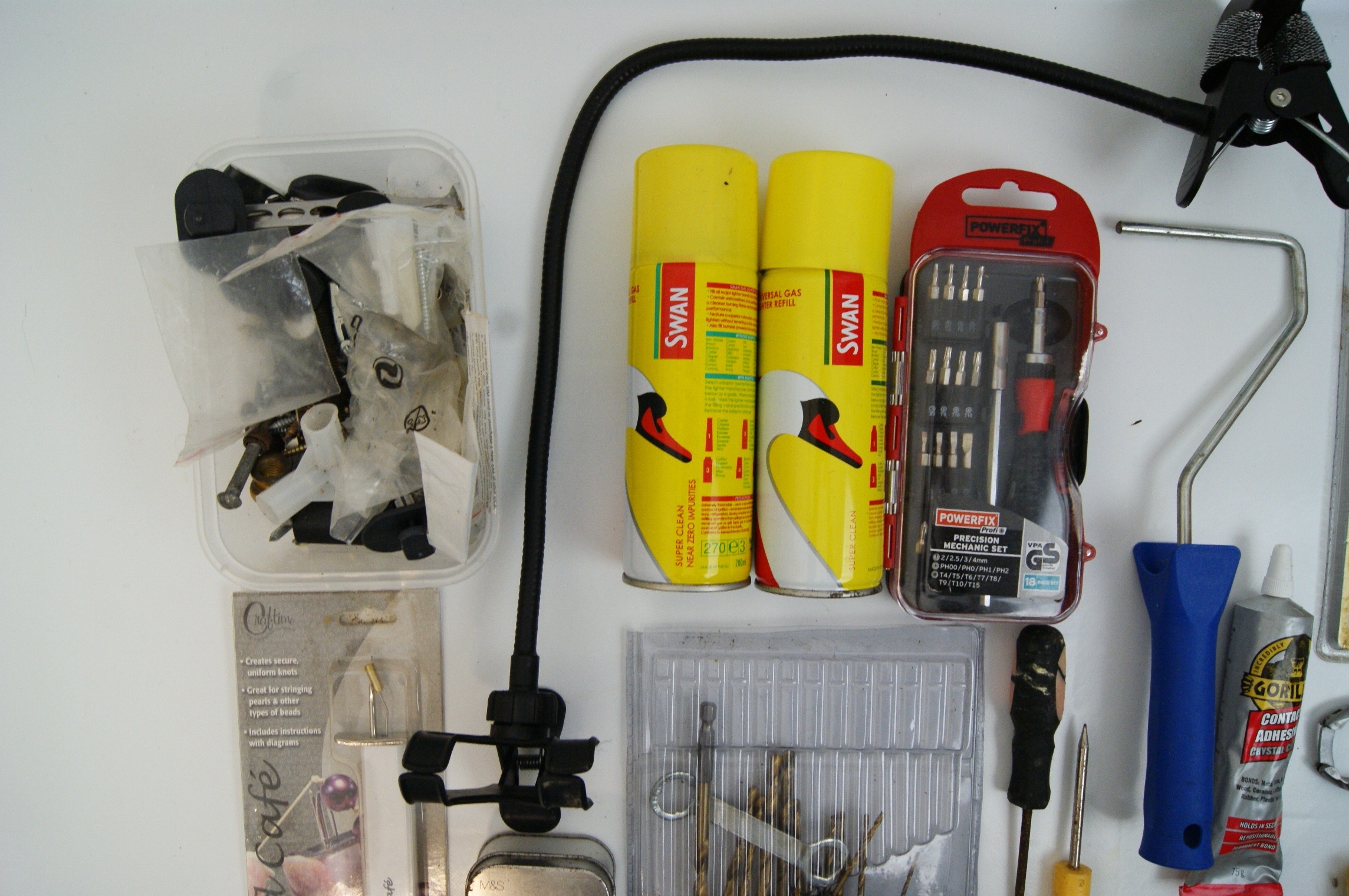 This lot comprises approximately 35 assorted items suitable for DIY, crafting, and general household maintenance. Key branded products include a Powerfix Profi 18-piece precision mechanic set, two 270ml cans of Swan lighter fluid, a Rolson folding lock-back knife in original carded packaging, and a Jakar rotary cutter (Ref. 7336) in original packaging. Crafting and maintenance supplies feature a Bead Café knotting tool, a Harris Woodcare 1.5-inch paintbrush, a tube of Gorilla contact adhesive, and an M&S spectacle cleaning and repair kit. The collection also includes a variety of loose hand tools such as needle-nose pliers, multiple screwdrivers including Powerfix yellow and black handled types, a multi-tool, and a set of assorted drill bits in a plastic case. Additional items include a paint roller frame, a flexible neck clamp, a small container of loose hardware, and miscellaneous sundries such as a roll of tape and a small syringe. The lot appears to be a collection of liquidation or general household surplus goods.