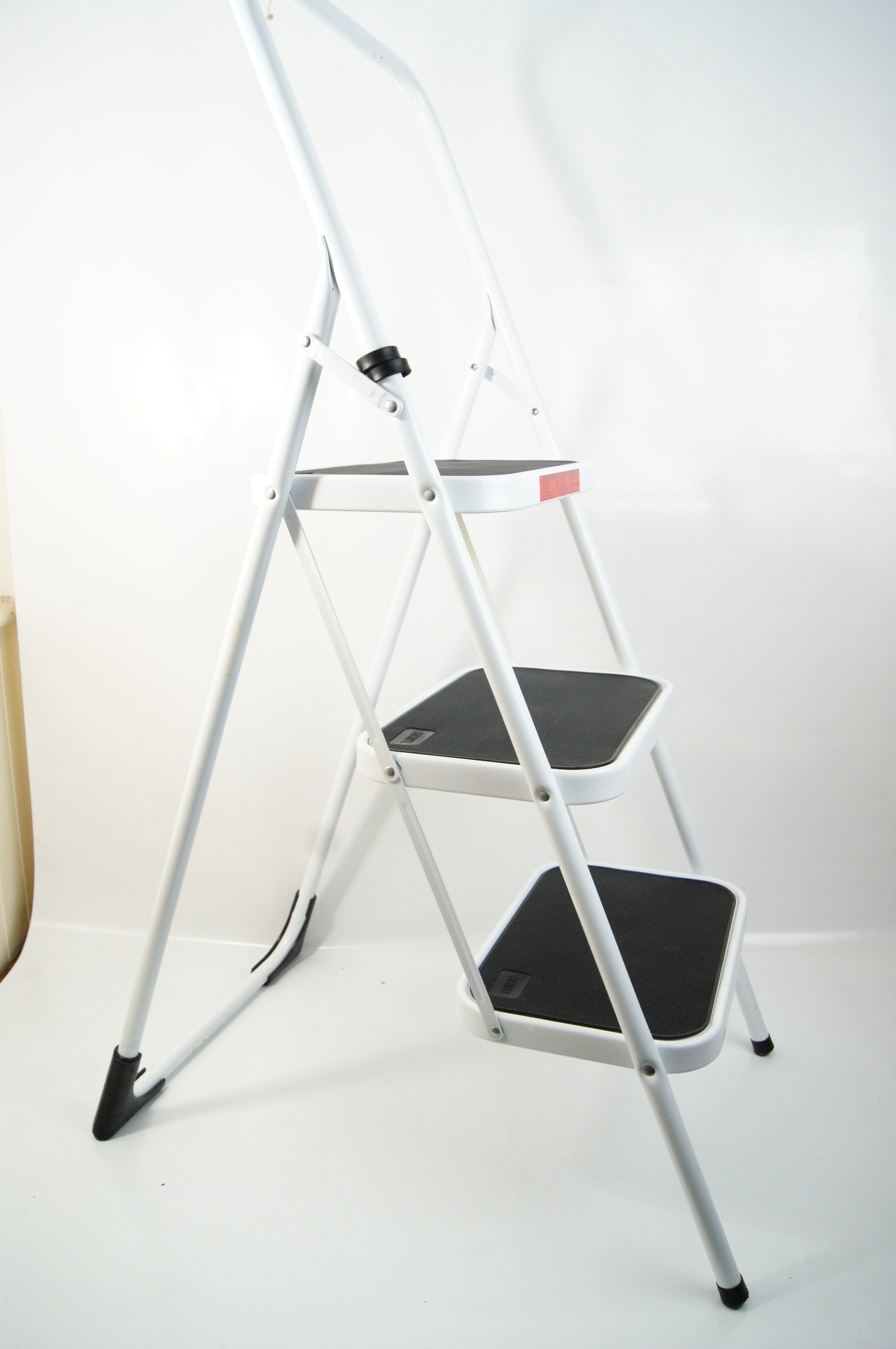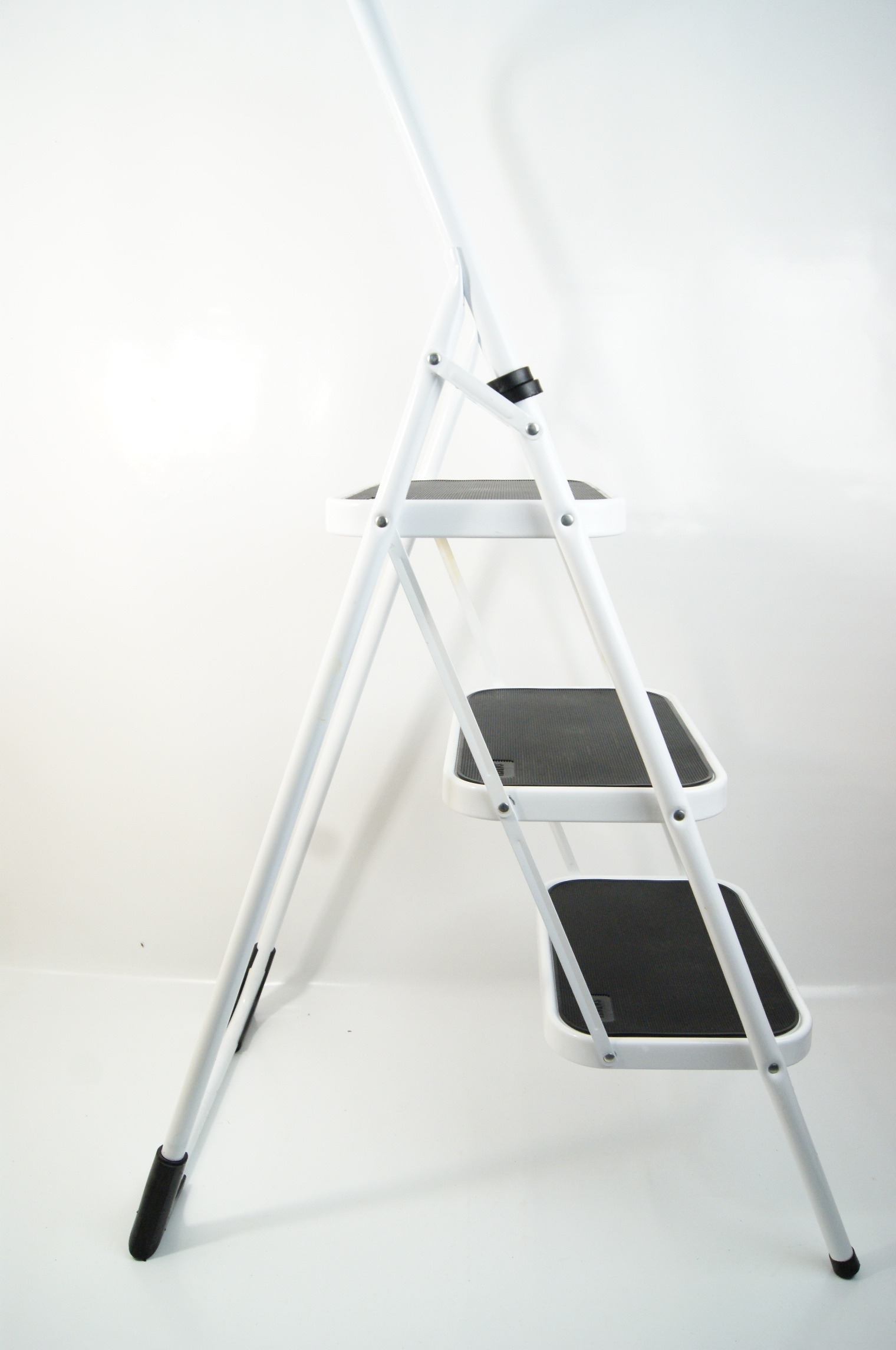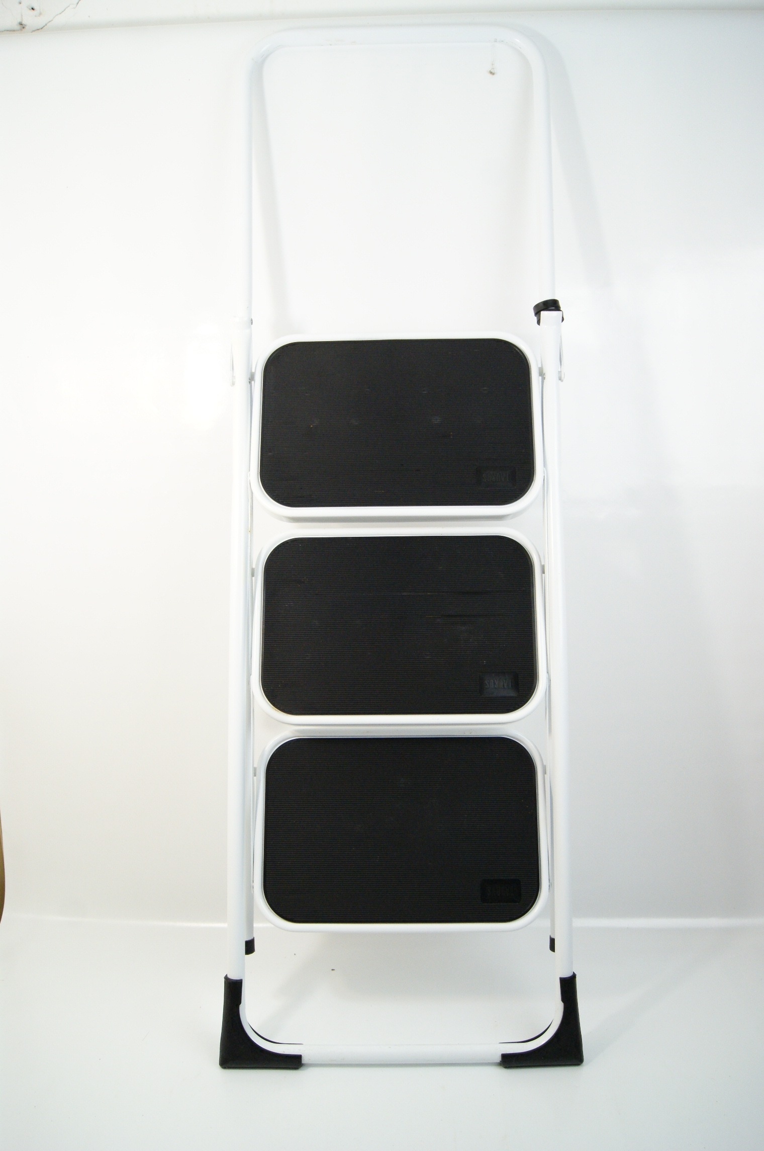 A folding three-step ladder manufactured by Taurus. The frame is constructed from white-painted tubular steel and features a tall, integrated curved safety handle at the apex. The ladder is fitted with three wide, rectangular steps, each containing a black, non-slip textured rubberised tread. These treads are embossed with the Taurus maker mark. The unit is designed to fold flat for storage and includes black plastic non-slip feet to the base.