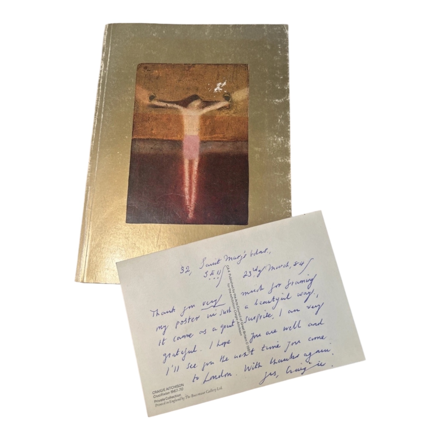 Included with the catalogue is a handwritten and signed postcard by Craigie Aitchison, dated 23 March 1984, thanking the recipient for framing one of his posters. The note is signed “Yrs, Craigie”, providing a personal piece of correspondence from the artist.