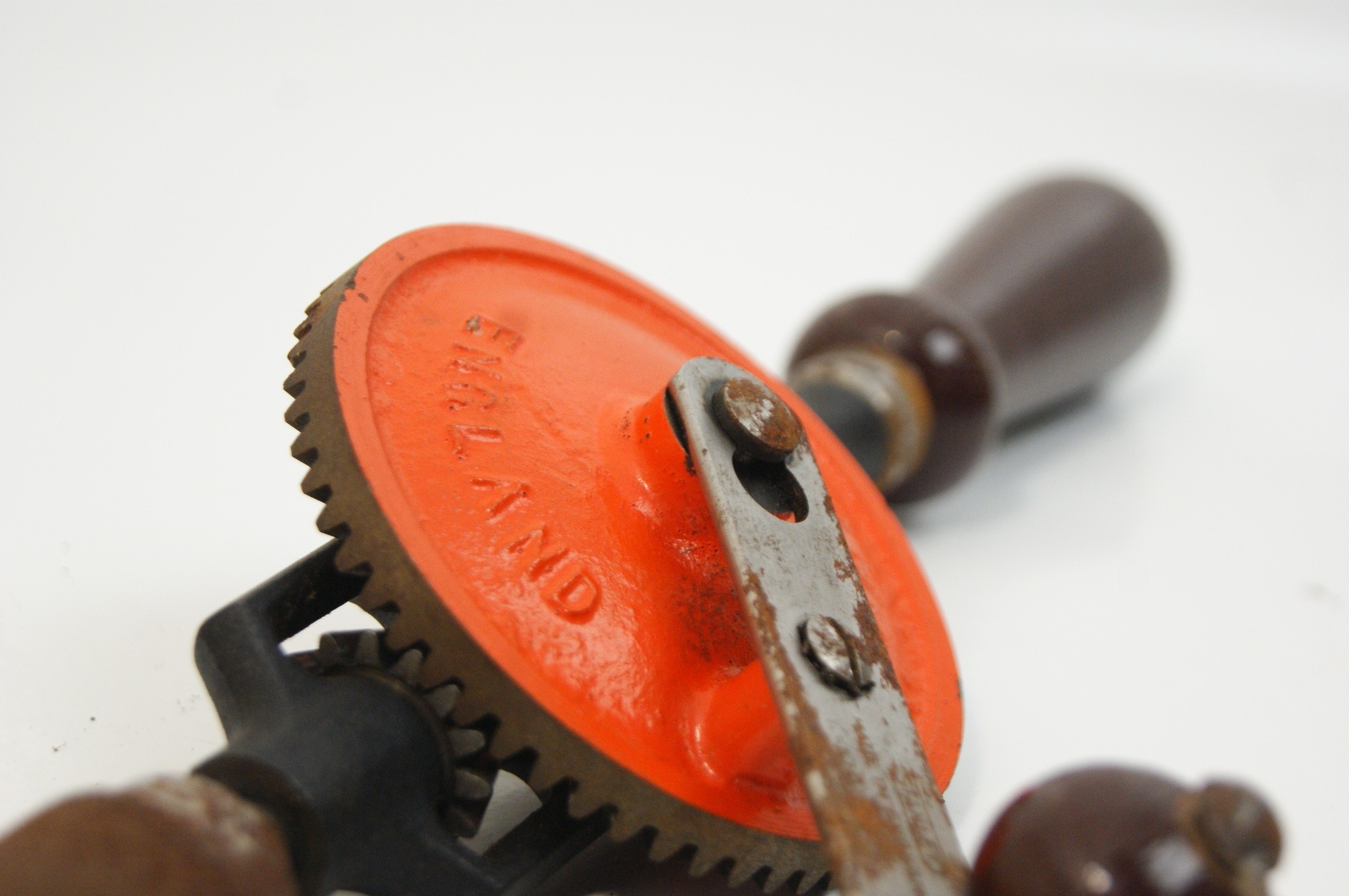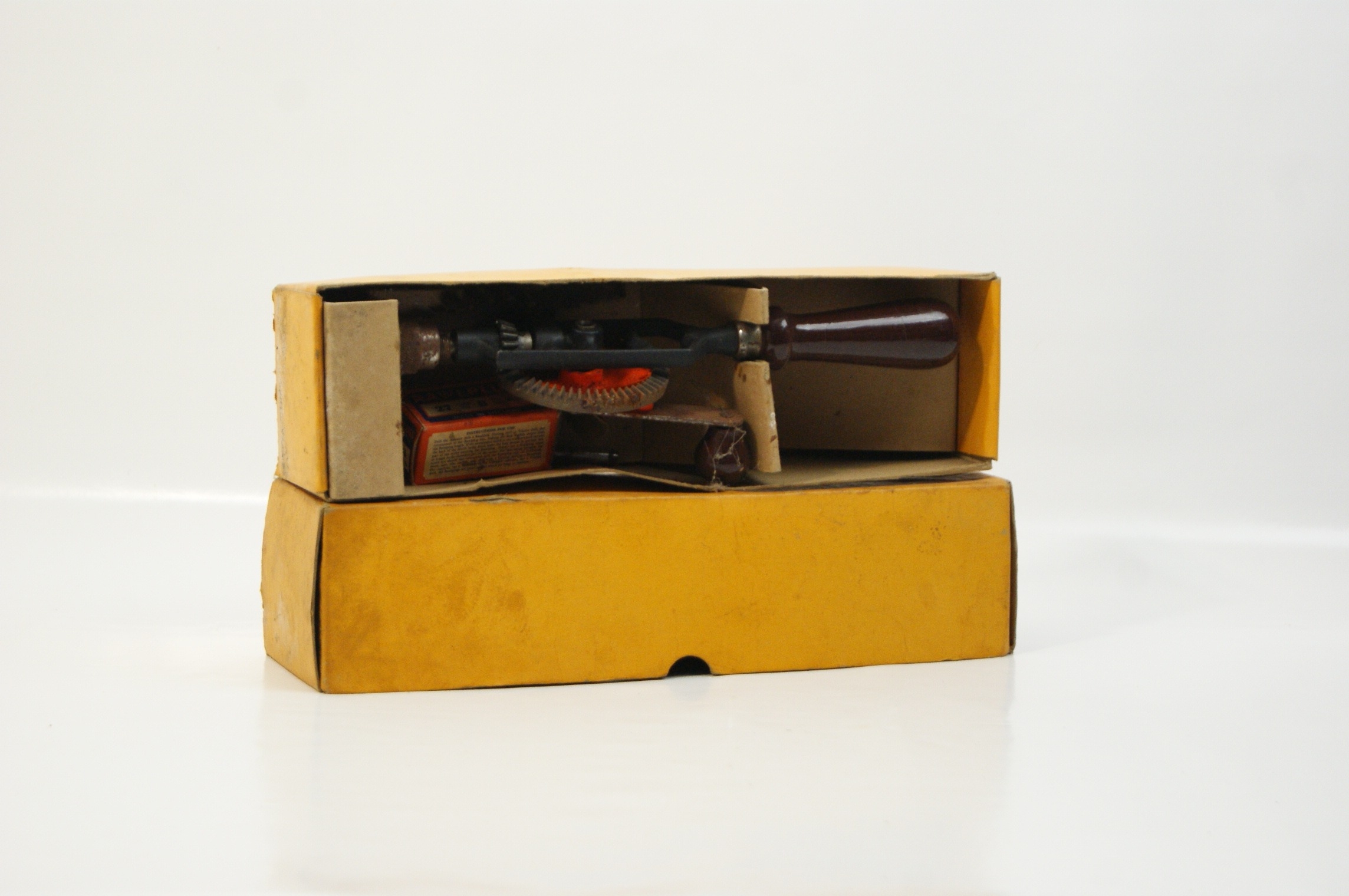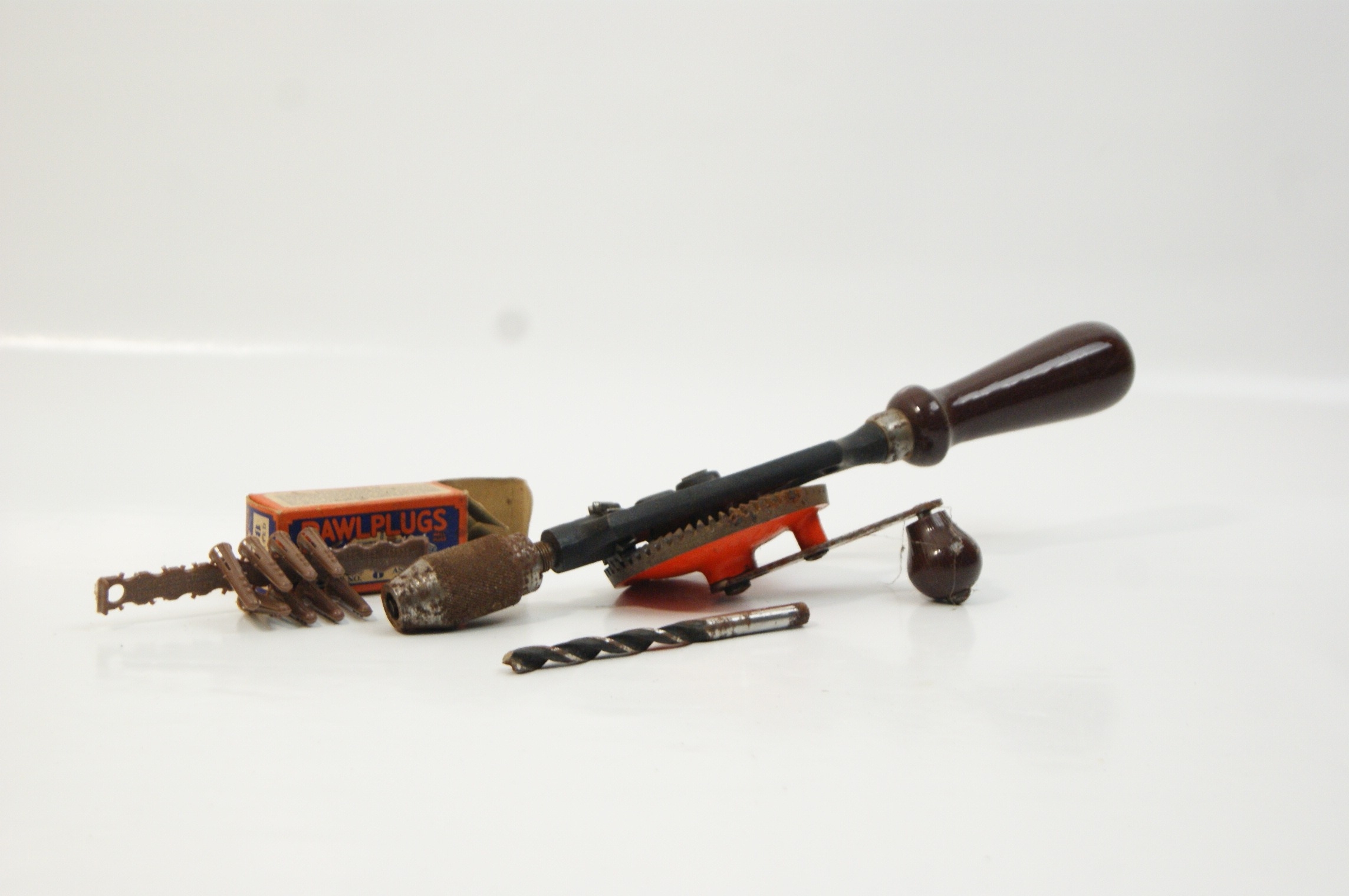 A classic mid 20th century Stanley hand drill, finished in black japanned metal with a bright enamel gear wheel and turned wooden handle, supplied in its original box with a selection of attachments and drill bits. The drill features the traditional geared mechanism for smooth manual operation, with the distinctive Stanley design combining durability with ergonomic comfort. Included are various period accessories, together with a vintage box of Rawlplugs, enhancing the completeness and period appeal of the set.