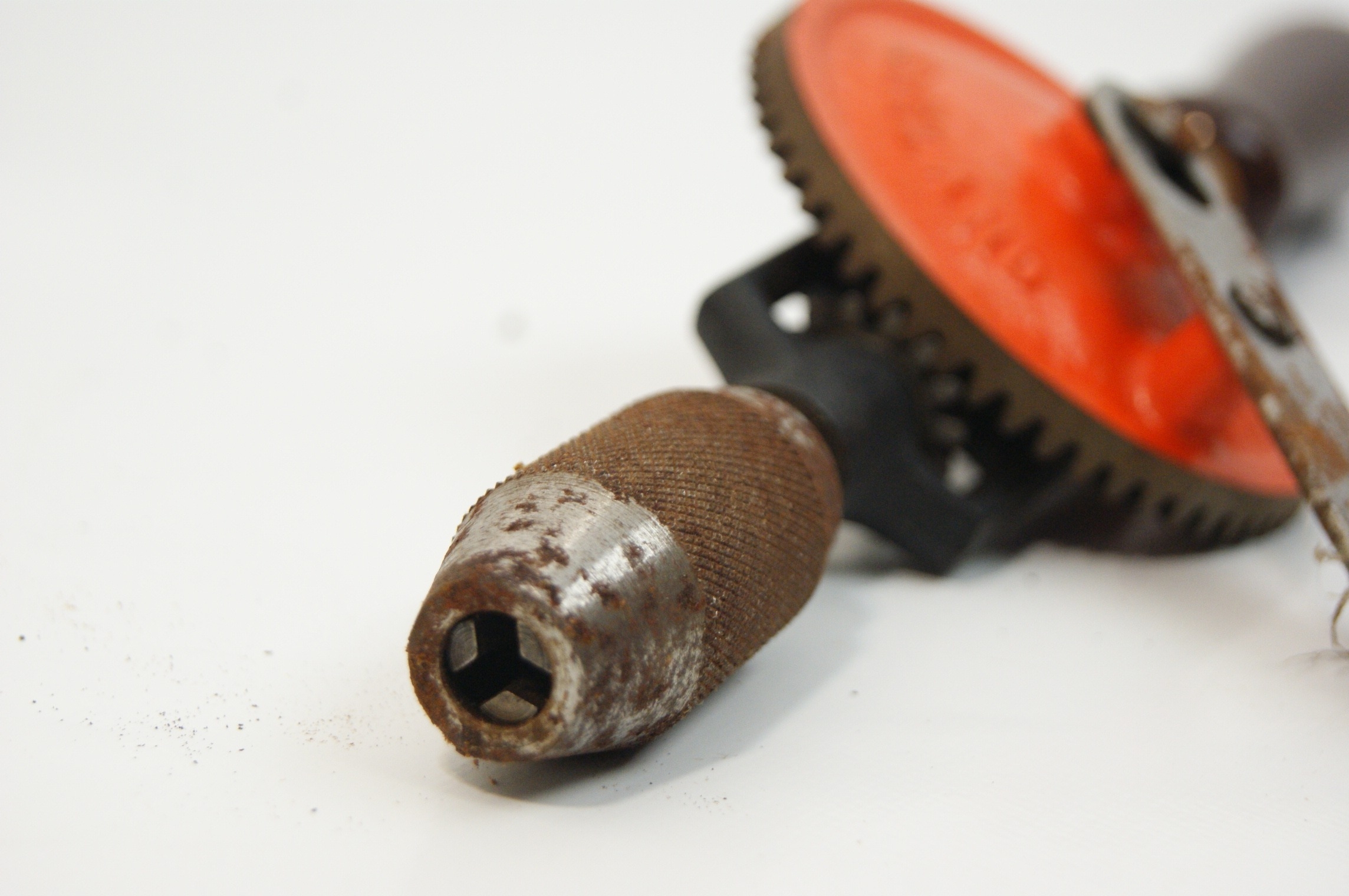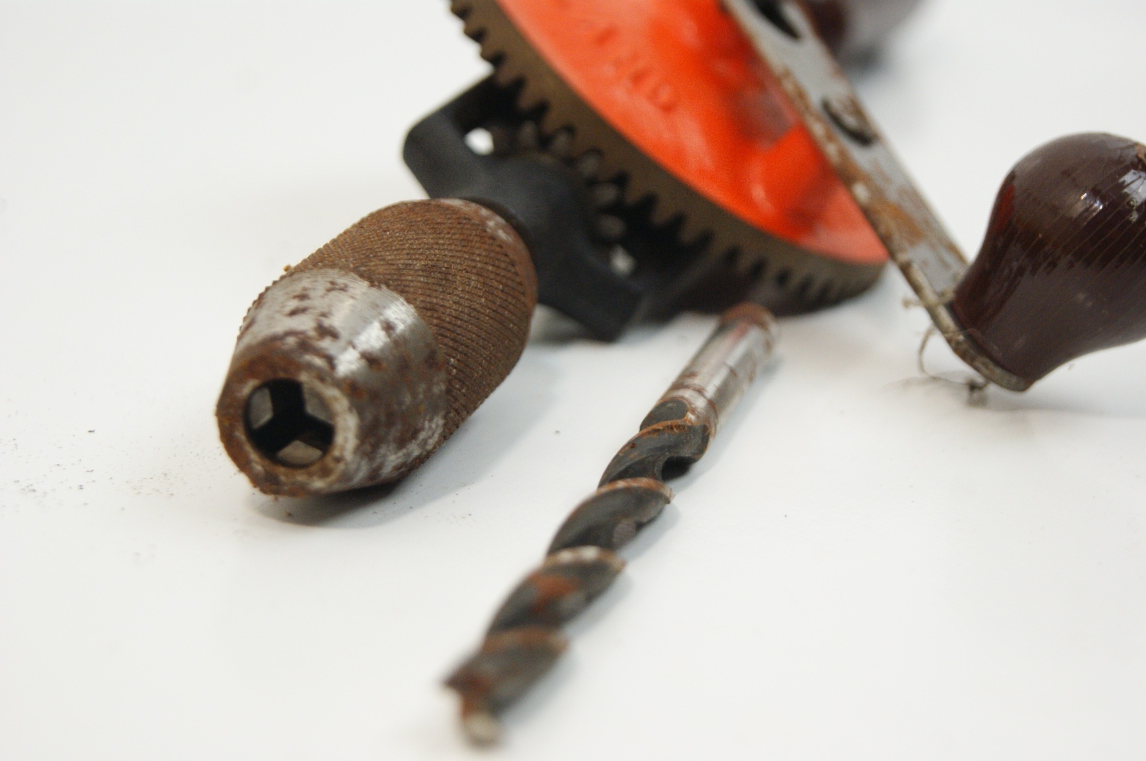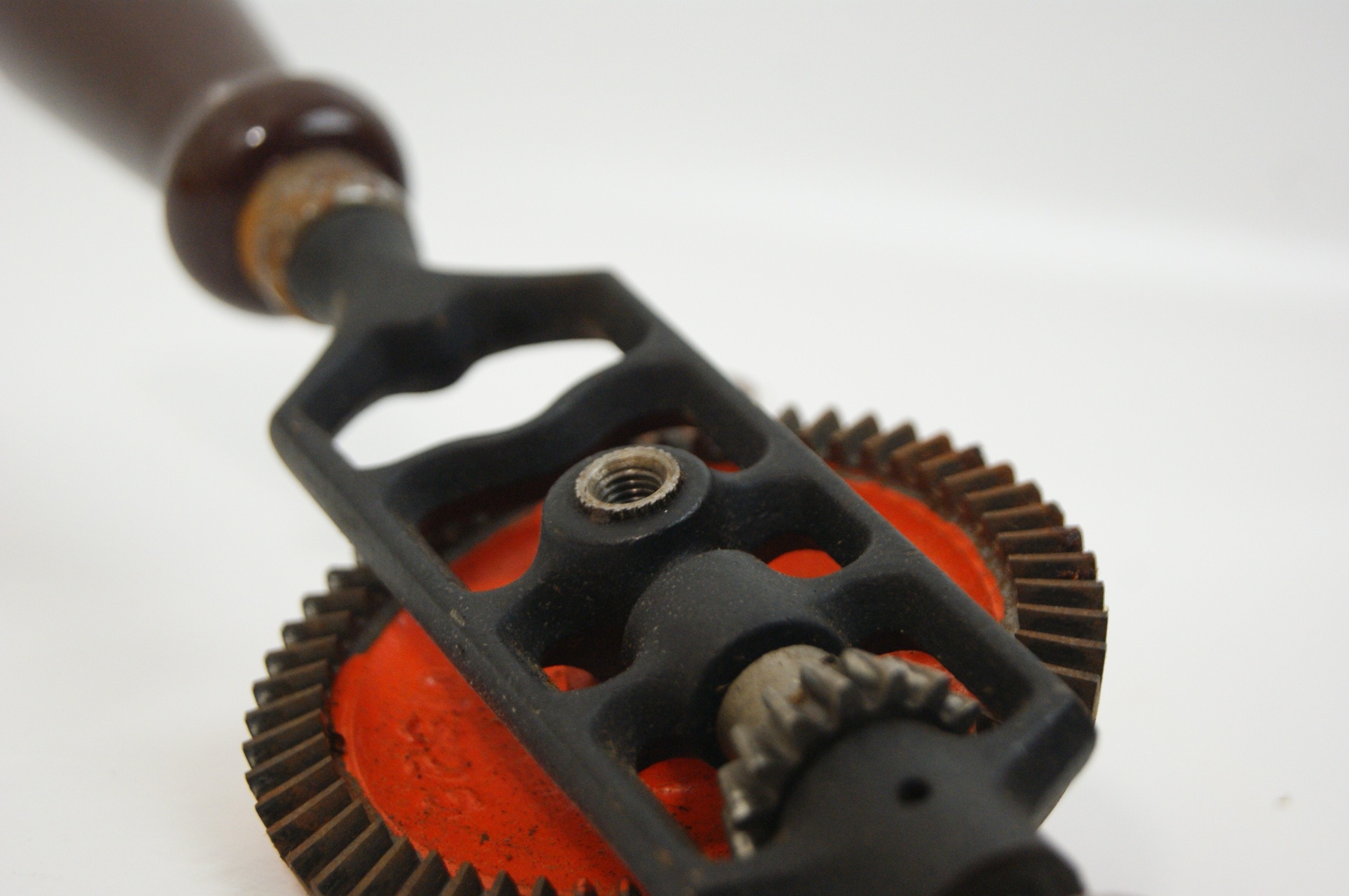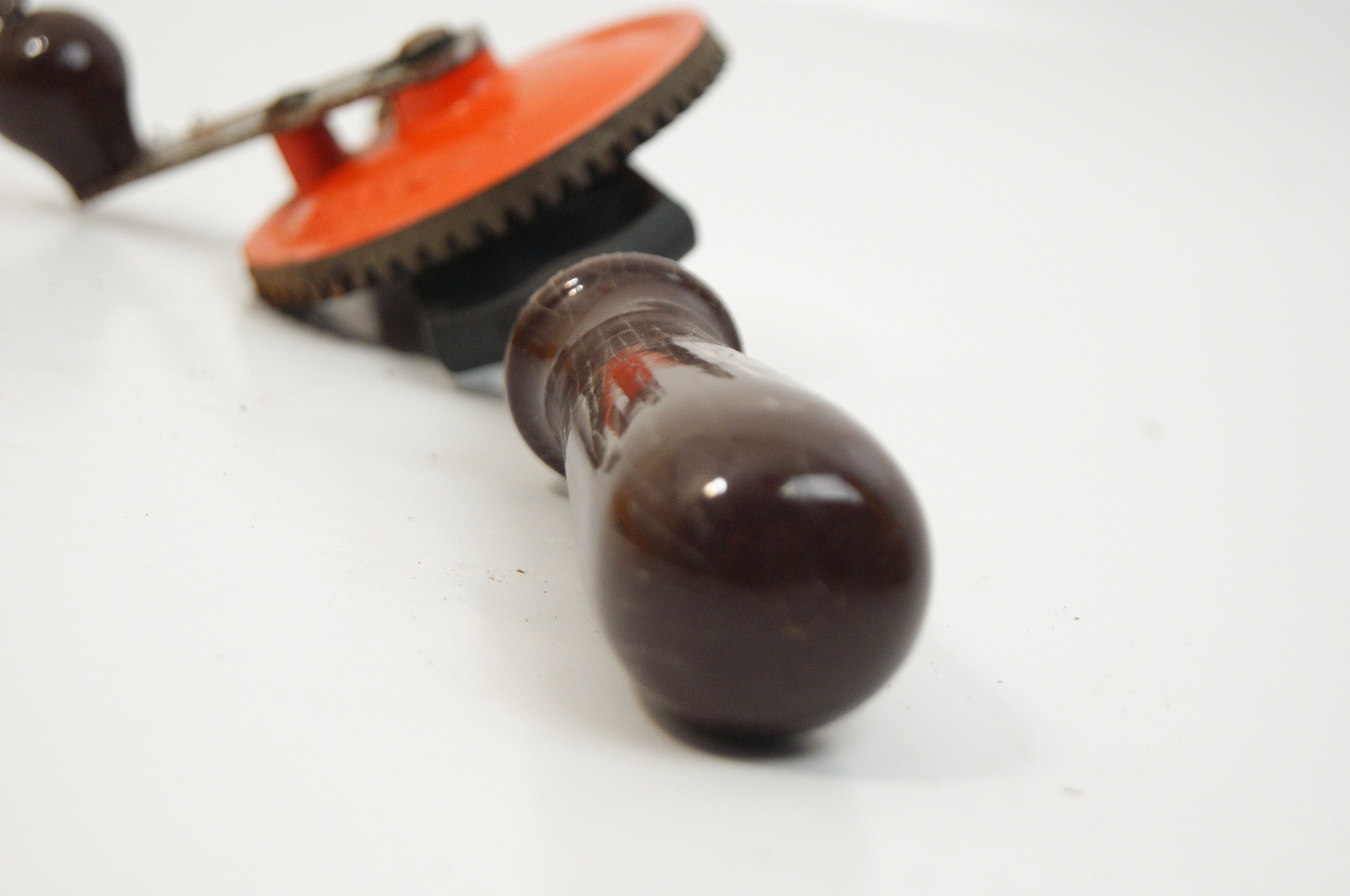 A classic mid 20th century Stanley hand drill, finished in black japanned metal with a bright enamel gear wheel and turned wooden handle, supplied in its original box with a selection of attachments and drill bits. The drill features the traditional geared mechanism for smooth manual operation, with the distinctive Stanley design combining durability with ergonomic comfort. Included are various period accessories, together with a vintage box of Rawlplugs, enhancing the completeness and period appeal of the set.