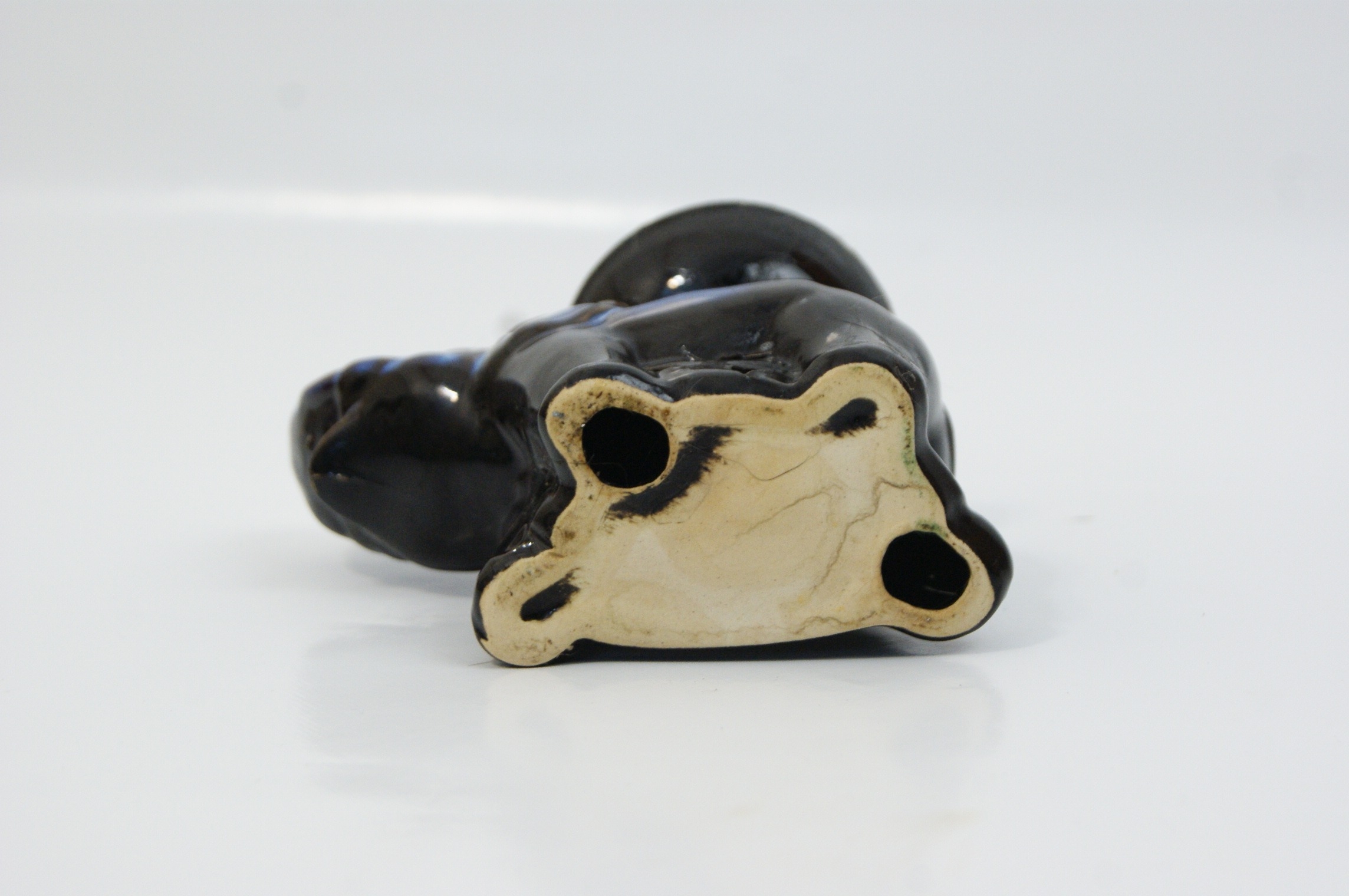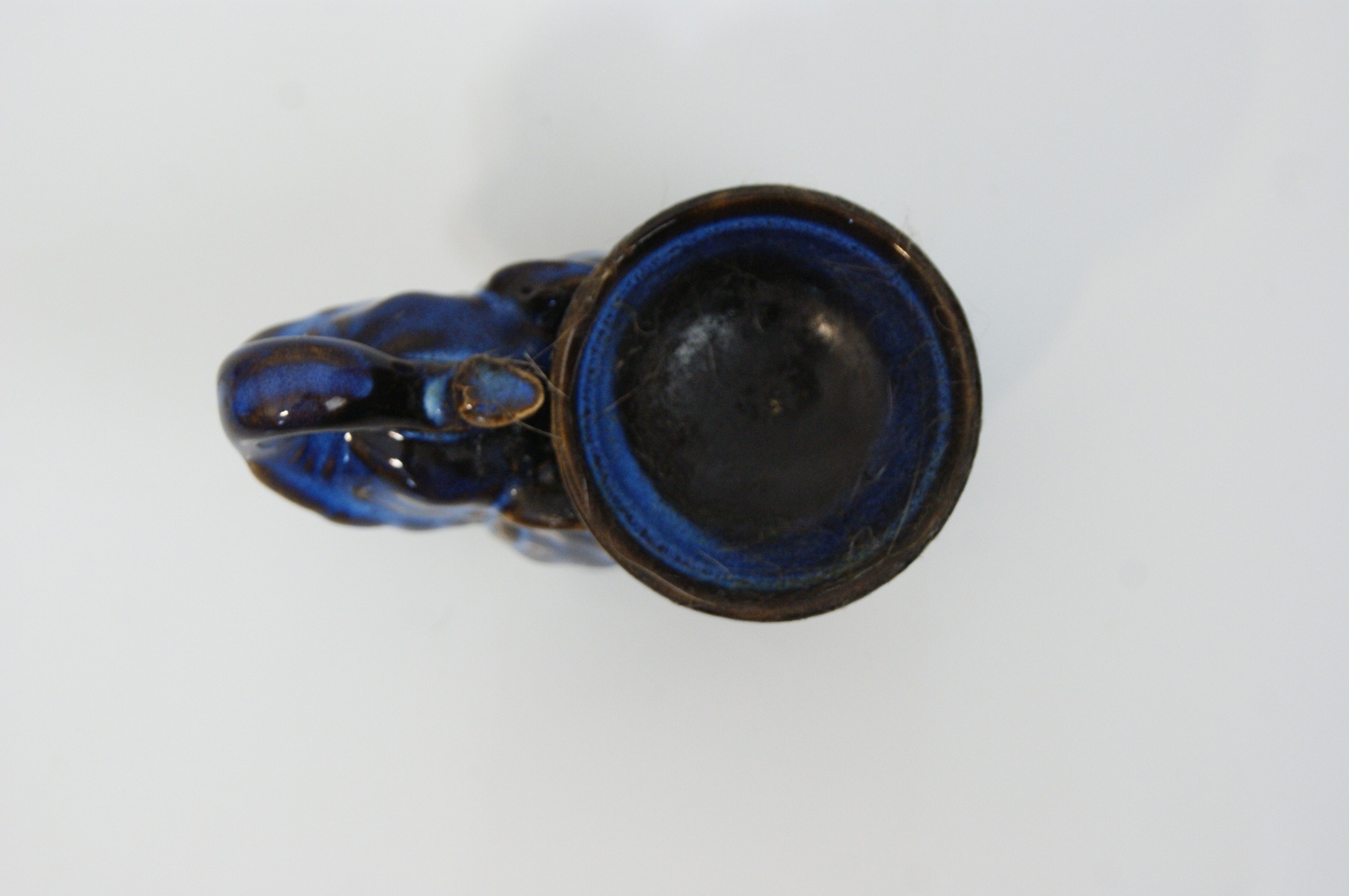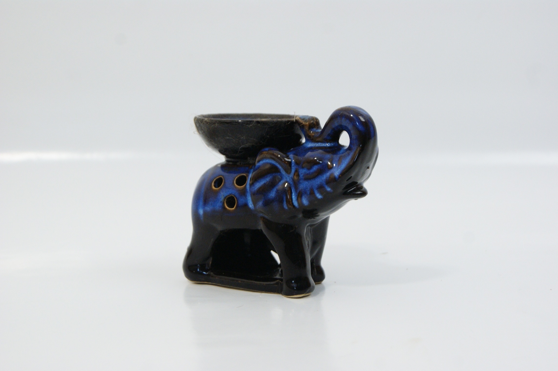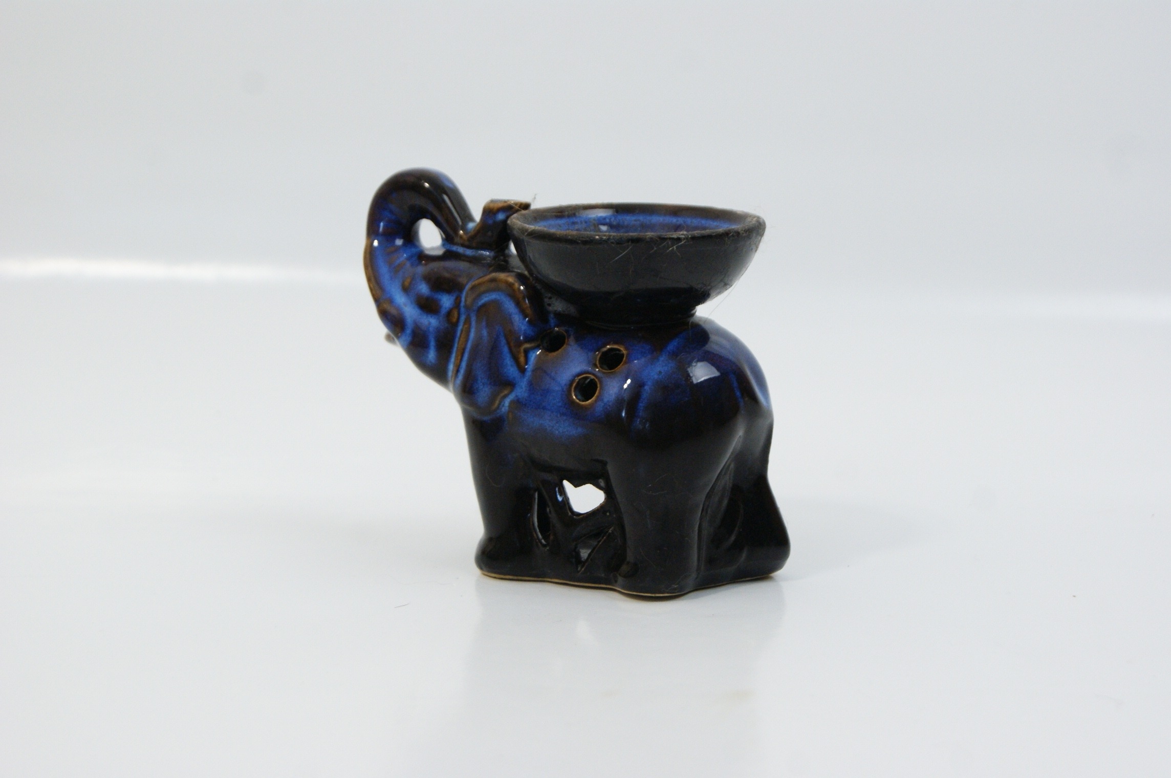A contemporary ceramic oil burner modelled in the form of a standing elephant with its trunk raised. The figure features a shallow integral bowl on its back for essential oils and water. The body is pierced with six small circular ventilation holes and the underside is hollow to accommodate a tea light candle. The item is finished in a mottled reactive glaze of deep blue and black. No maker’s marks or model numbers are present. Height: Not recorded.