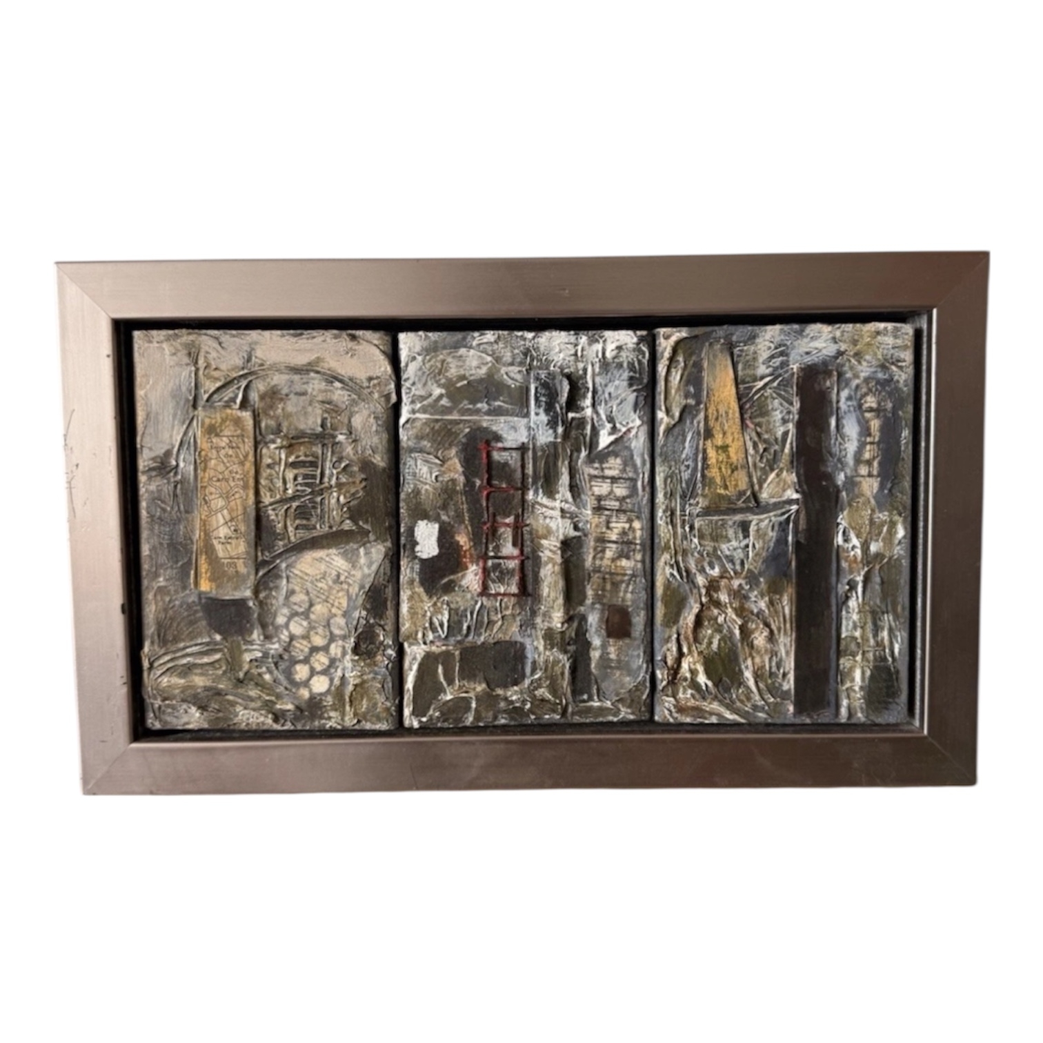 A striking original mixed media work by Cornish artist John Higgins, titled End of an Era II and dated 2012. The composition is formed from three textured wooden panels set within a brushed aluminium frame, combining acrylic paint with layered materials to create a richly tactile surface. The imagery evokes rural architecture, landscape fragments, and abstract structural forms, reflecting themes of change within the Cornish countryside.