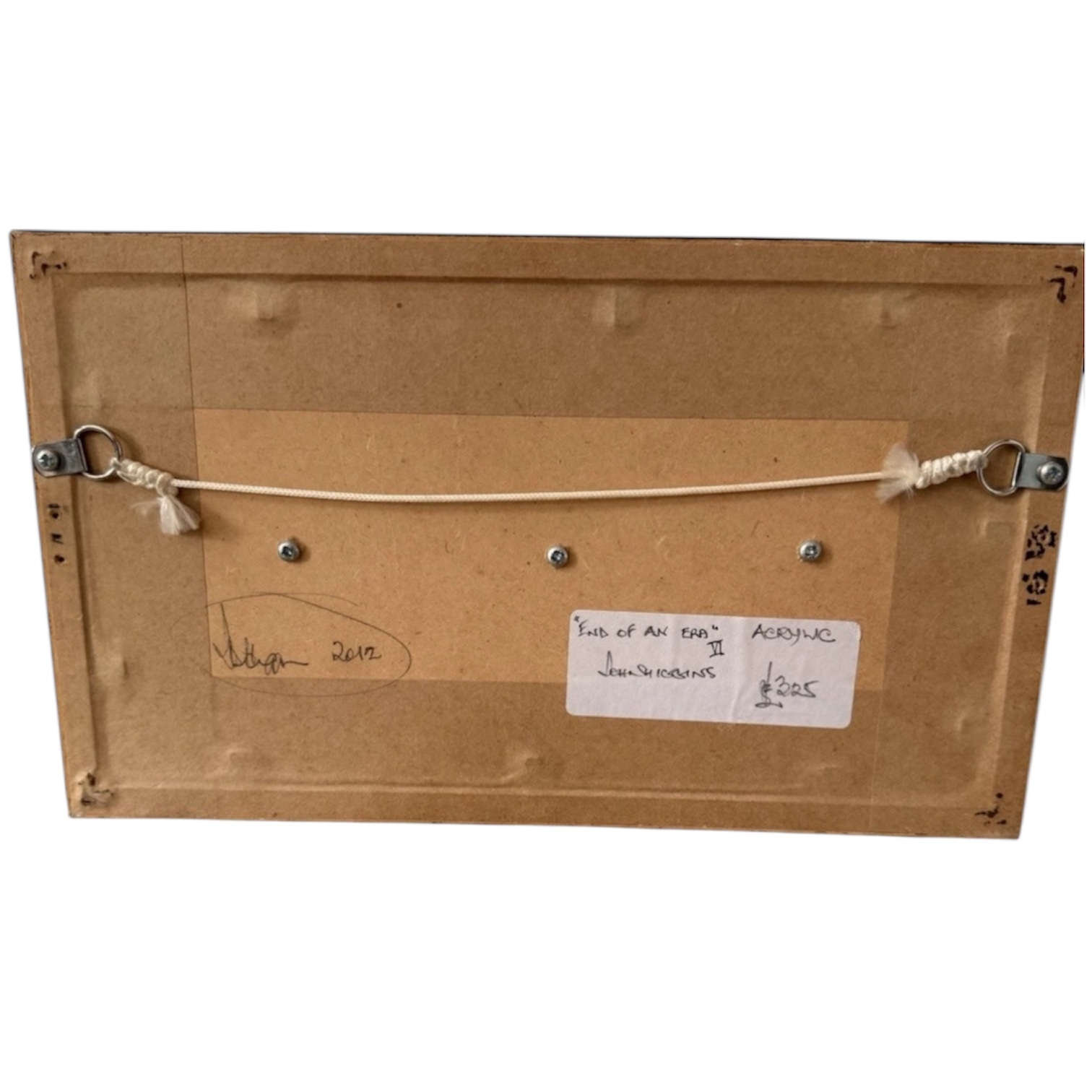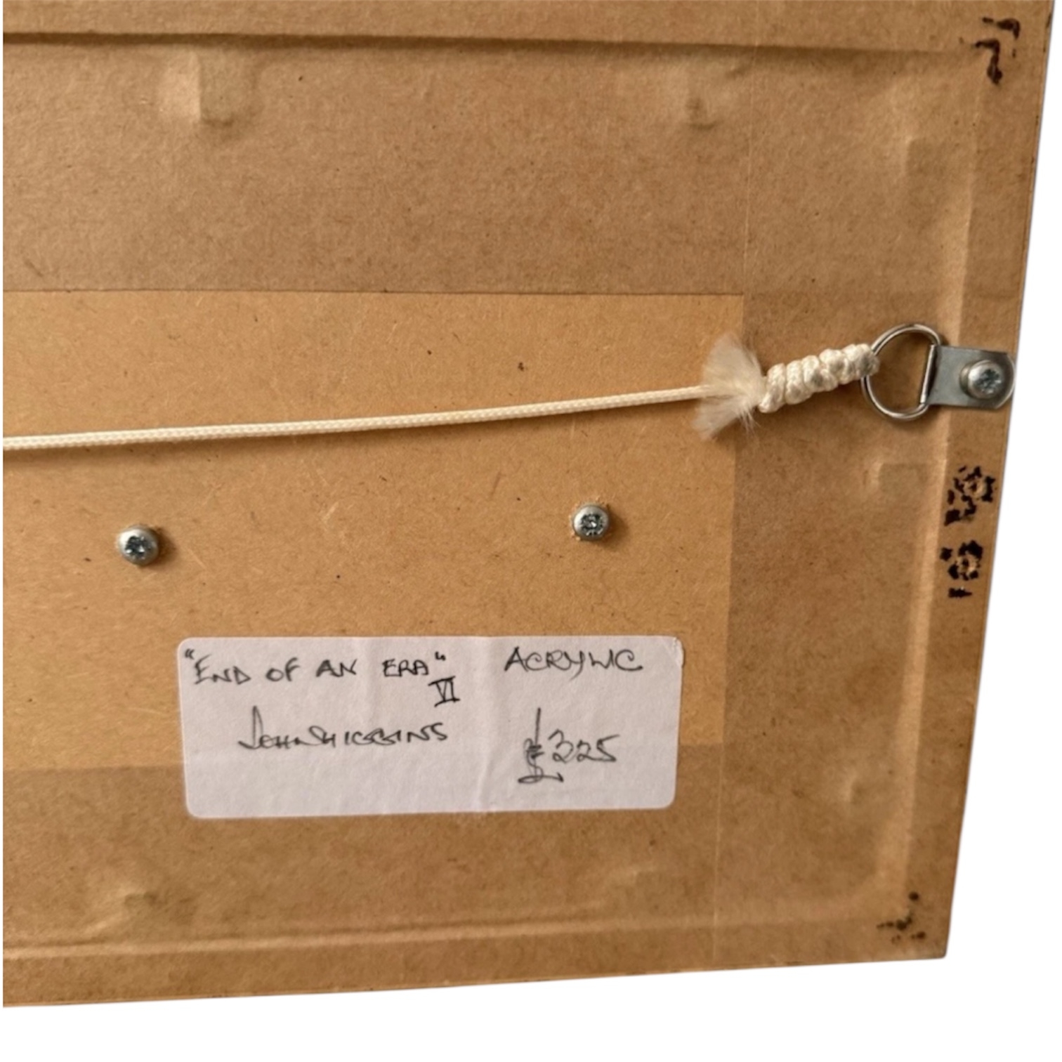 Signed and dated John Higgins 2012 to the reverse, with artist’s label reading “End of an Era II – Acrylic – £325.” Higgins is associated with the St Ives artistic tradition and is known for expressive, textural works exploring Cornwall’s landscape and heritage.