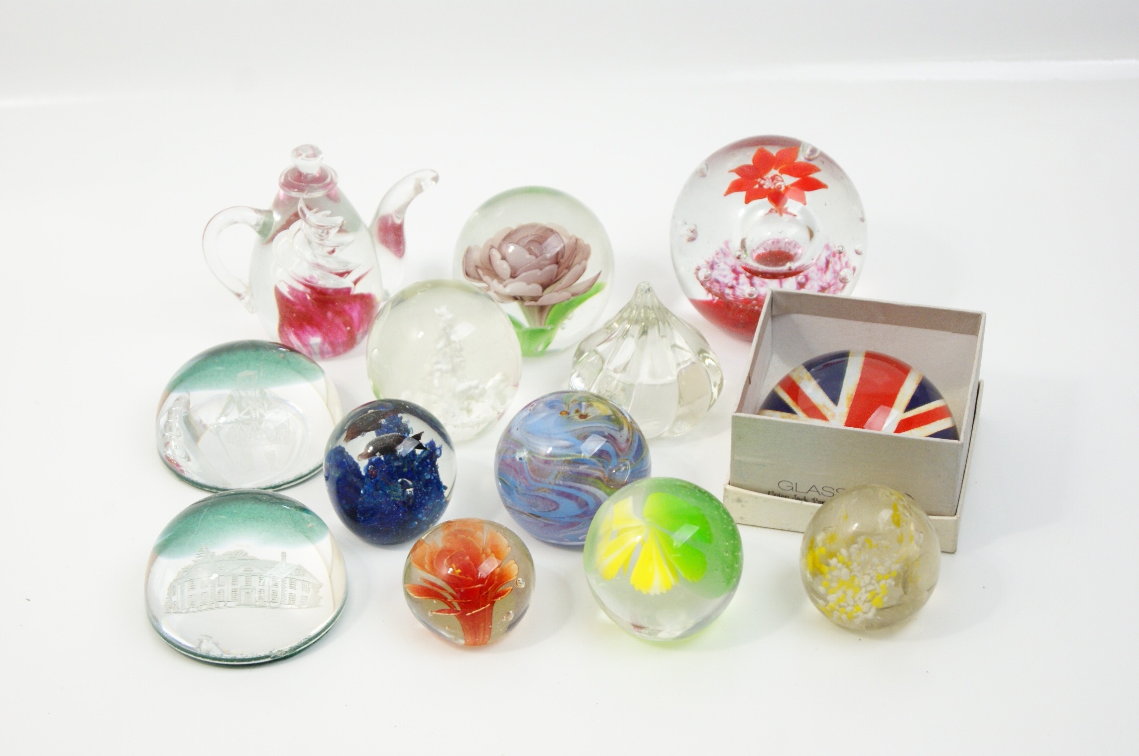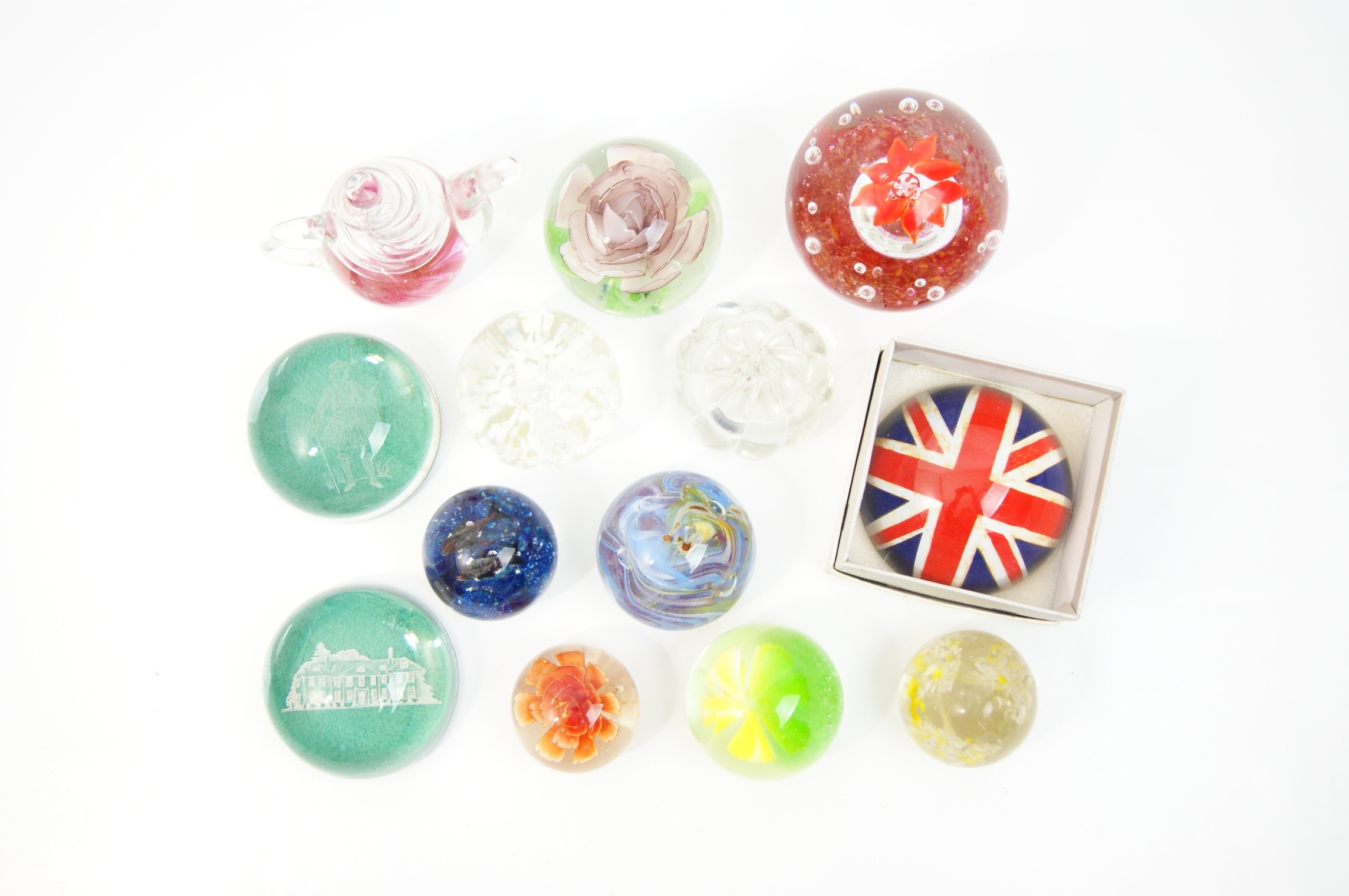 A collection of thirteen decorative glass items comprising twelve paperweights and one miniature teapot. The assortment includes several floral lampwork designs: a large paperweight featuring a red flower over a pink base with controlled bubbles, a medium paperweight with a mauve rose and green foliage, and a smaller example with an orange flower. One small paperweight contains scattered yellow and white millefiori-style chips. The pictorial items include two green-based paperweights with etched depictions of a stately home and a Scottish Highland soldier, a paperweight containing two dark fish over a blue textured coral-style formation with controlled bubbles, and one with a white opaque inclusion resembling a mountain peak. The collection also features a domed Union Jack paperweight presented in a partial cardboard box, an abstract swirl paperweight in blue and purple tones, a green internal layer paperweight with a regular pattern of controlled bubbles, and a clear faceted conical paperweight. The miniature teapot is constructed from clear blown glass with internal pink and magenta swirls.