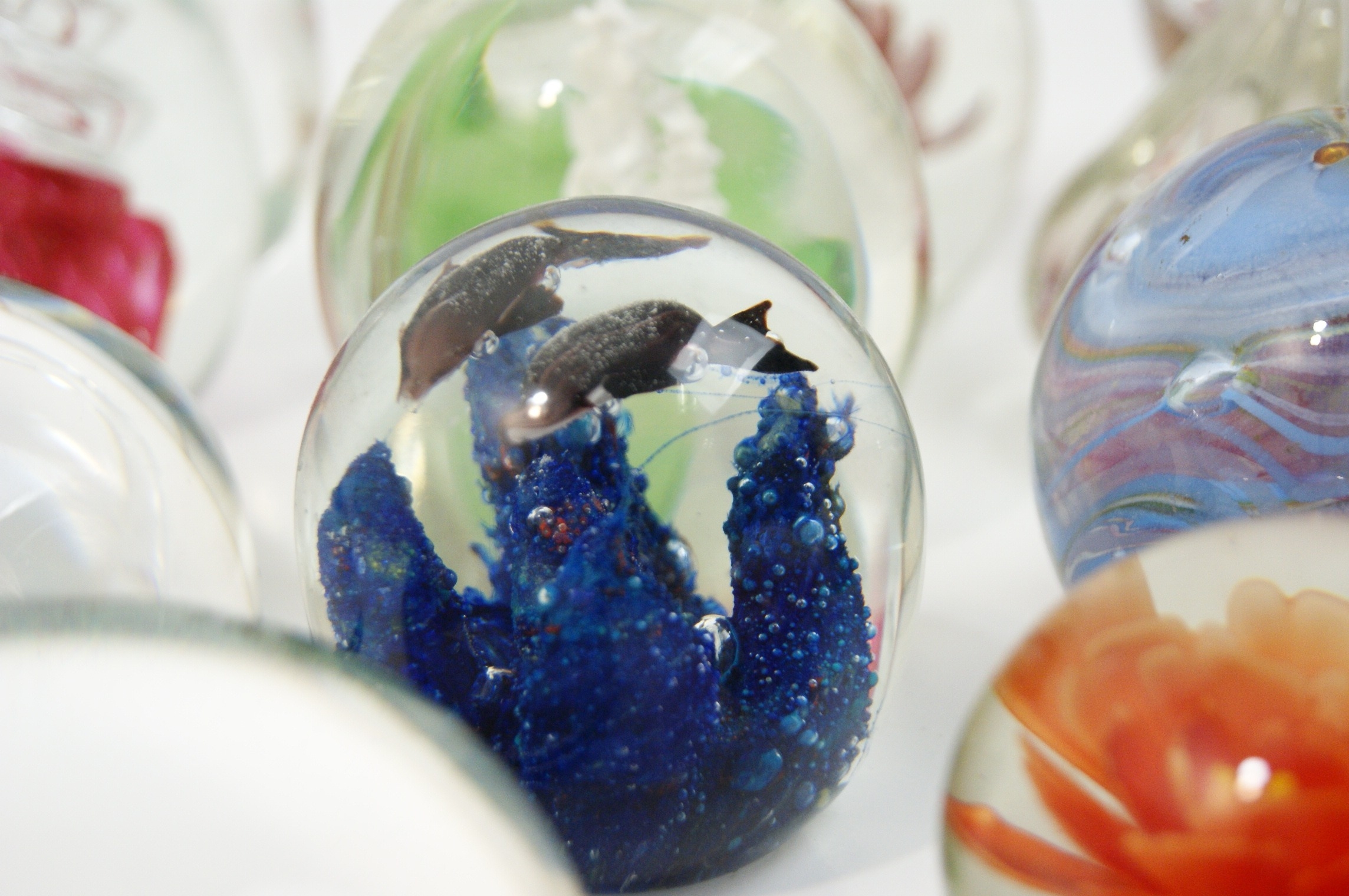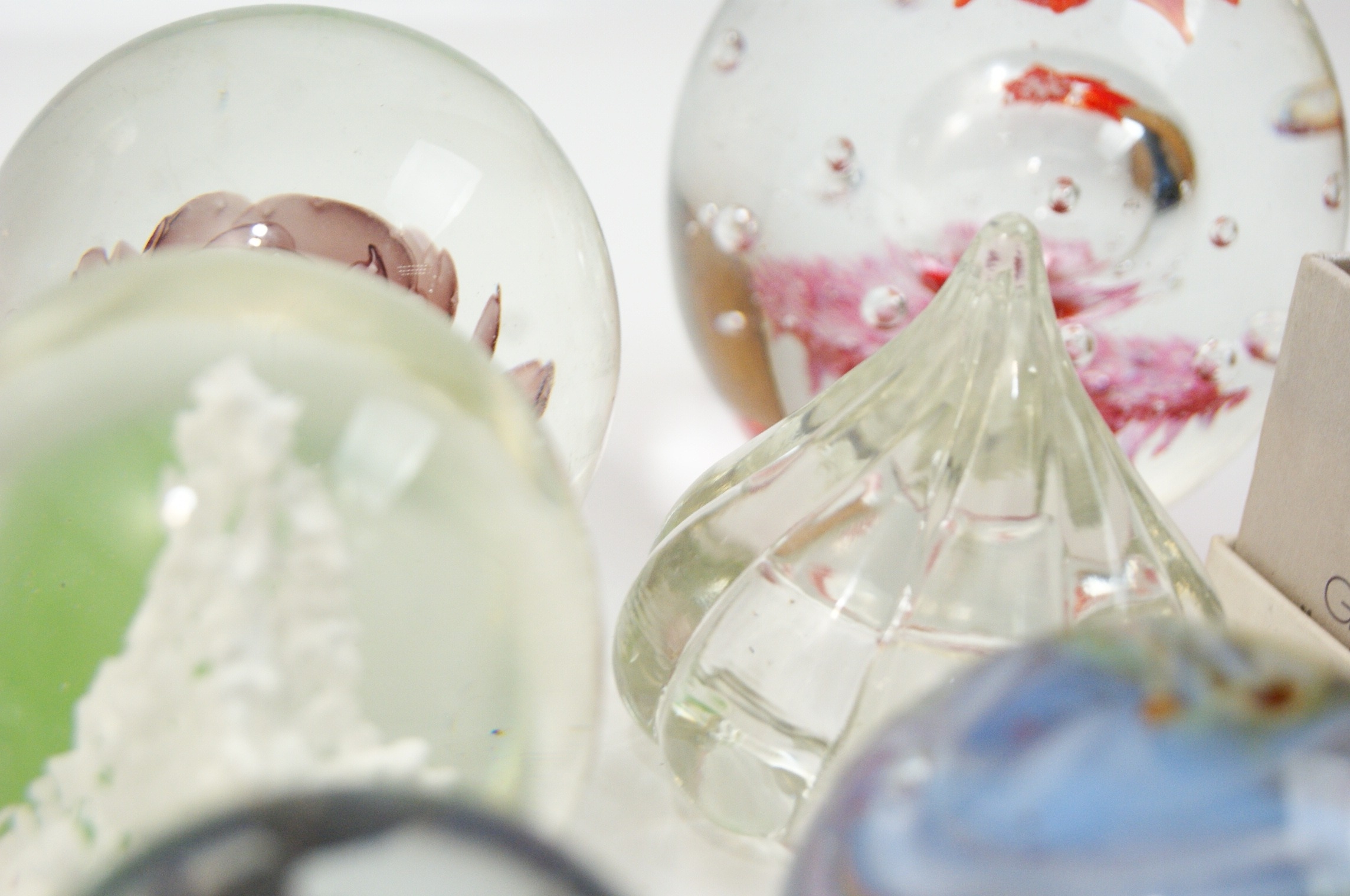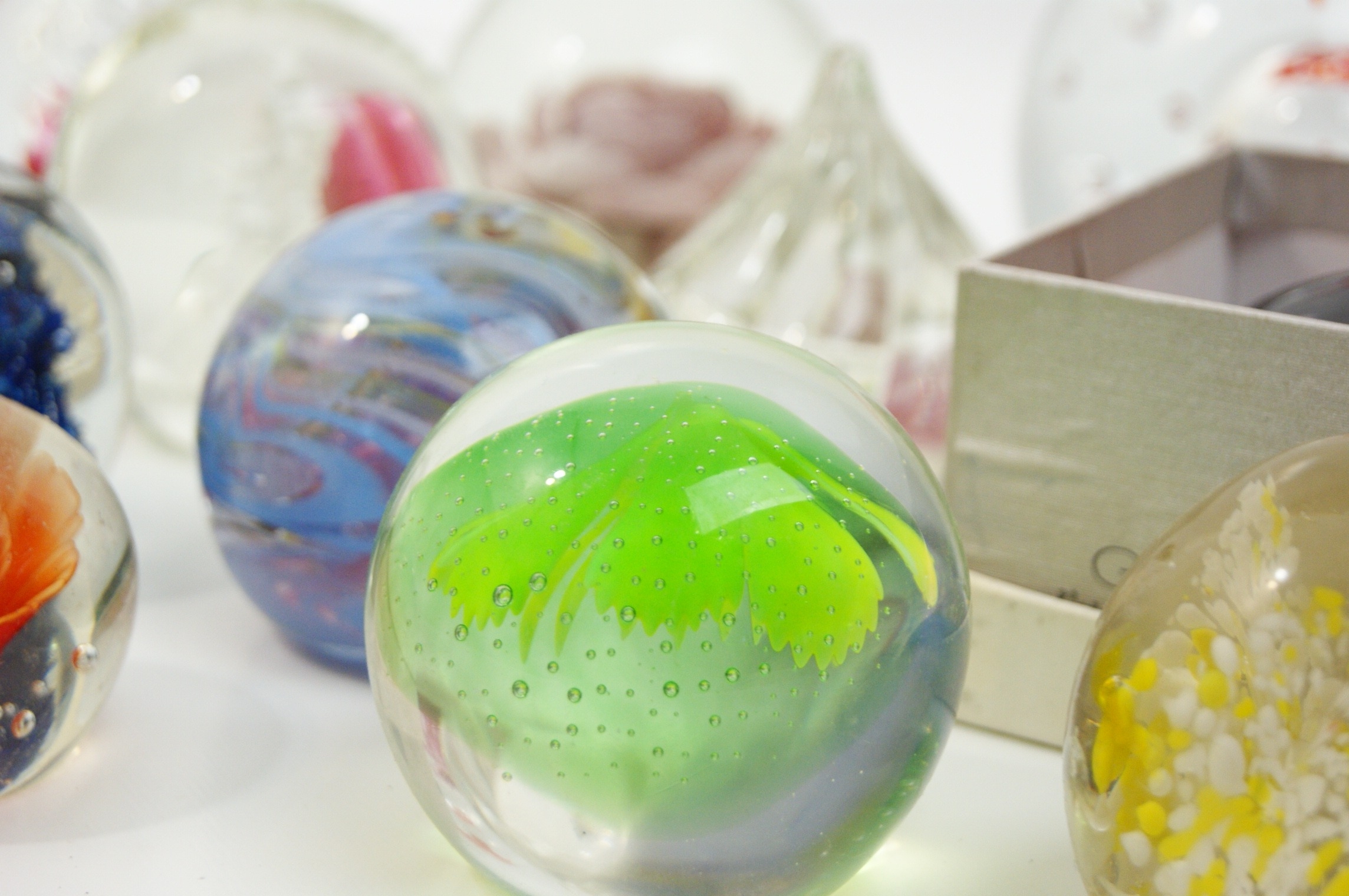 A Collection of Art Glass Paperweights and a Miniature Teapot
