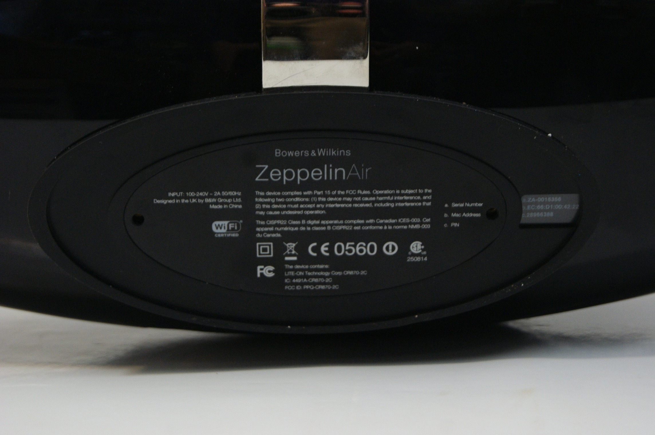A Bowers & Wilkins Zeppelin Air wireless speaker system featuring an elliptical design and an integrated 30-pin docking arm for legacy Apple devices. The unit is constructed with a black fabric grille and a glossy black rear housing, bisected by a chrome-finished metal band. The base is marked with the manufacturer name Bowers & Wilkins and the model Zeppelin Air. An identification sticker on the underside bears the serial number ZA-0016368. The rear interface includes ports for power, Ethernet, USB, 3.5mm AUX, and composite video output. This model supports AirPlay wireless connectivity alongside the physical docking interface.