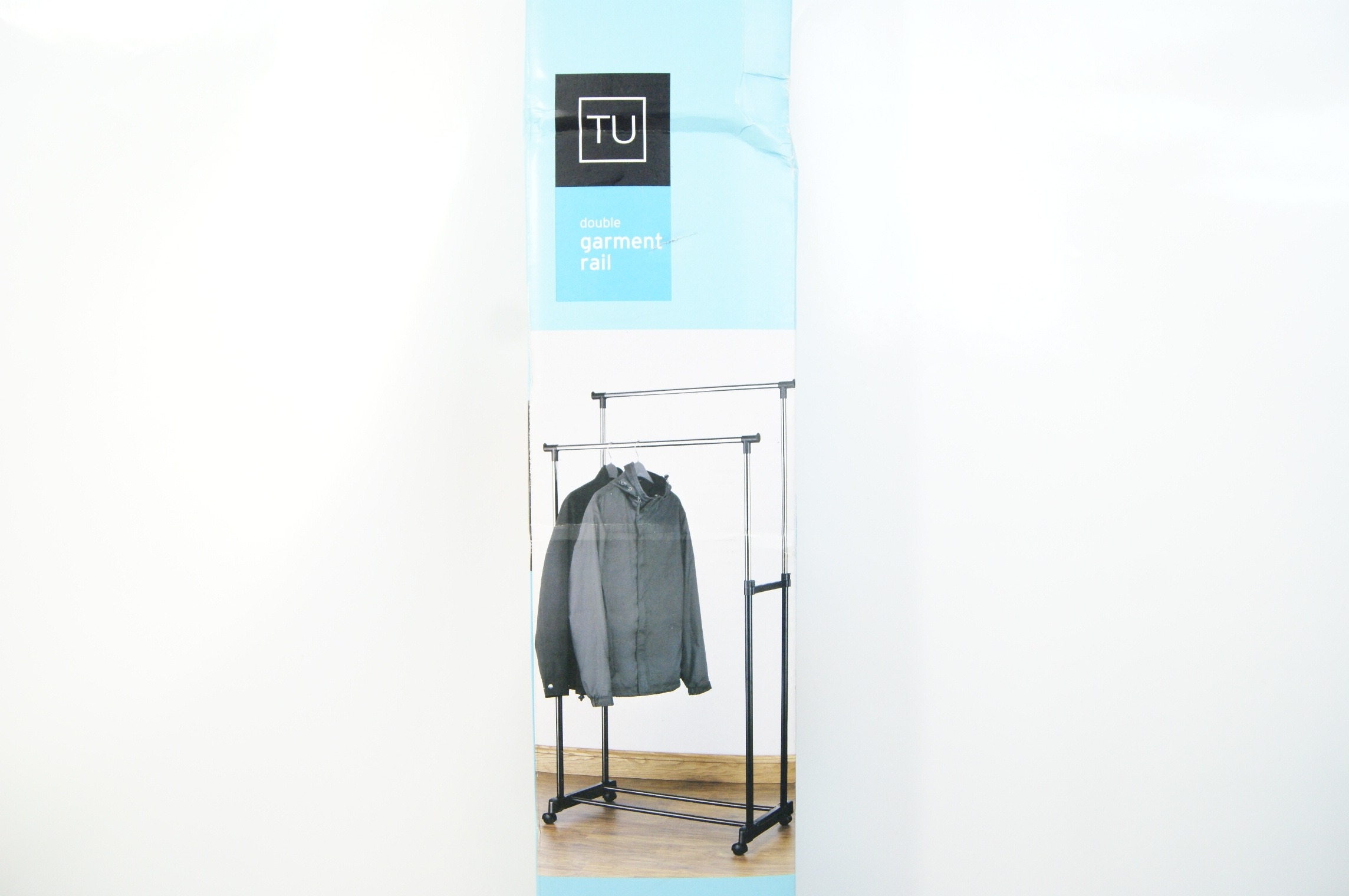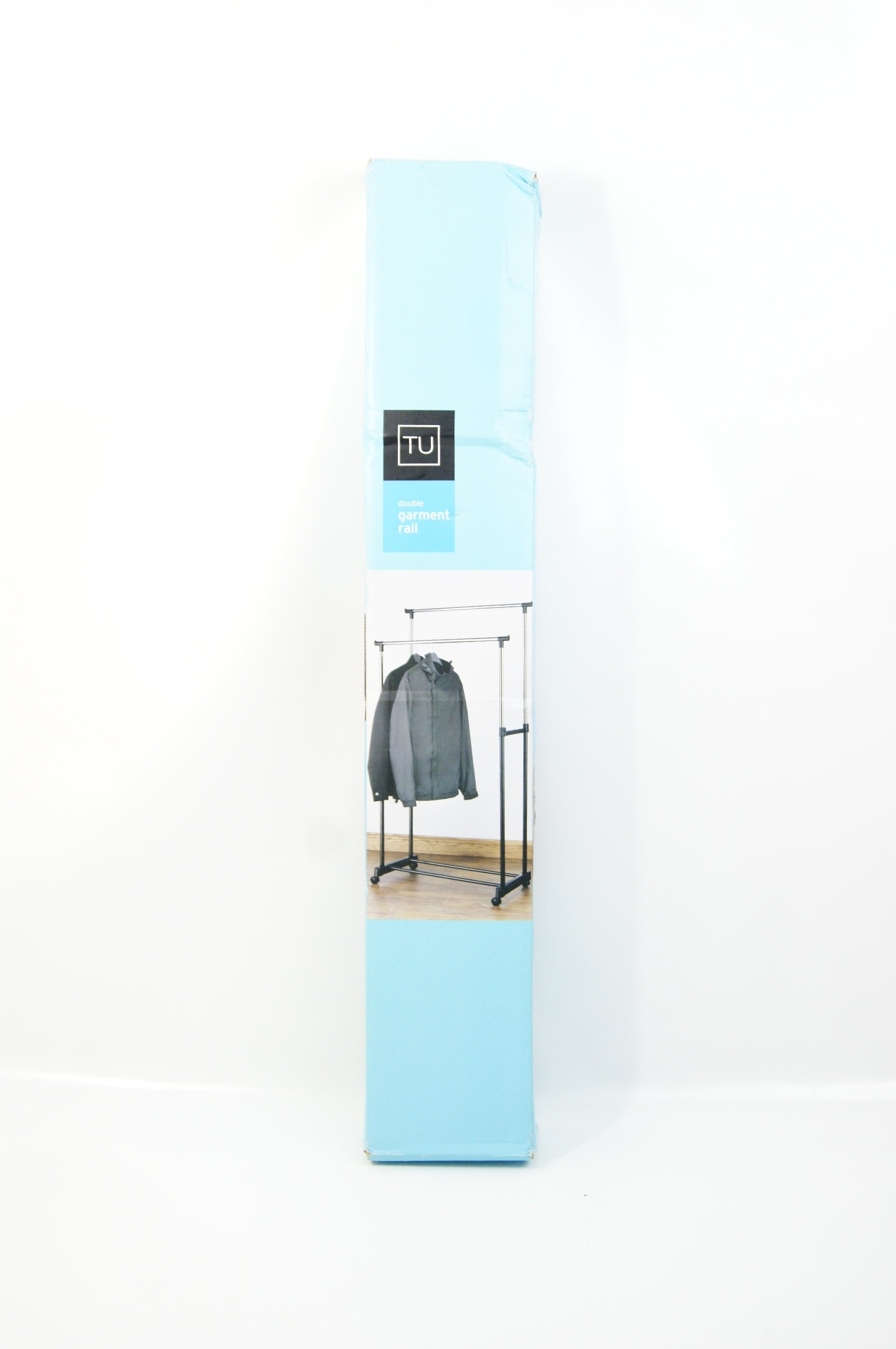 A Tu brand double garment rail, contained within its original retail packaging. The item is a two-tiered clothing rack featuring a black metal frame and is equipped with castors for movement. The packaging displays a photographic representation of the product, illustrating two parallel hanging bars at staggered heights. The box bears the Tu logo, consisting of a white T and U inside a black square, and is labelled as a double garment rail.