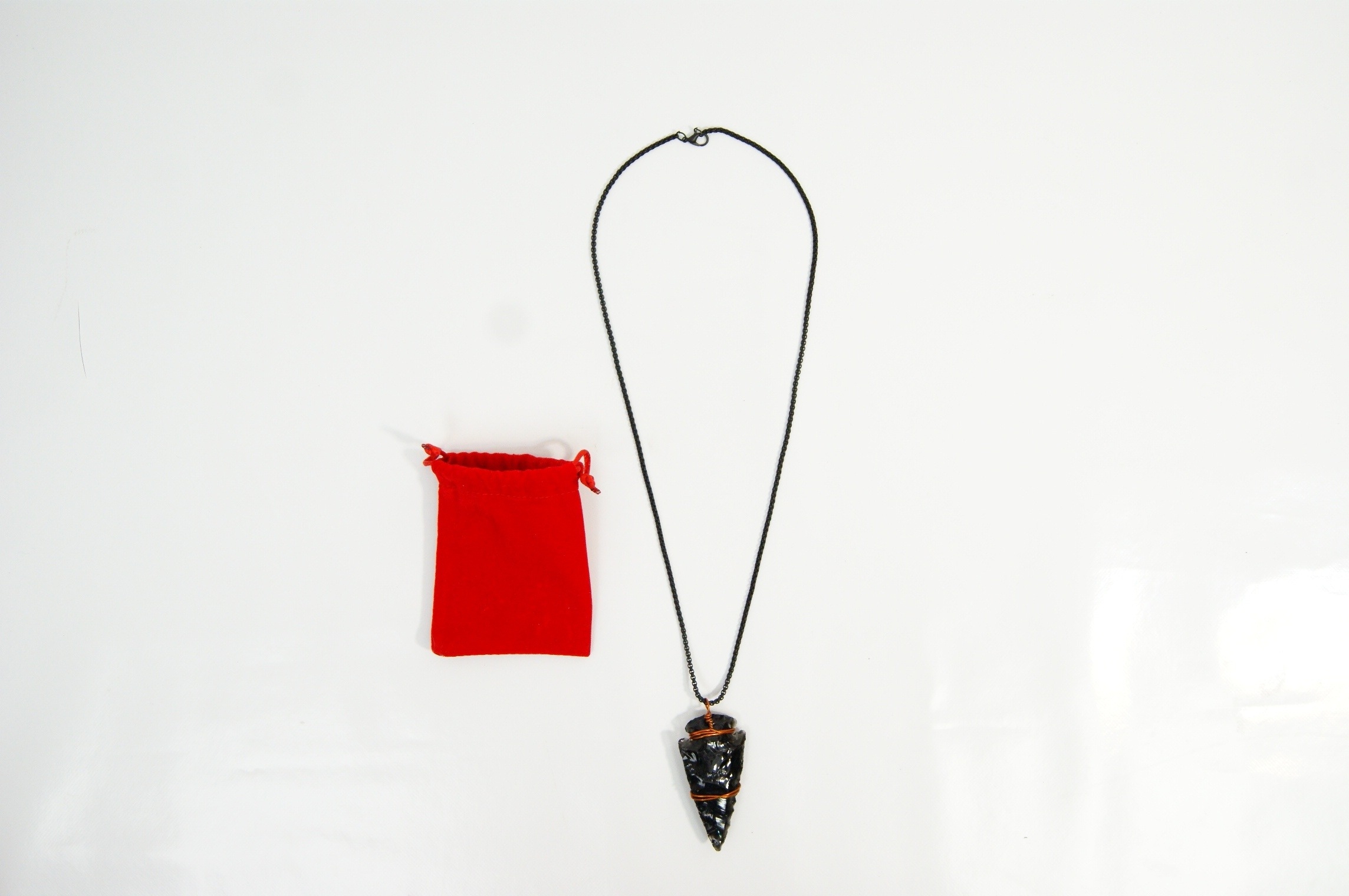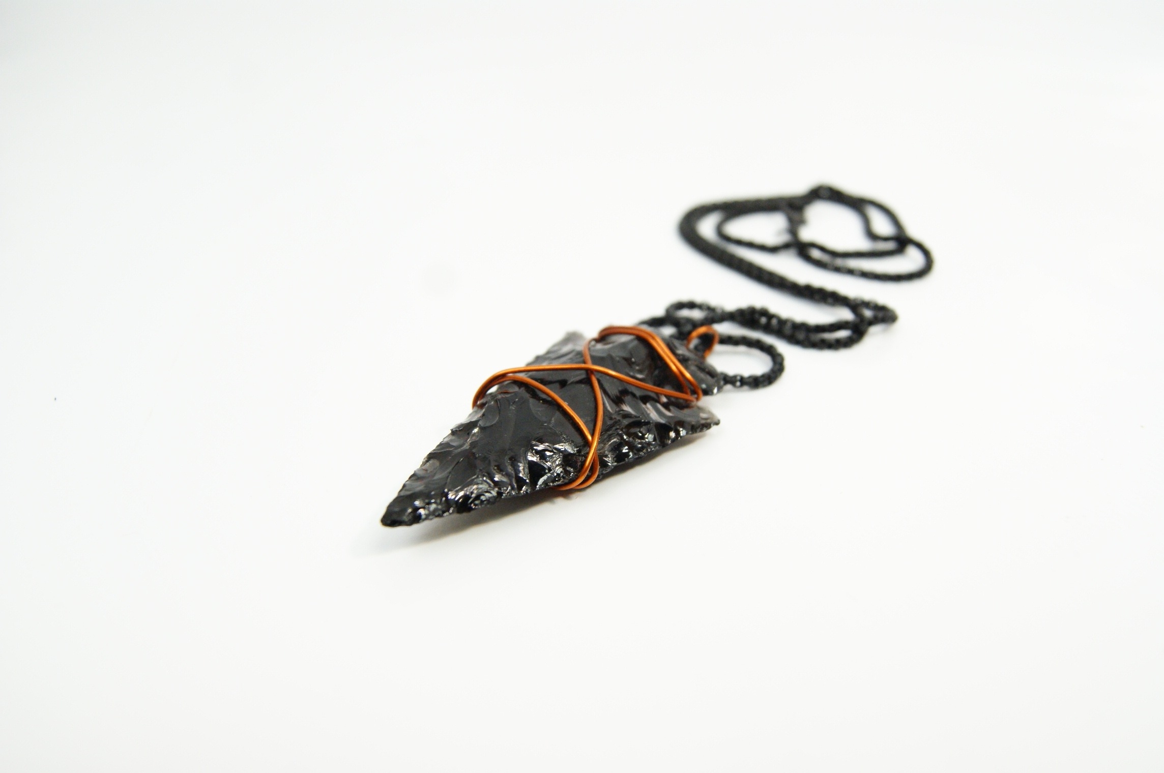 A striking pendant necklace centred with a polished black obsidian arrowhead, the stone displaying natural conchoidal fracture patterns and a deep vitreous lustre. The arrowhead is secured within a hand-wrapped copper wire mount, suspended from a dark chain. Combining natural material with a rustic handcrafted setting, the piece evokes traditional arrowhead forms long associated with protection and strength. Presented with a small drawstring pouch.Pendant length: approximately 50 mm to 63 mm. Chain length: approximately 50 cm to 60 cm.