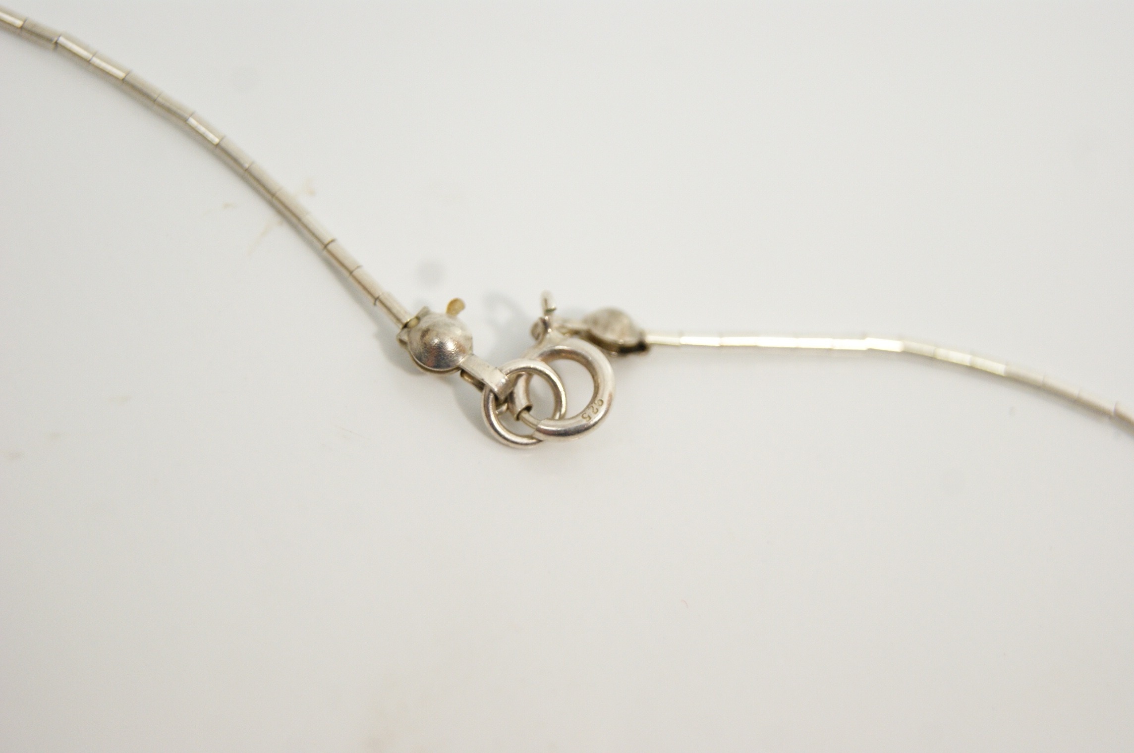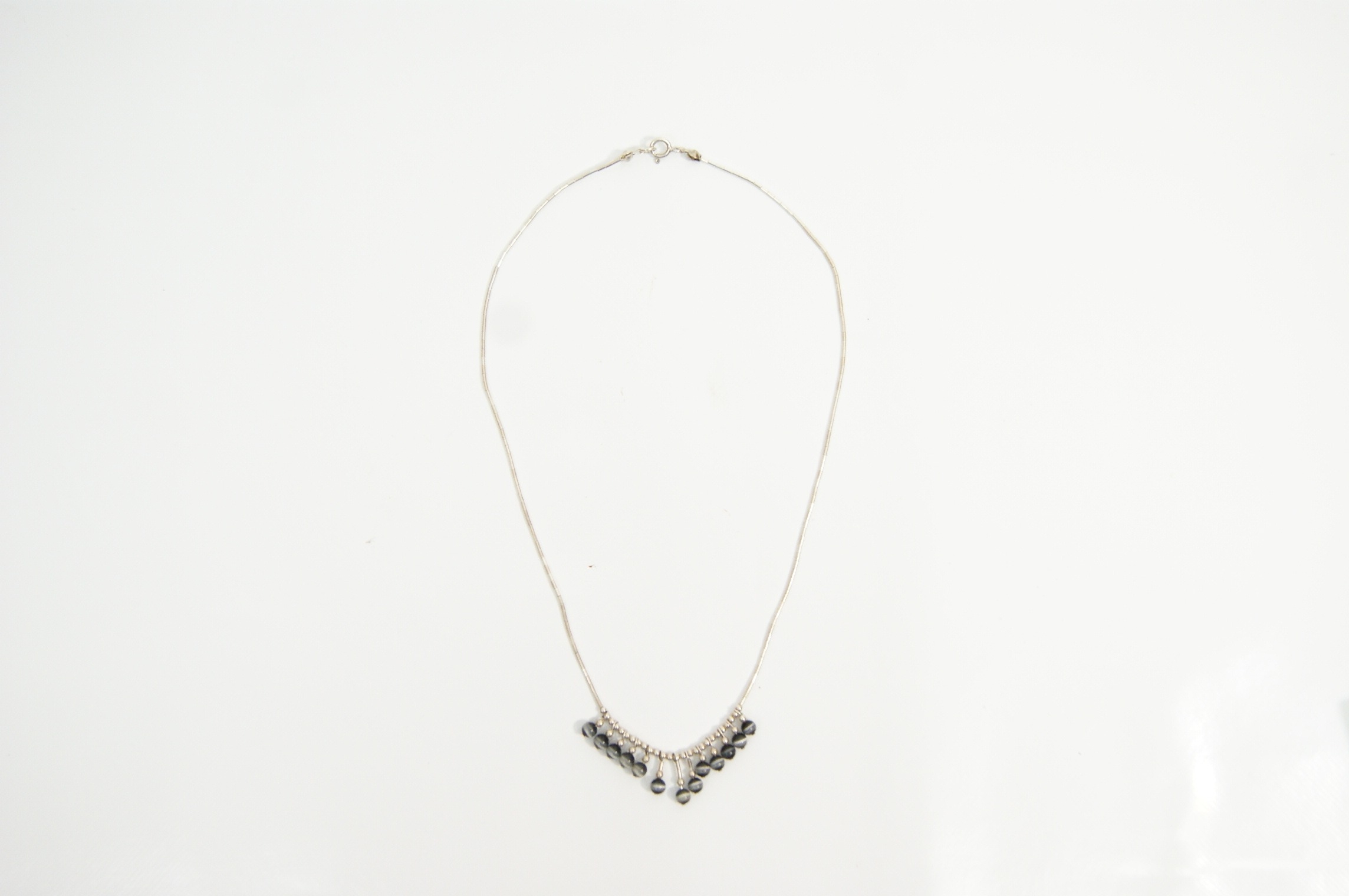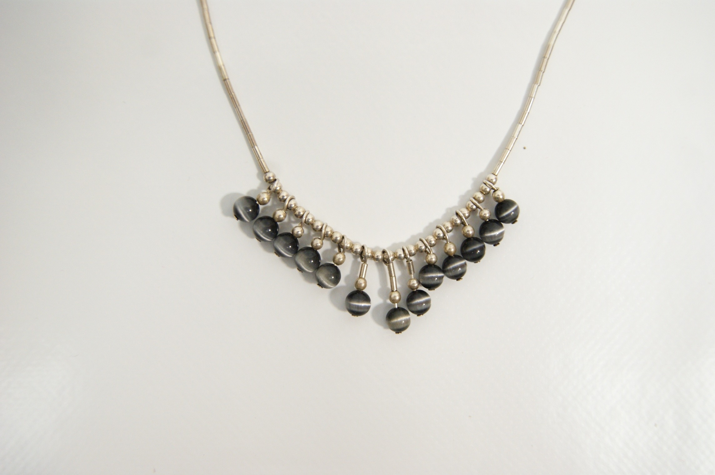A silver-toned fringe necklace featuring a fine segmented tube chain, commonly referred to as liquid silver style. The necklace is adorned with a fringe of eleven graduated round chatoyant beads in a dark grey colour, each exhibiting a cat’s eye effect. The piece is secured with a spring ring clasp. This design is attributed to the Shimmering High Society collection by Paparazzi. Hallmarks: Stamped 925 to the clasp. Length: Approximately 41–46 cm.