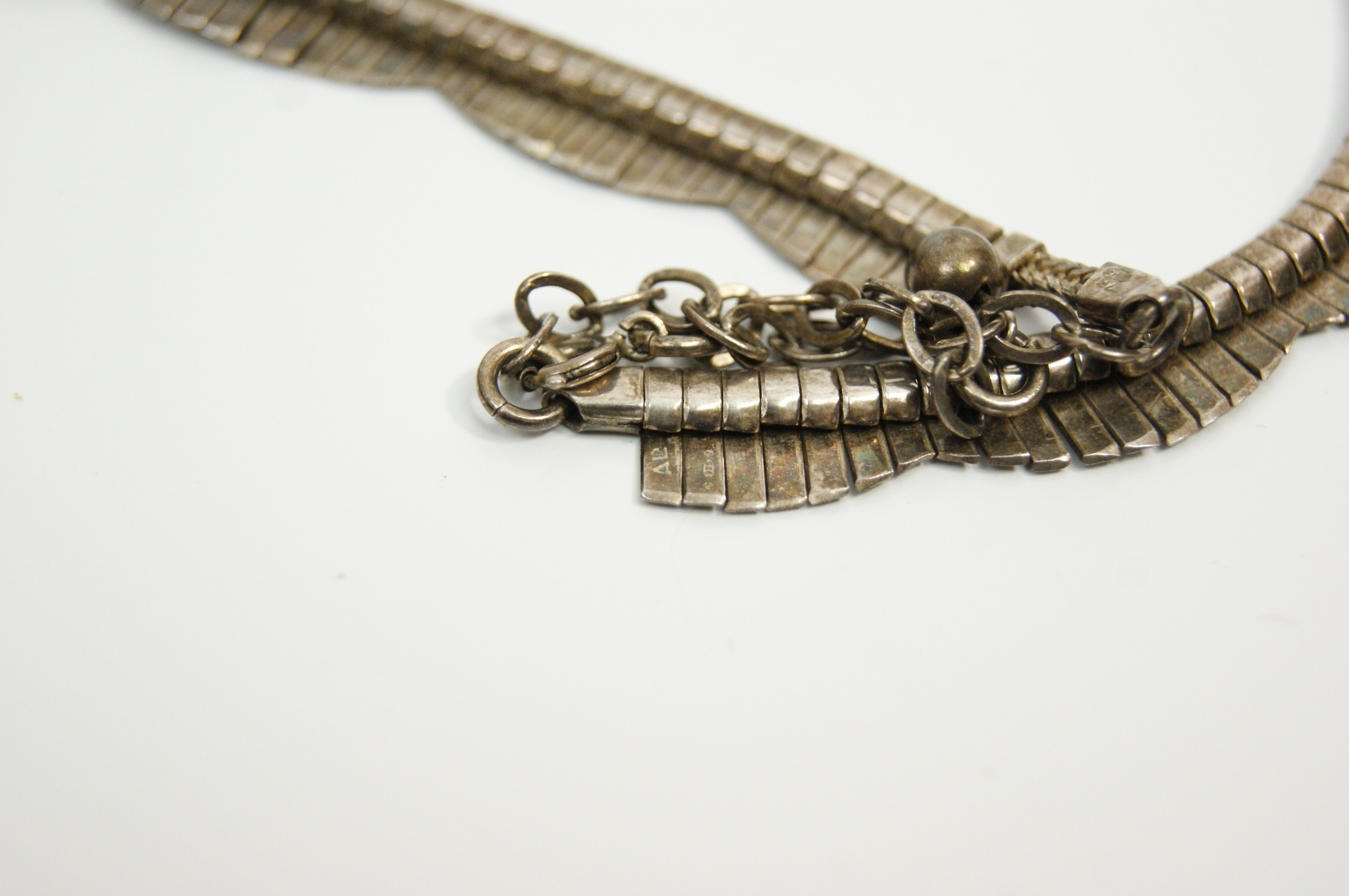 A sterling silver collar necklace of Modernist design, featuring a scalloped fringe. The piece is constructed from a flexible, segmented band with numerous suspended vertical slats of graduated lengths, creating a repeating wave or scallop pattern, a style often referred to as a Cleopatra fringe. The decorative front transitions into an oval-link extender chain finished with a small spherical bead. Hallmarked 925 for sterling silver on the reverse, alongside the maker’s mark AE. Secured by a lobster claw clasp. Length approx. 38cm – 43cm (adjustable).