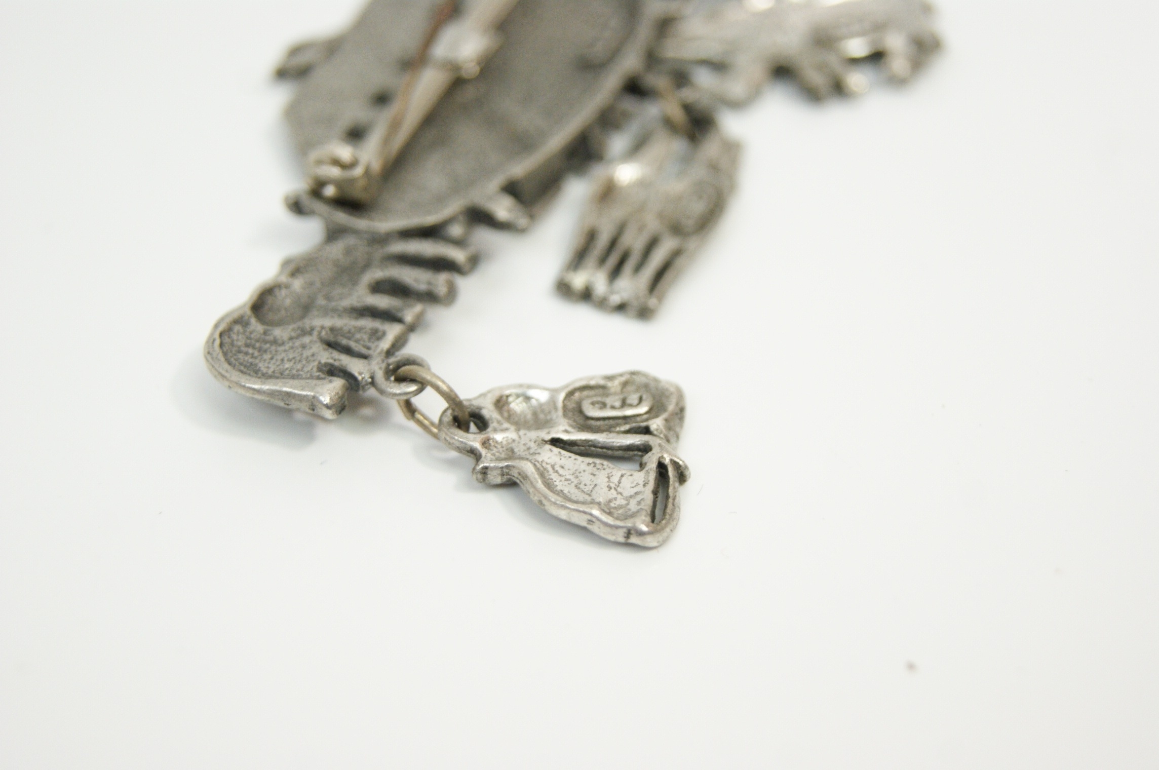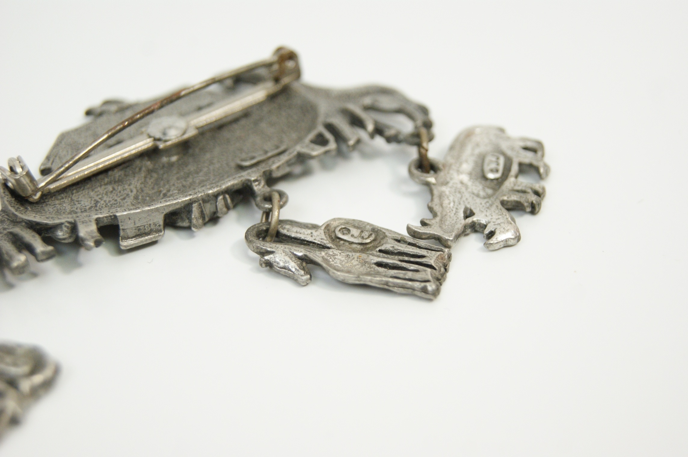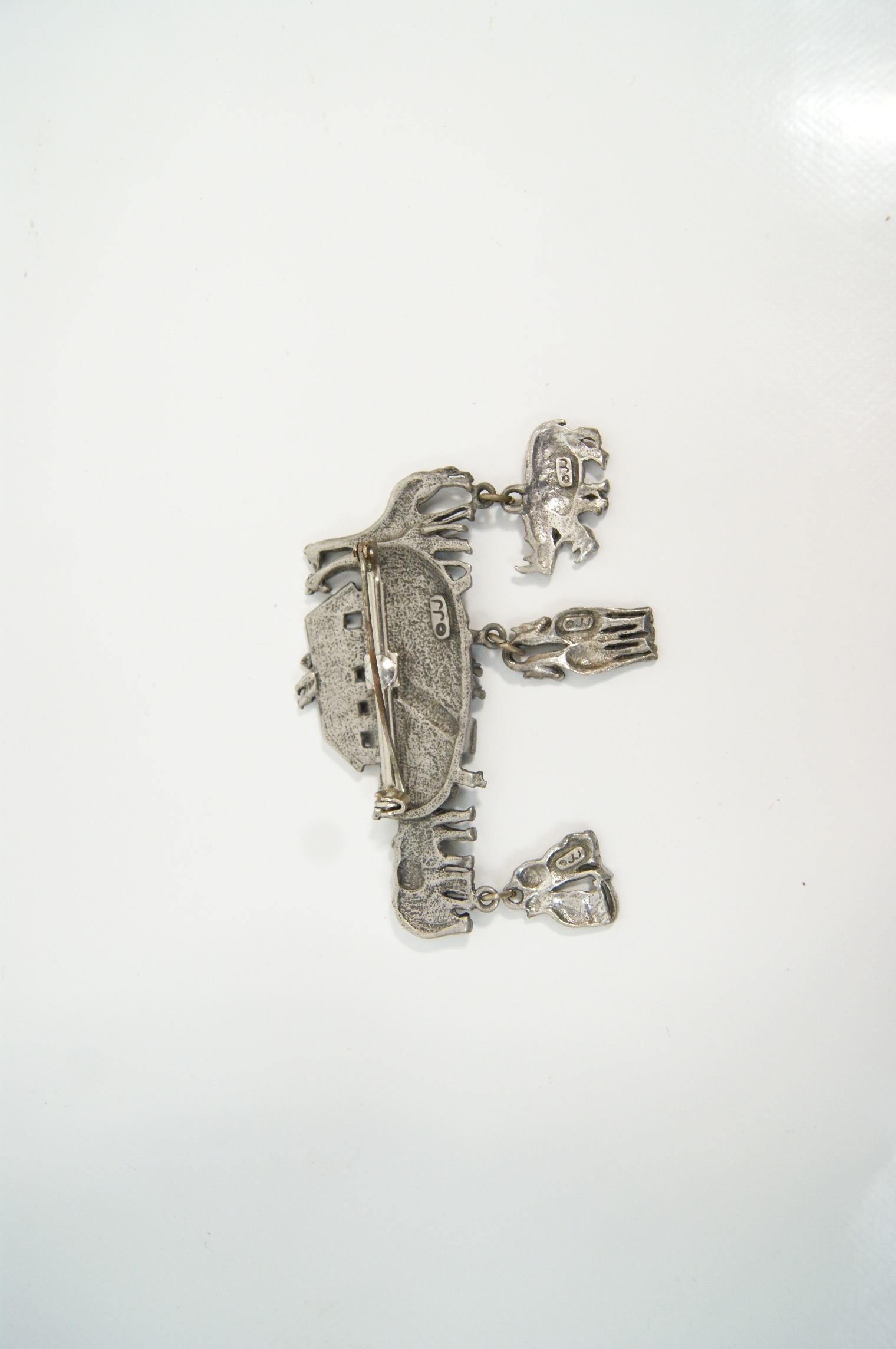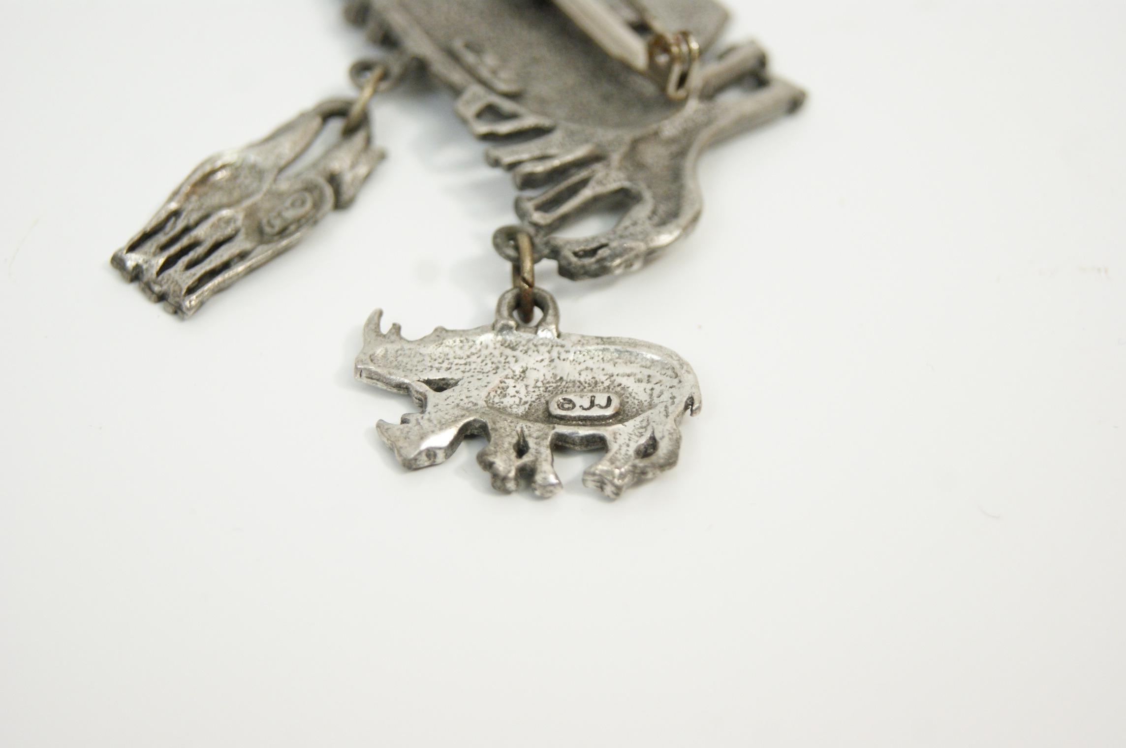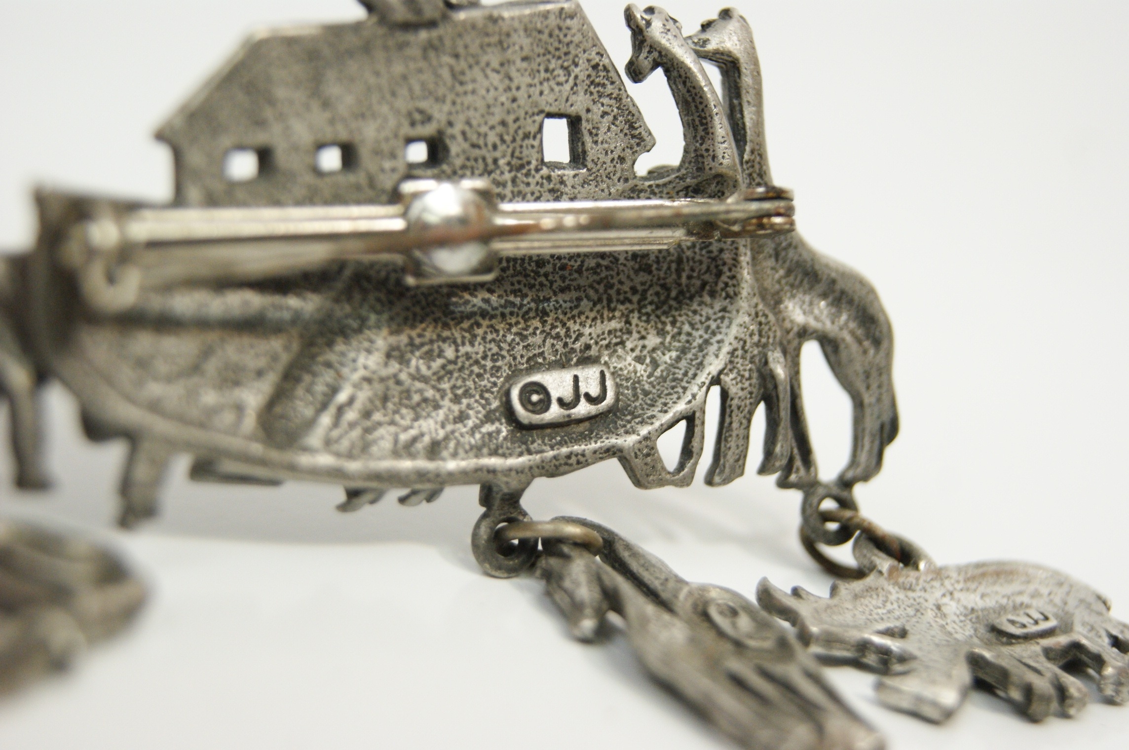 A vintage figural brooch by the Jonette Jewellery Company (JJ), designed as a whimsical representation of Noah’s Ark. The piece is cast in pewter-tone base metal with a matte, antiqued finish. The main body of the brooch depicts the ark populated by pairs of giraffes and elephants, with small ducks cast into the side. Three articulated charms are suspended from the base, featuring pairs of rhinoceroses, horses, and lions. The reverse of the ark and each of the three dangling charms is clearly marked with a copyright symbol followed by JJ in a raised rectangular cartouche. Dimensions: 65mm x 55mm. Weight: 24.8g.