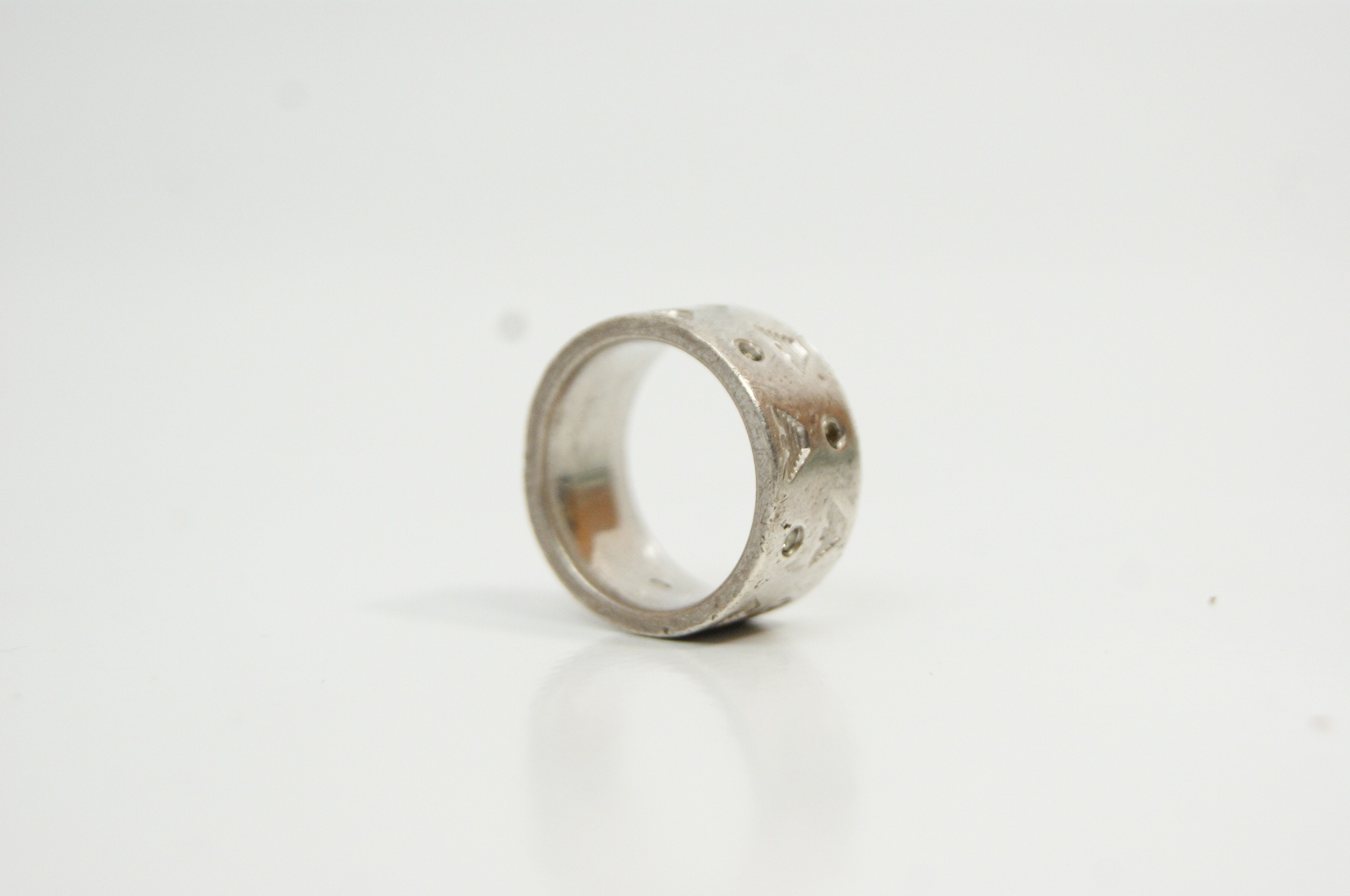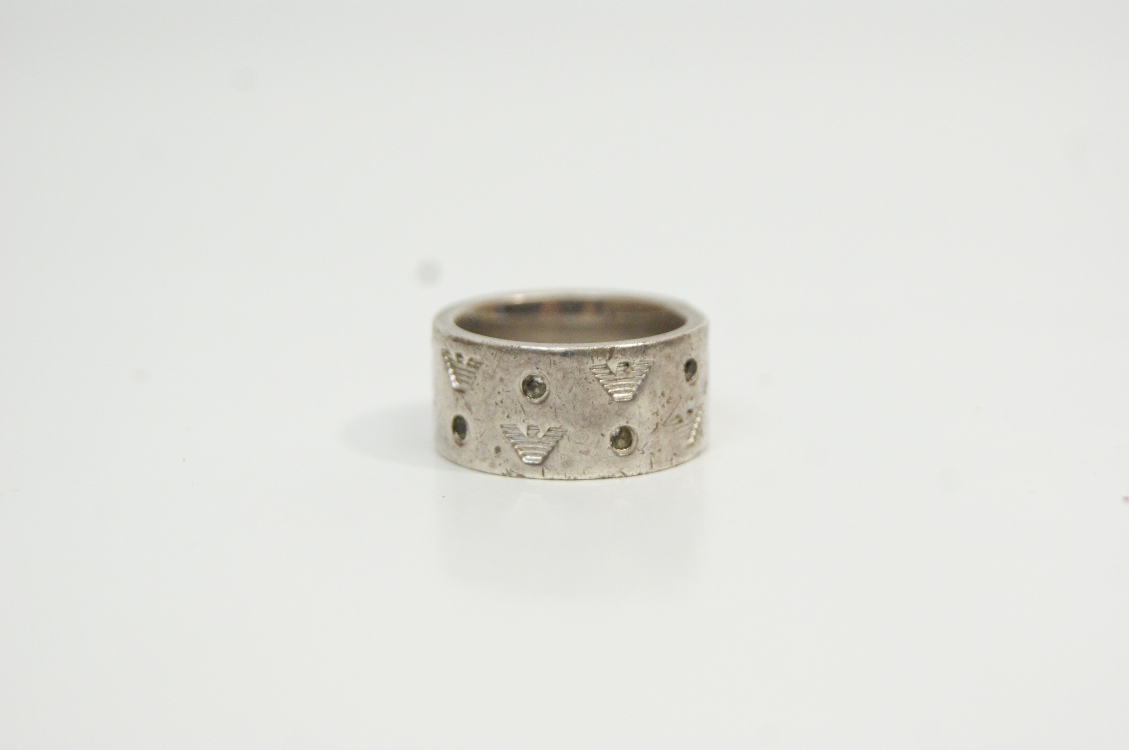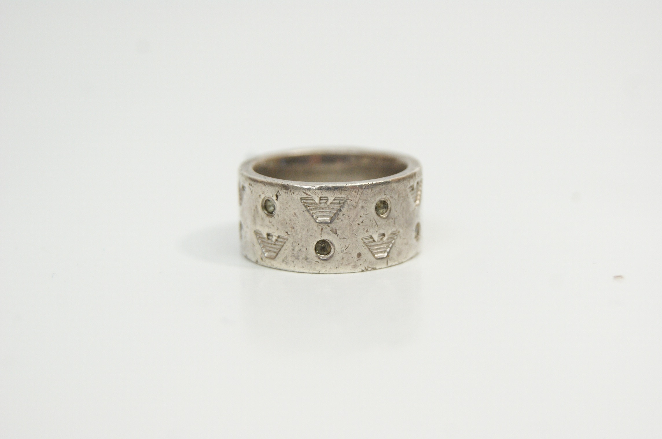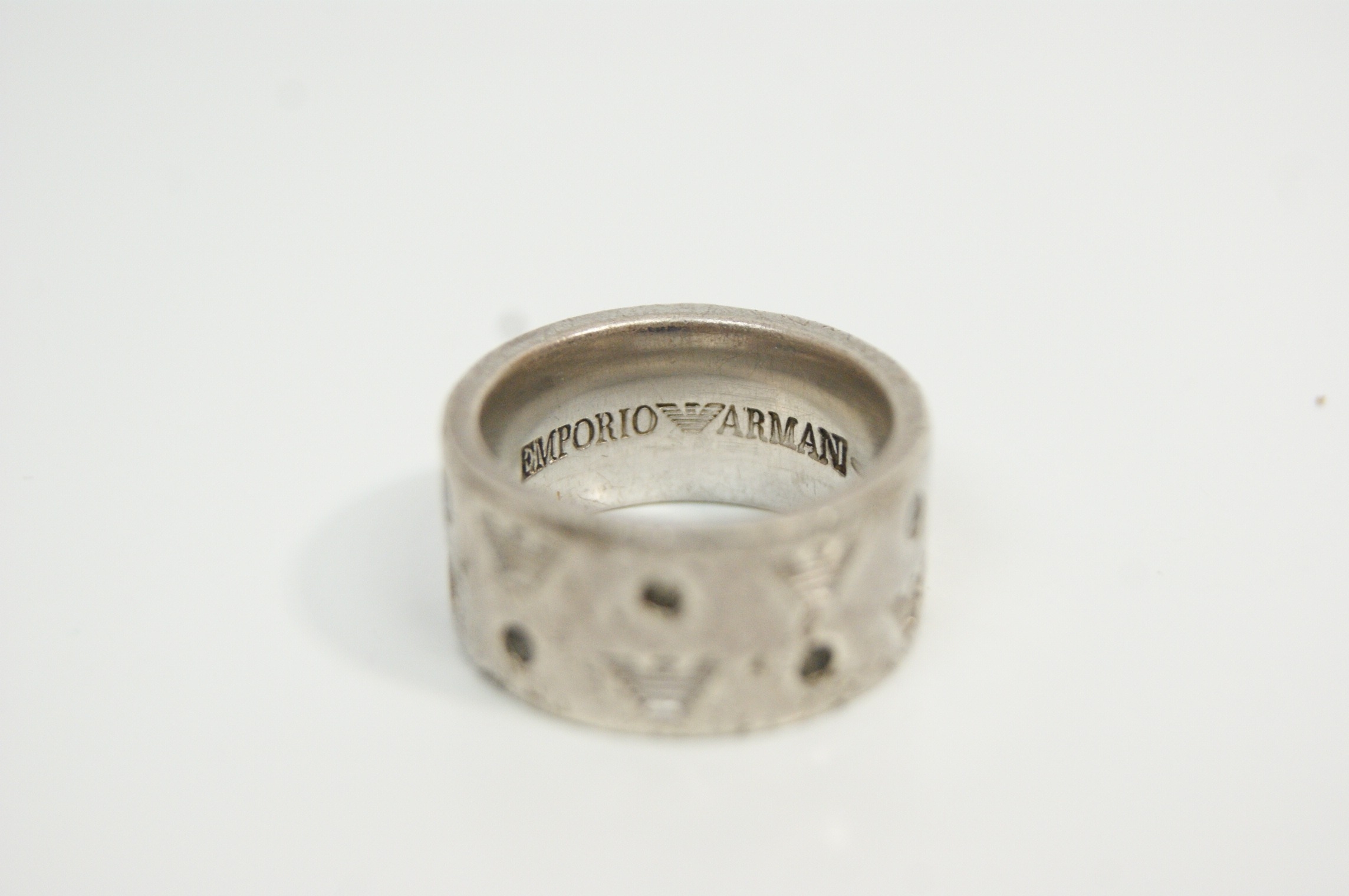 A designer wide-band ring by Emporio Armani. The exterior features a repeating motif of the brand’s signature eagle logo alternating with small, circular, bezel-set dark accent stones. The interior of the band is engraved with the brand name EMPORIO ARMANI and the eagle logo.