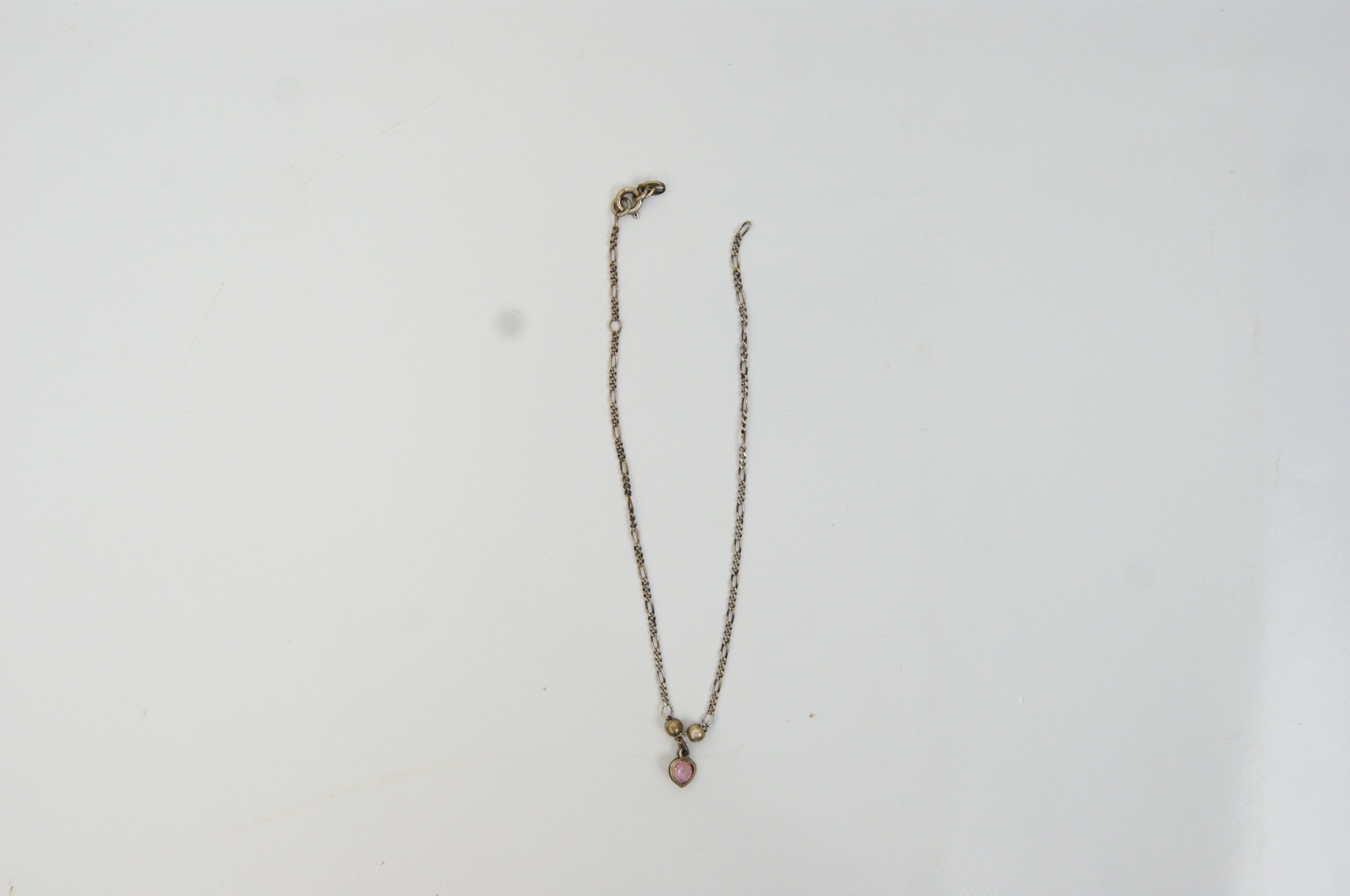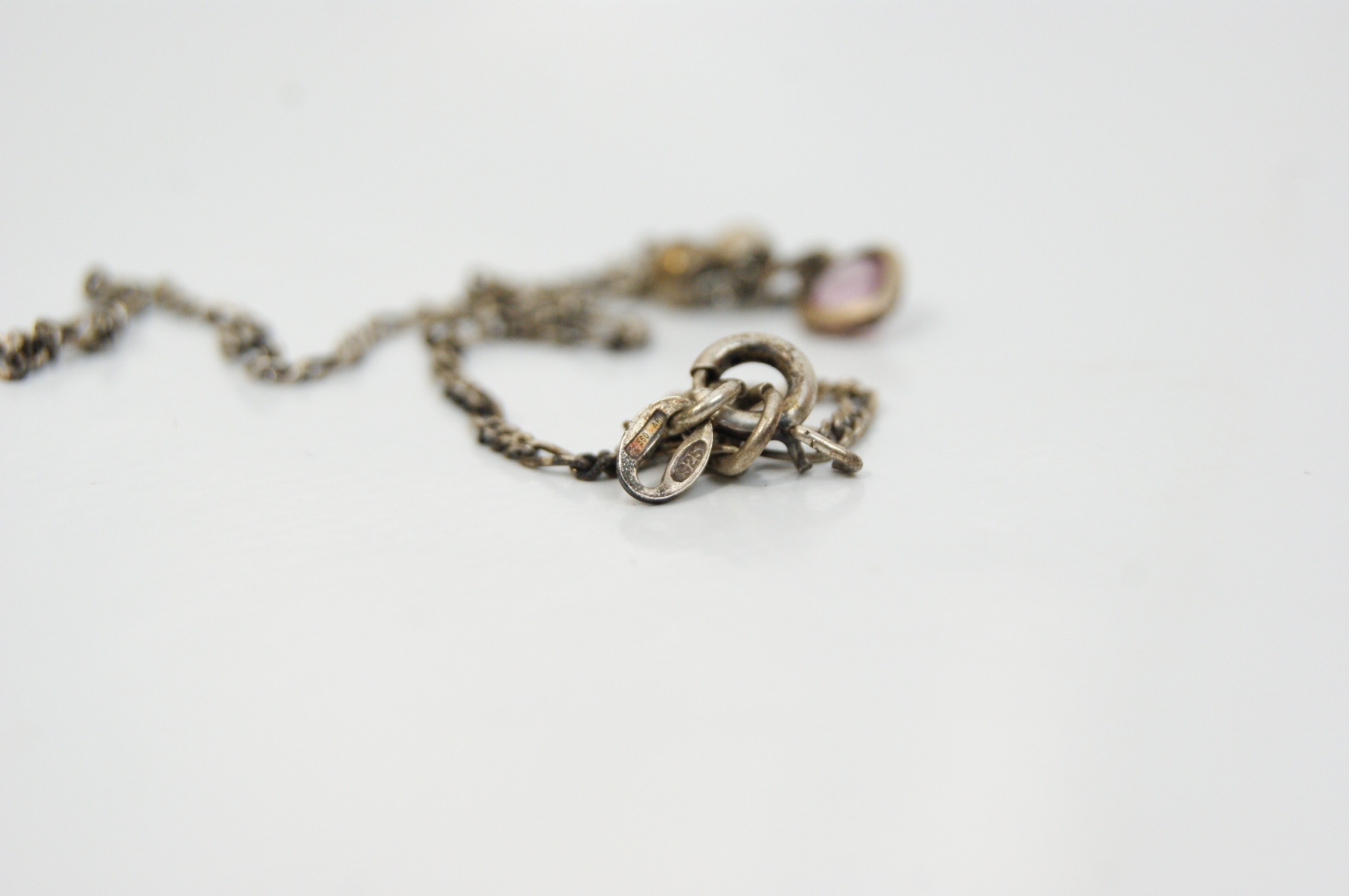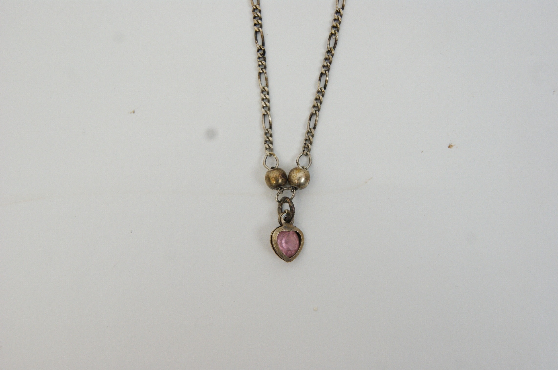 An Italian sterling silver necklace featuring a Figaro link chain, designed with a pattern of three small circular links alternating with one elongated oval link. The necklace supports a heart-shaped pendant set with a faceted pink stone, positioned between two spherical silver beads. The piece is fitted with a bolt ring clasp. Hallmarks are located on an oval tag, stamped 925 and * 560 AR, identifying the piece as sterling silver from the province of Arezzo, Italy.