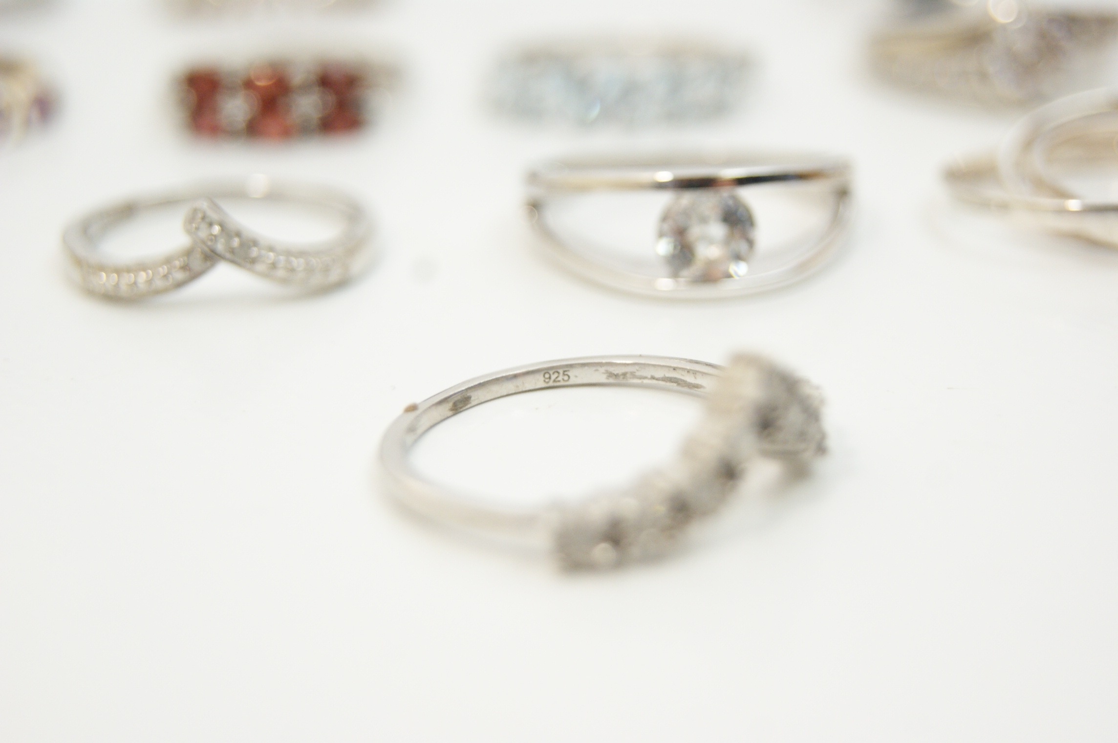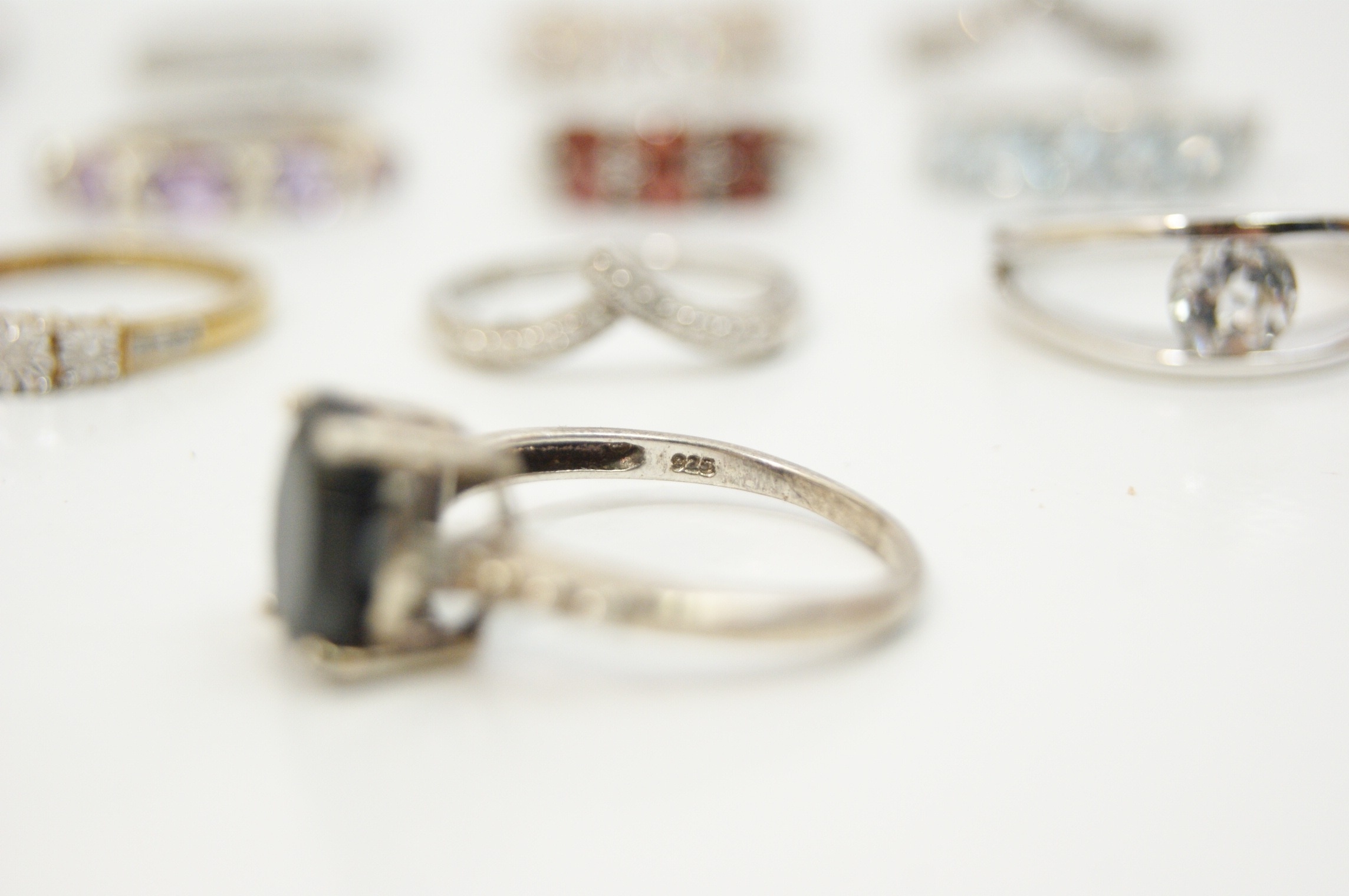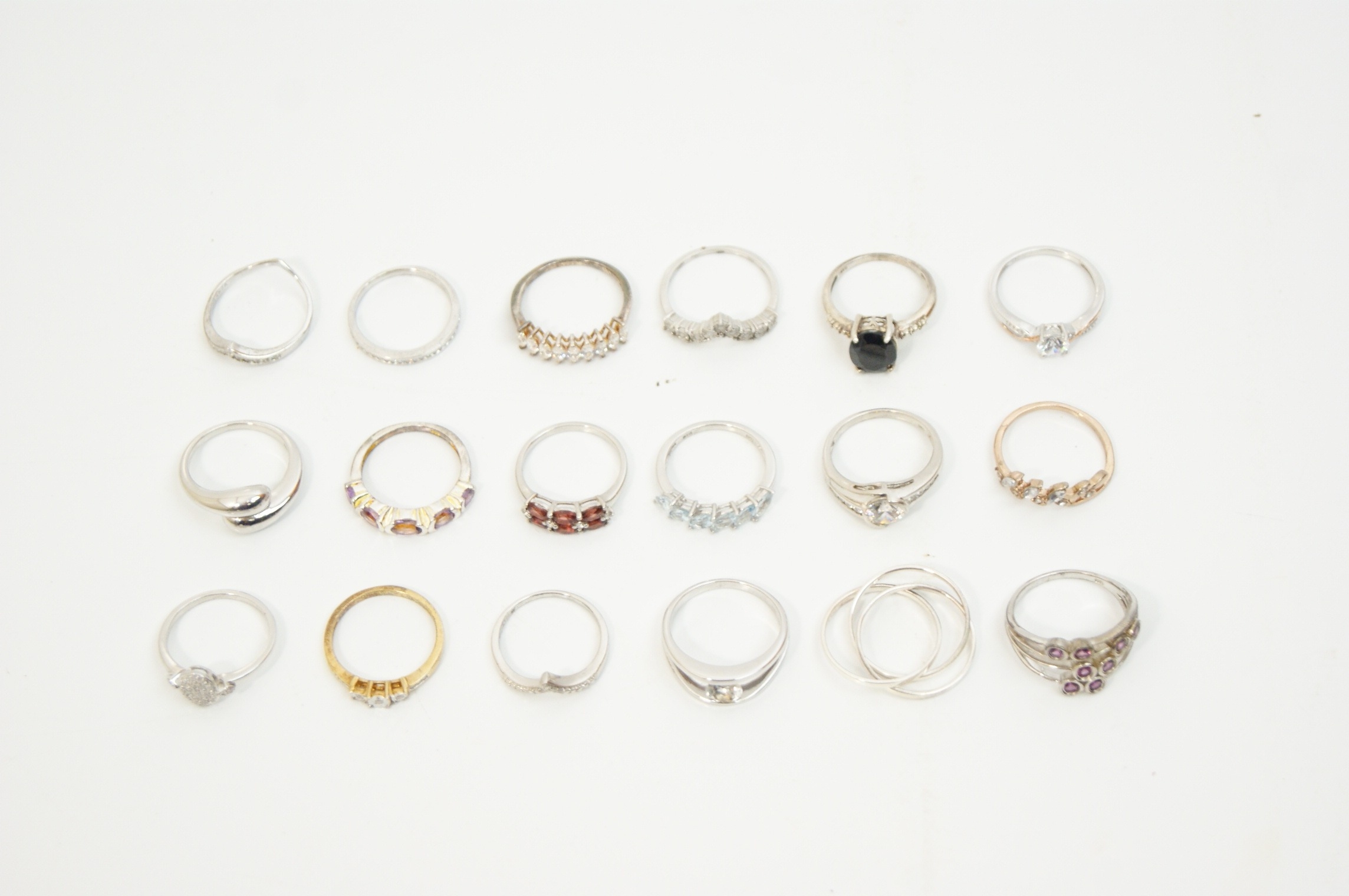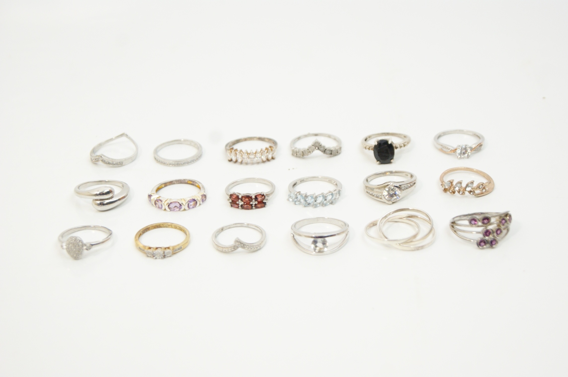 A collection of eighteen assorted rings featuring a variety of contemporary designs and gemstone settings. The pieces are predominantly crafted from sterling silver, with some examples featuring yellow or rose gold-tone plating. The assortment includes solitaire engagement-style rings, half-eternity bands, wishbone or chevron rings, cocktail rings, cluster rings, a bypass wrap ring, and a triple interlocking band set. The rings are set with a variety of faceted gemstones and simulants, including red stones in a five-stone bridge-style setting, light blue marquise-cut stones in a five-stone setting, purple stones in a gold-plated half-hoop and floral cluster, and a large oval-cut black stone in a cocktail setting. Numerous rings are further embellished with clear round, baguette, and marquise-cut stones. Settings include prong, channel, bezel, and pavé styles. Marks including 925 and S 925 are visible on the inner shanks of several rings. The collection is consistent with contemporary stackable jewellery styles.