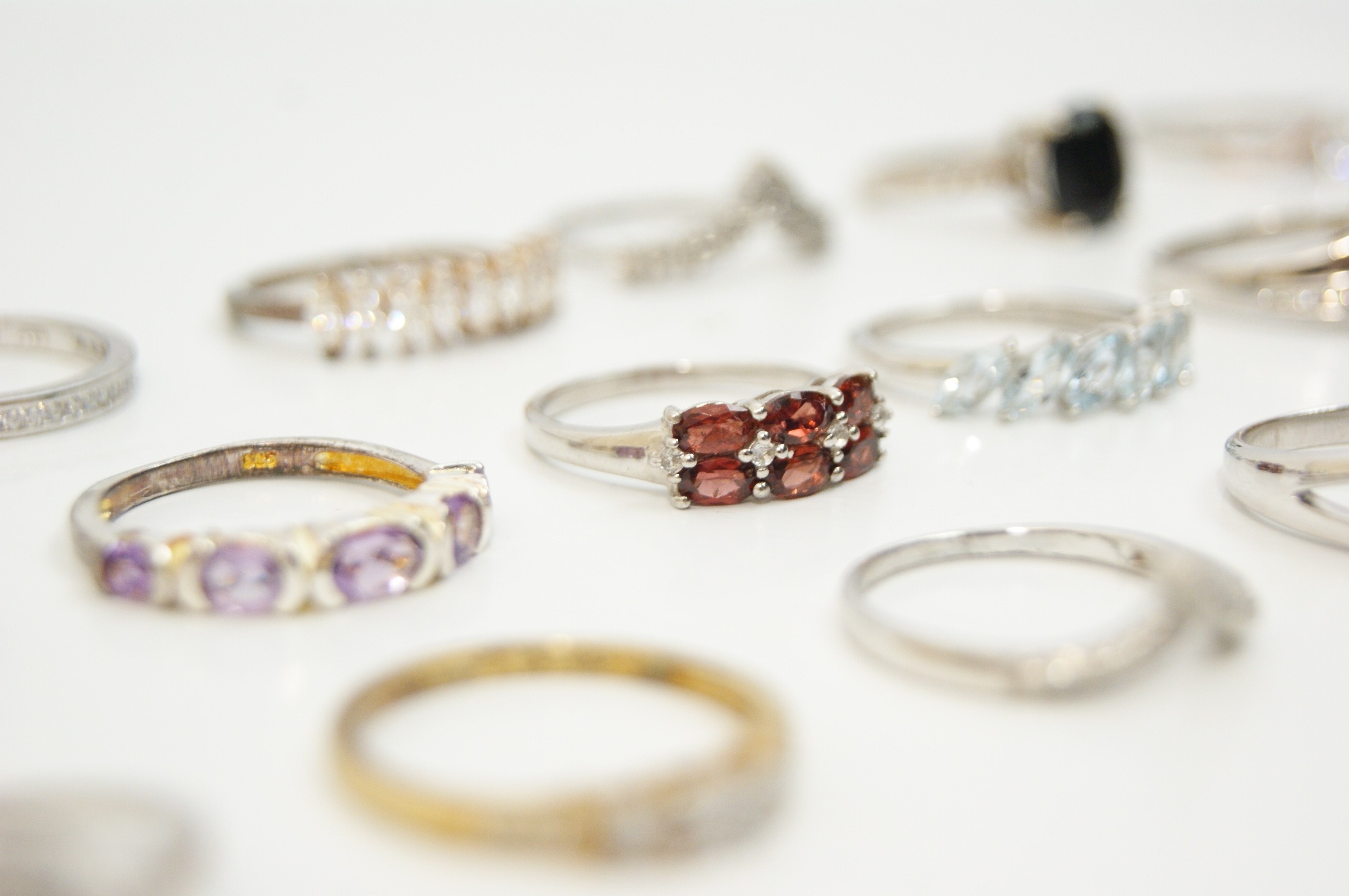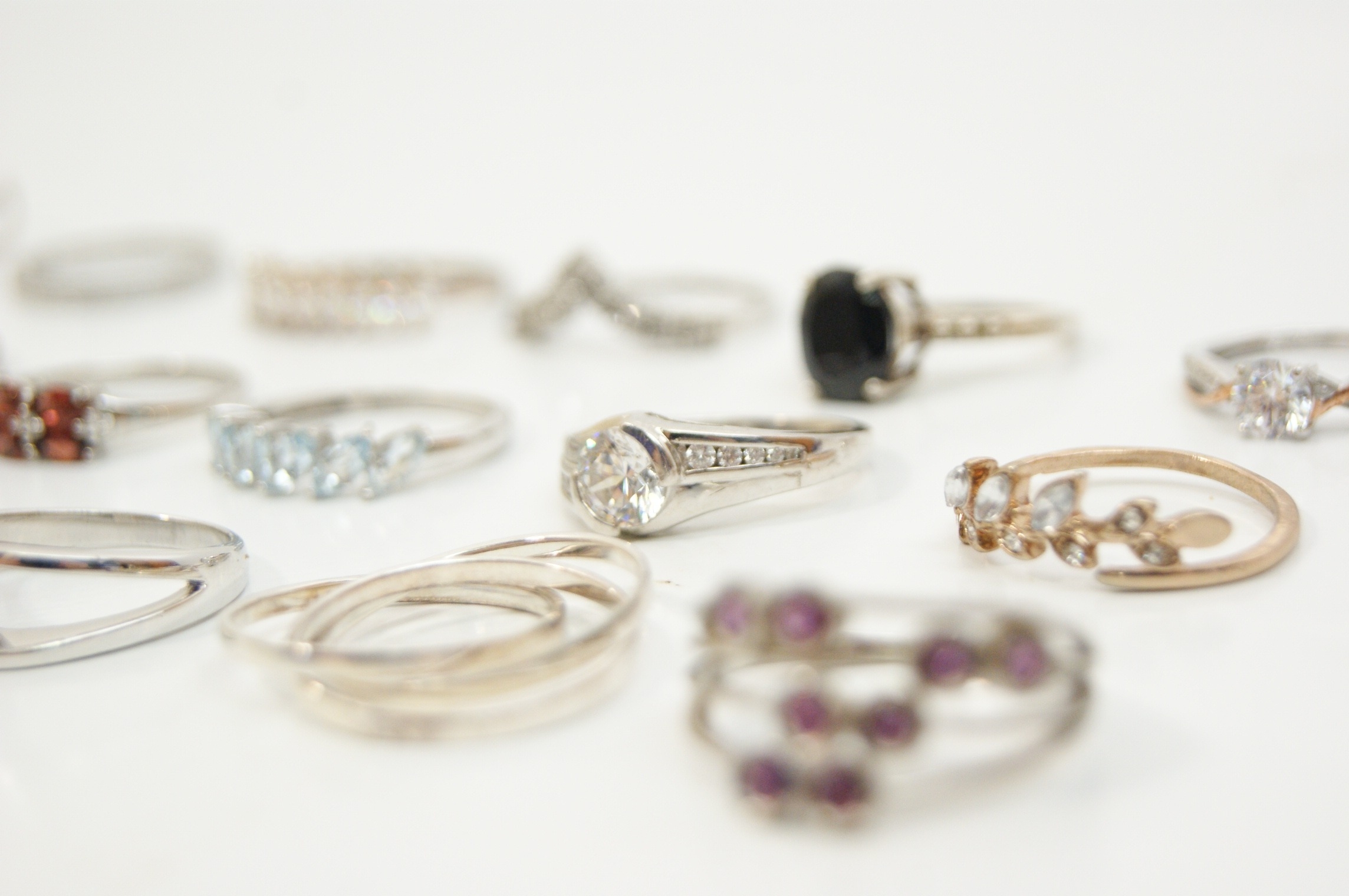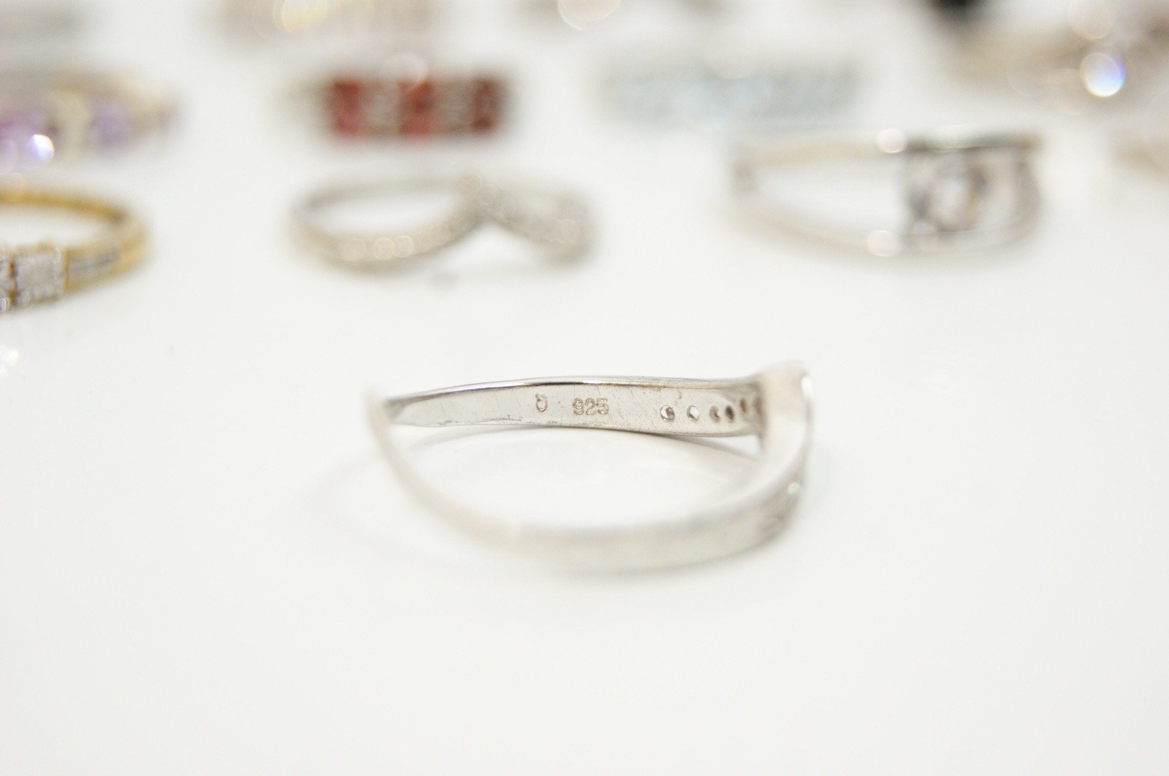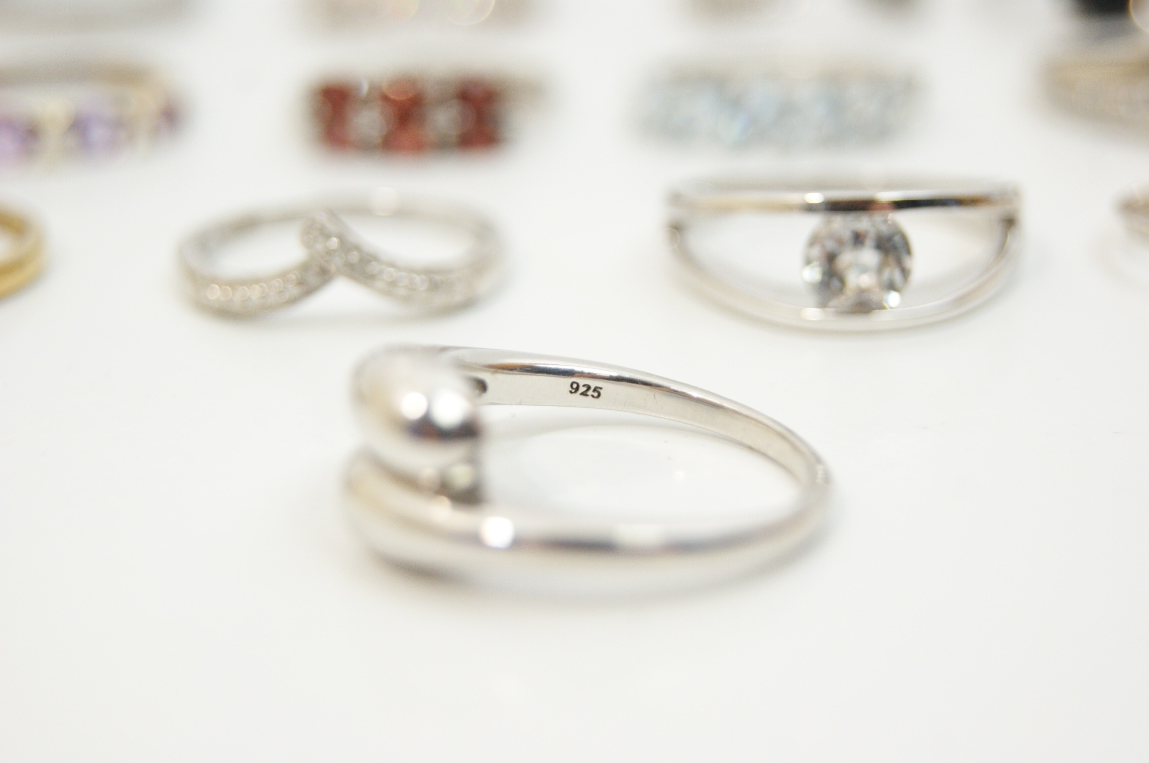 A collection of eighteen assorted rings featuring a variety of contemporary designs and gemstone settings. The pieces are predominantly crafted from sterling silver, with some examples featuring yellow or rose gold-tone plating. The assortment includes solitaire engagement-style rings, half-eternity bands, wishbone or chevron rings, cocktail rings, cluster rings, a bypass wrap ring, and a triple interlocking band set. The rings are set with a variety of faceted gemstones and simulants, including red stones in a five-stone bridge-style setting, light blue marquise-cut stones in a five-stone setting, purple stones in a gold-plated half-hoop and floral cluster, and a large oval-cut black stone in a cocktail setting. Numerous rings are further embellished with clear round, baguette, and marquise-cut stones. Settings include prong, channel, bezel, and pavé styles. Marks including 925 and S 925 are visible on the inner shanks of several rings. The collection is consistent with contemporary stackable jewellery styles.