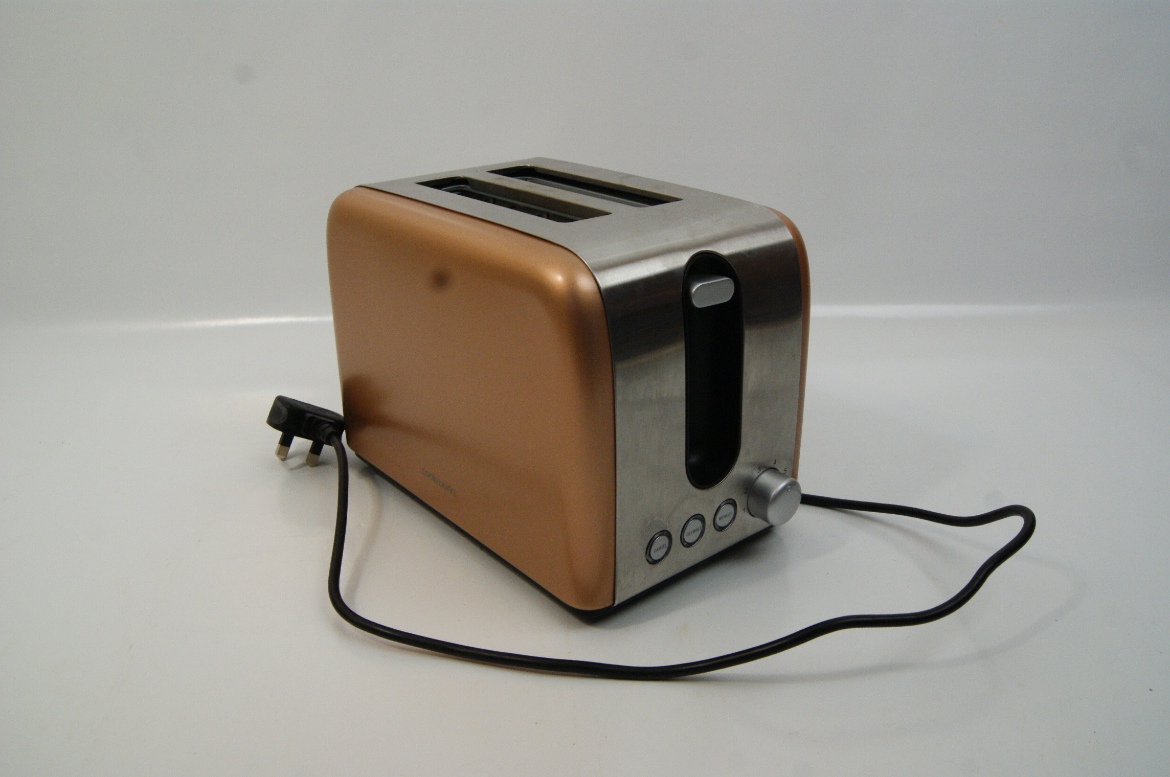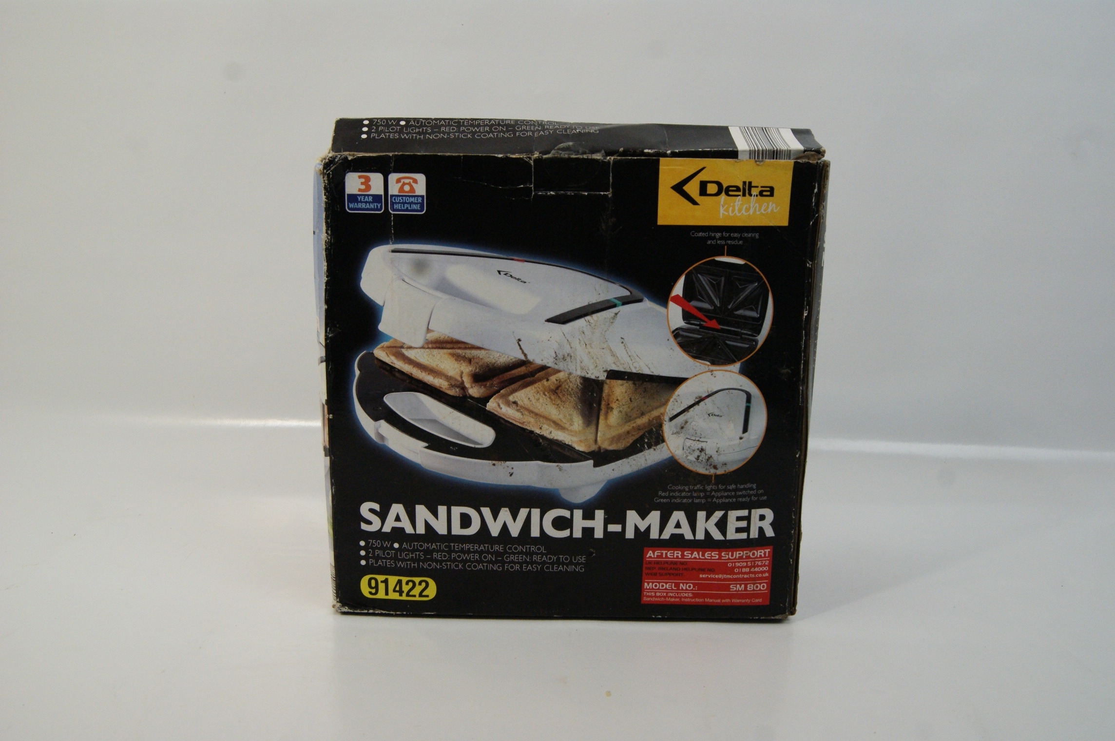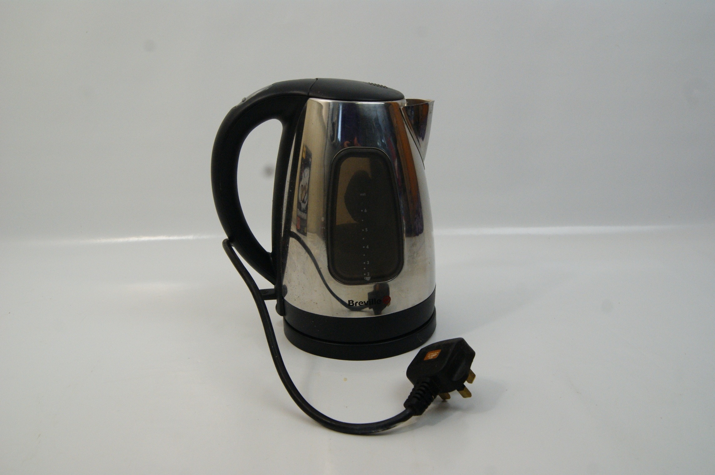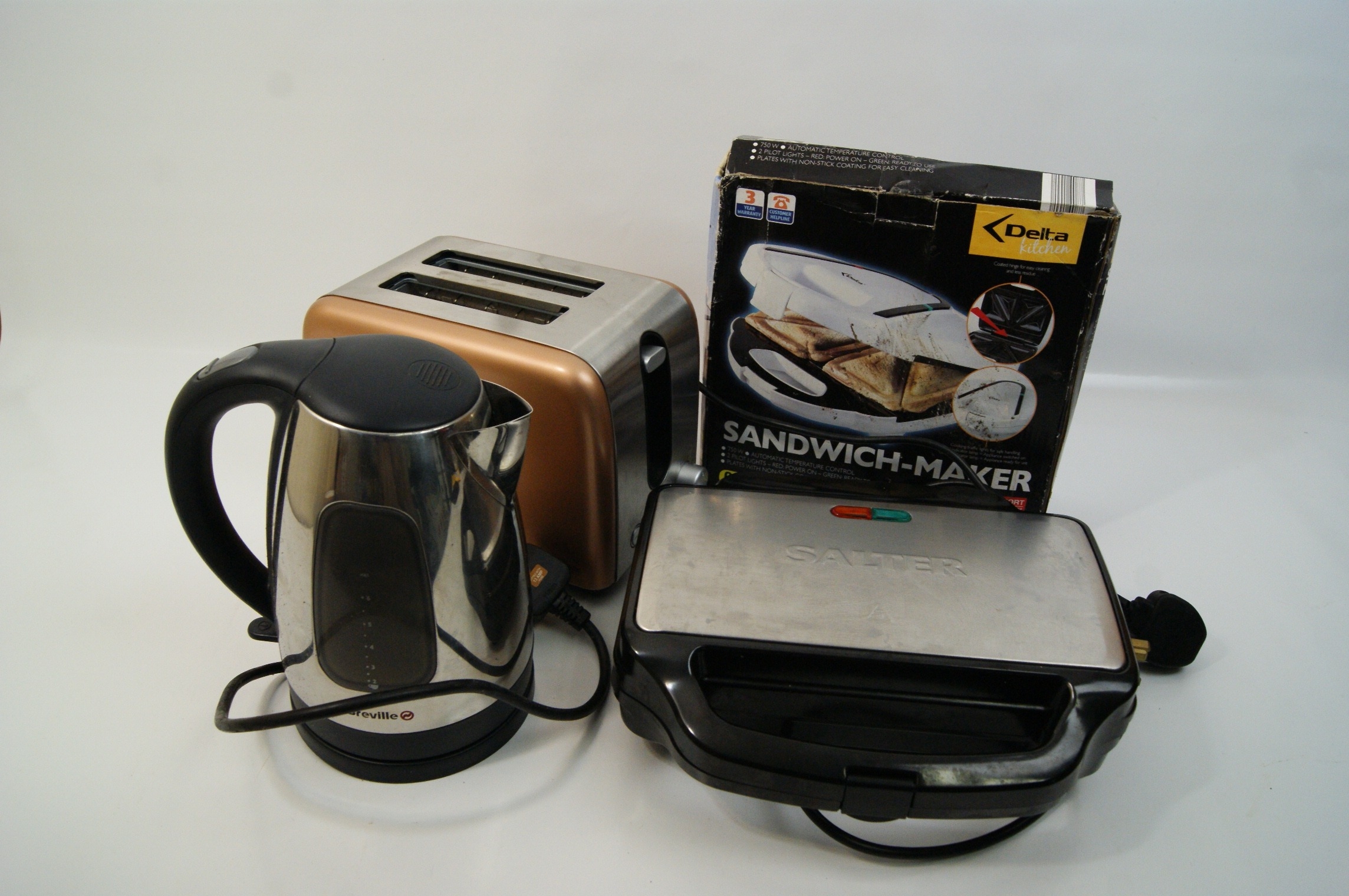 A group lot of three domestic kitchen appliances. The first item is a cordless electric kettle by Breville, constructed with a polished stainless steel body and a black plastic handle and base. It features a side-mounted water level window with graduated cup markings and sits on a 360-degree power base. The second item is a two-slice toaster by Cookworks, finished with metallic copper-coloured side panels and a brushed stainless steel fascia. The unit includes a variable browning control dial and individual buttons for cancel, defrost, and reheat functions. The third item is a deep-fill sandwich toaster by Salter, featuring a black plastic housing with a decorative stainless steel top plate and red and green indicator lights. The internal non-stick plates are designed to create two triangular toasted sandwiches. Included is a retail box for a Delta Kitchen model SM 800 sandwich maker, which is mismatched to the Salter appliance. All items are fitted with standard United Kingdom three-pin power plugs.