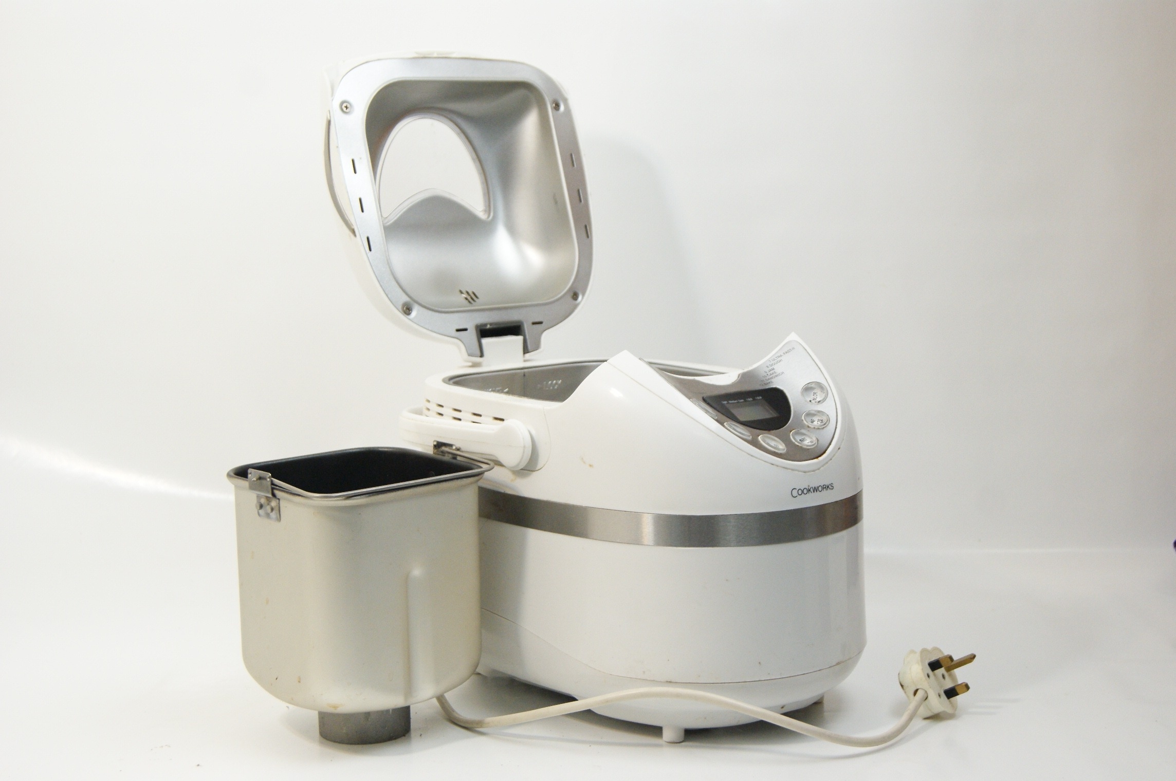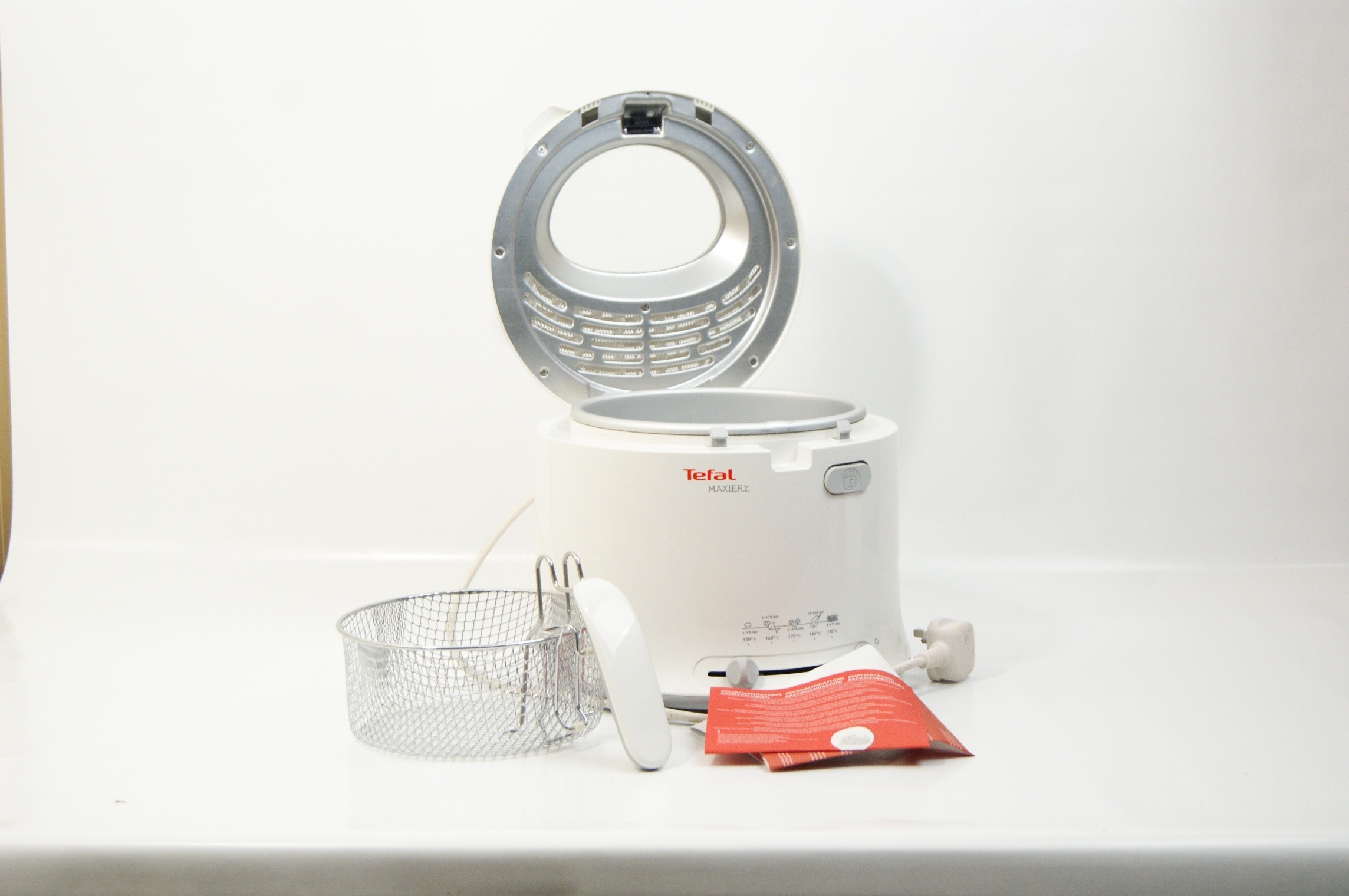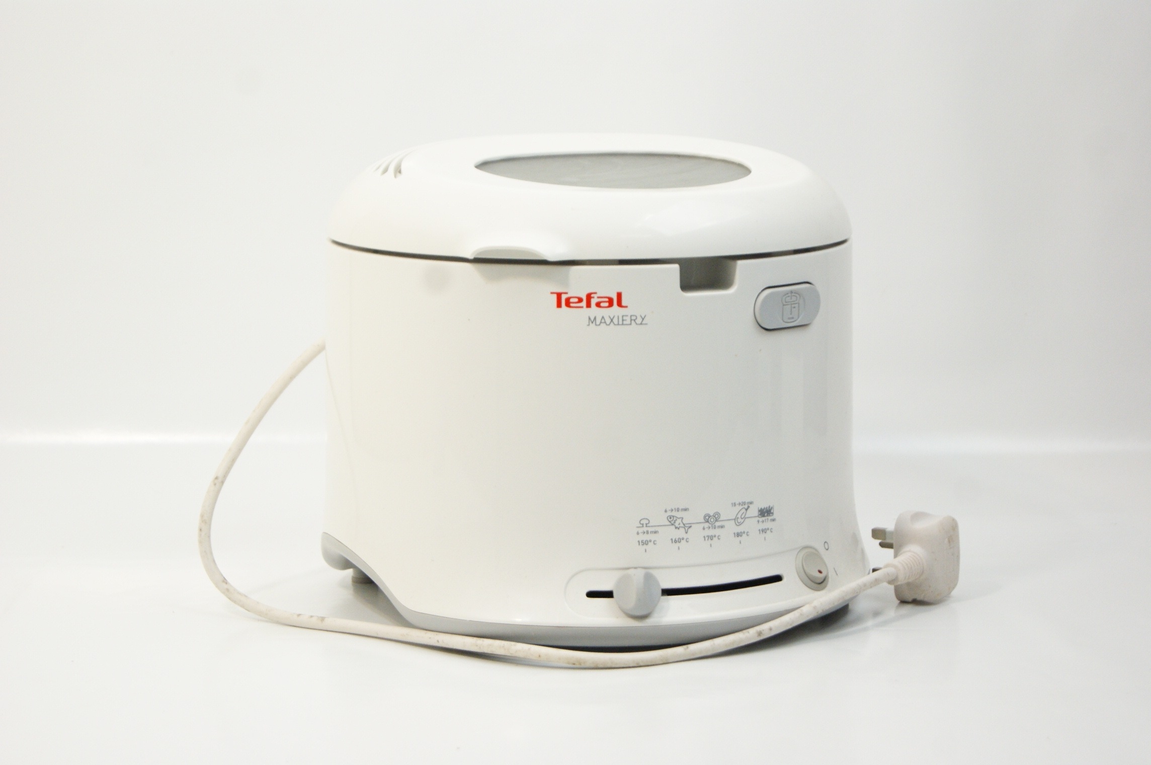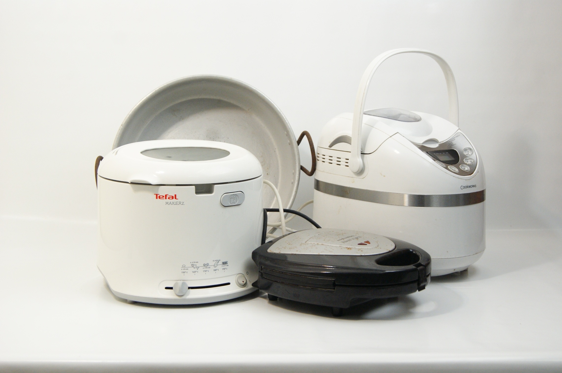 This lot comprises a group of domestic kitchen appliances and vintage cookware. The first item is a Tefal Maxiery electric deep fat fryer, identified by web consensus as the Maxi Fry model. It features a white plastic housing with a top-mounted viewing window, an adjustable temperature slider, and a cooking guide printed on the front. It is supplied with a removable wire frying basket and manufacturer’s literature. Power requirements: 220-240V, fitted with a standard UK three-pin plug. Capacity: approximately 2.1 litres. The second item is a Cookworks electric bread maker in a white plastic casing, featuring a digital control panel, viewing window, and a removable internal non-stick bread pan. Power requirements: 220-240V, fitted with a standard UK three-pin plug. The third item is a Morphy Richards Toast & Grill sandwich toaster with triangular cooking plates and a black plastic body with a silver-tone metal top plate. Power requirements: 220-240V, fitted with a standard UK three-pin plug. The final item is a vintage aluminium preserving pan or basin of circular form, featuring two riveted iron loop handles and a circular stamp for Timothy Whites & Taylors on the exterior wall. No NSF certification is visible on any of the equipment.