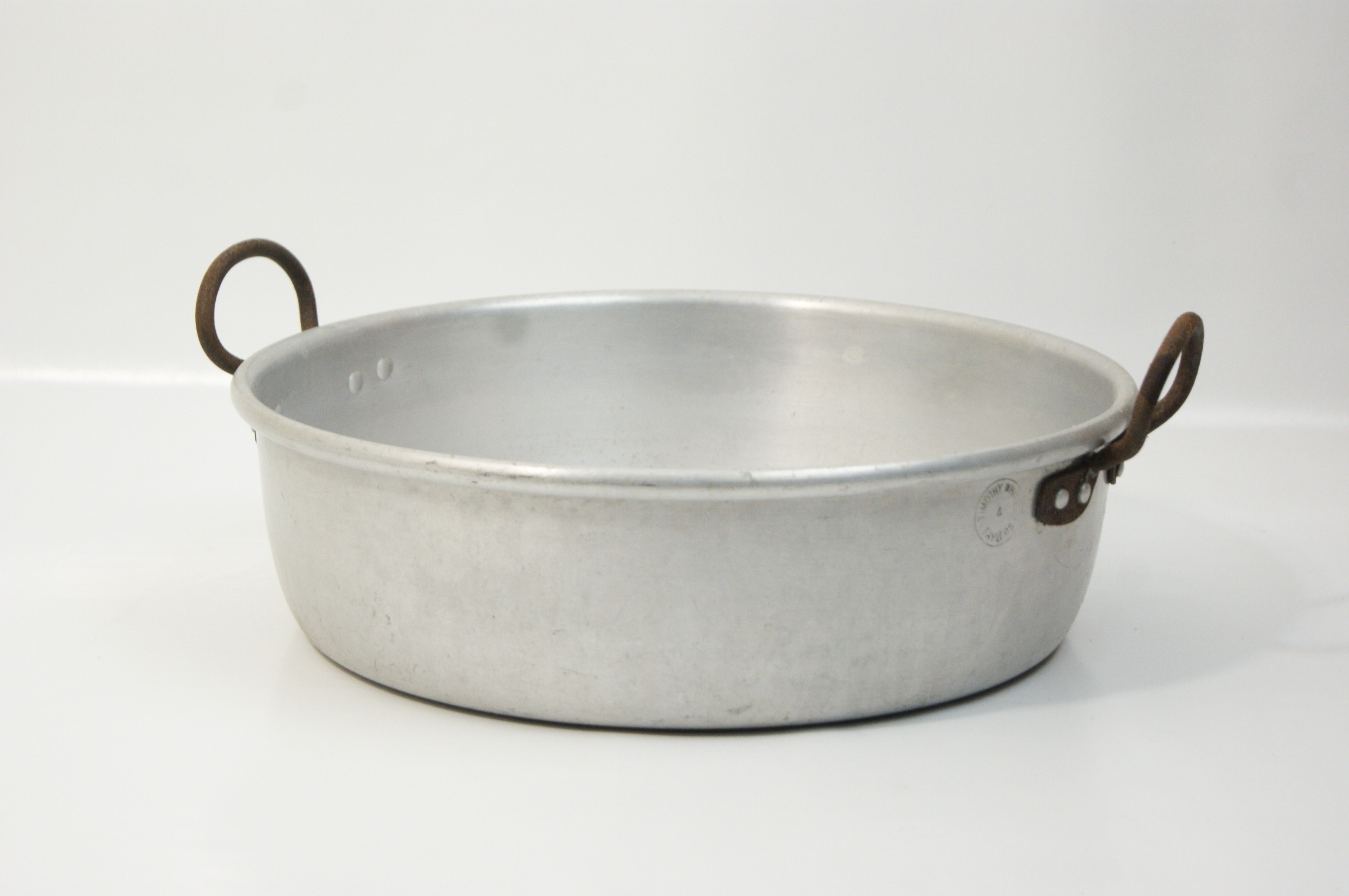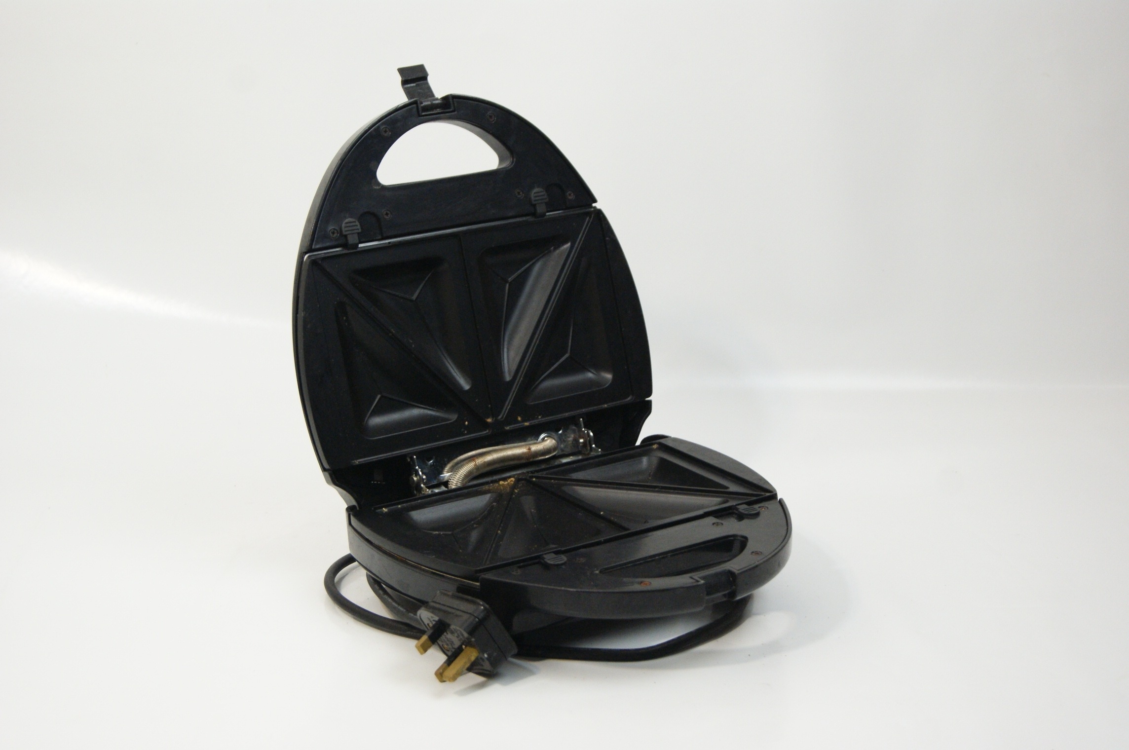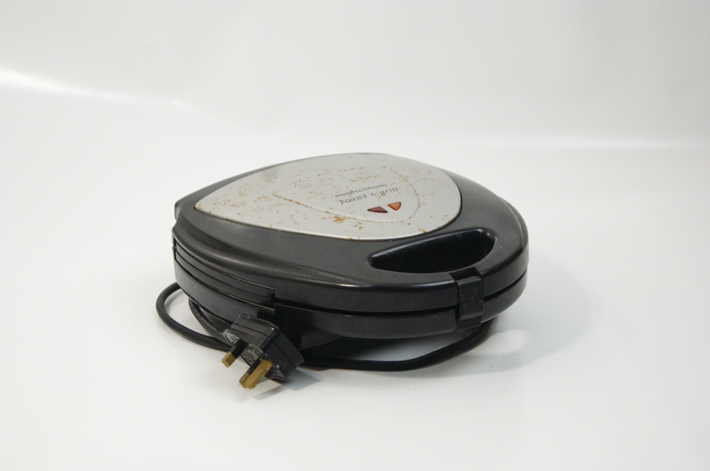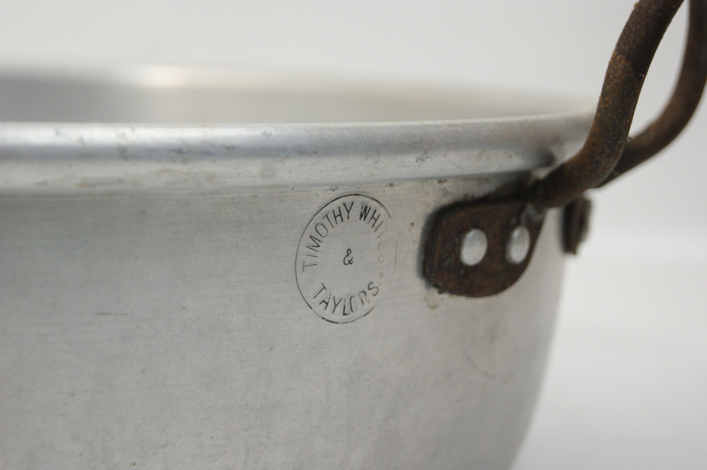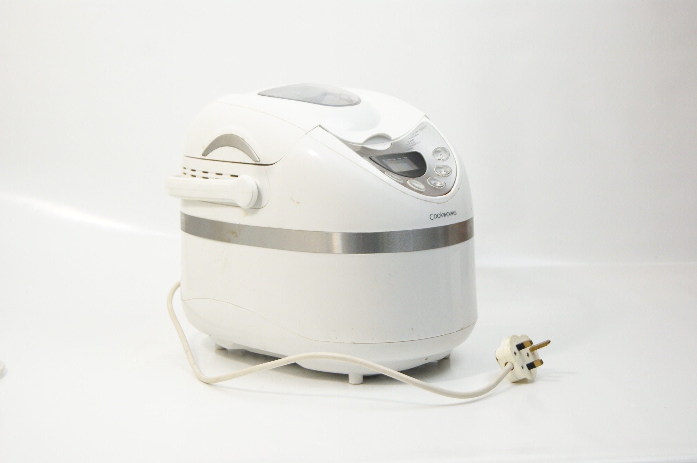 This lot comprises a group of domestic kitchen appliances and vintage cookware. The first item is a Tefal Maxiery electric deep fat fryer, identified by web consensus as the Maxi Fry model. It features a white plastic housing with a top-mounted viewing window, an adjustable temperature slider, and a cooking guide printed on the front. It is supplied with a removable wire frying basket and manufacturer’s literature. Power requirements: 220-240V, fitted with a standard UK three-pin plug. Capacity: approximately 2.1 litres. The second item is a Cookworks electric bread maker in a white plastic casing, featuring a digital control panel, viewing window, and a removable internal non-stick bread pan. Power requirements: 220-240V, fitted with a standard UK three-pin plug. The third item is a Morphy Richards Toast & Grill sandwich toaster with triangular cooking plates and a black plastic body with a silver-tone metal top plate. Power requirements: 220-240V, fitted with a standard UK three-pin plug. The final item is a vintage aluminium preserving pan or basin of circular form, featuring two riveted iron loop handles and a circular stamp for Timothy Whites & Taylors on the exterior wall. No NSF certification is visible on any of the equipment.