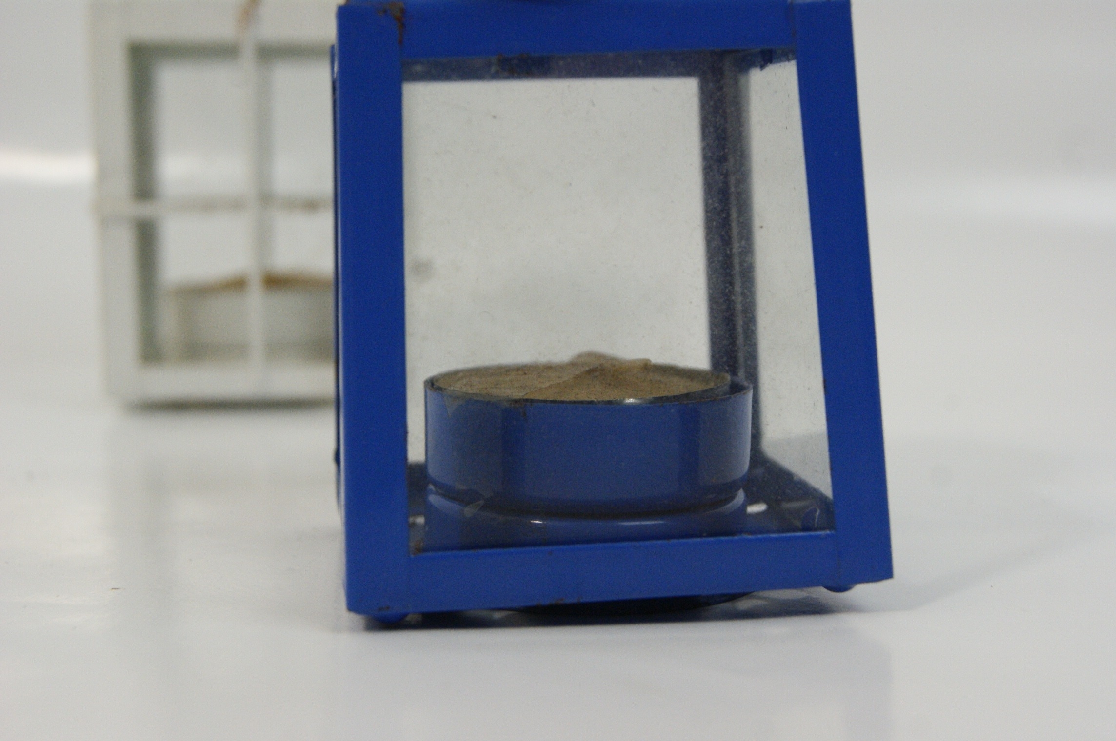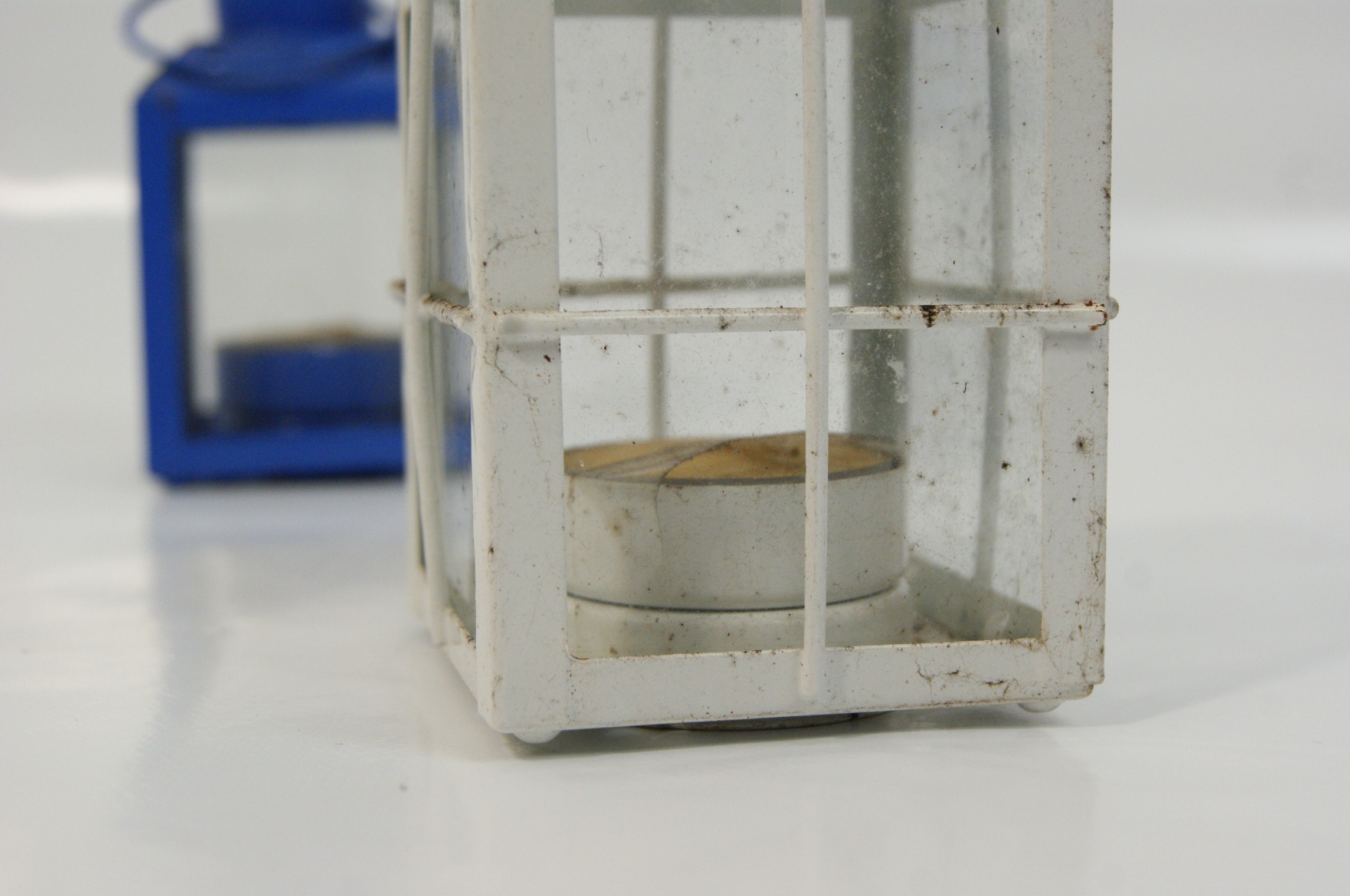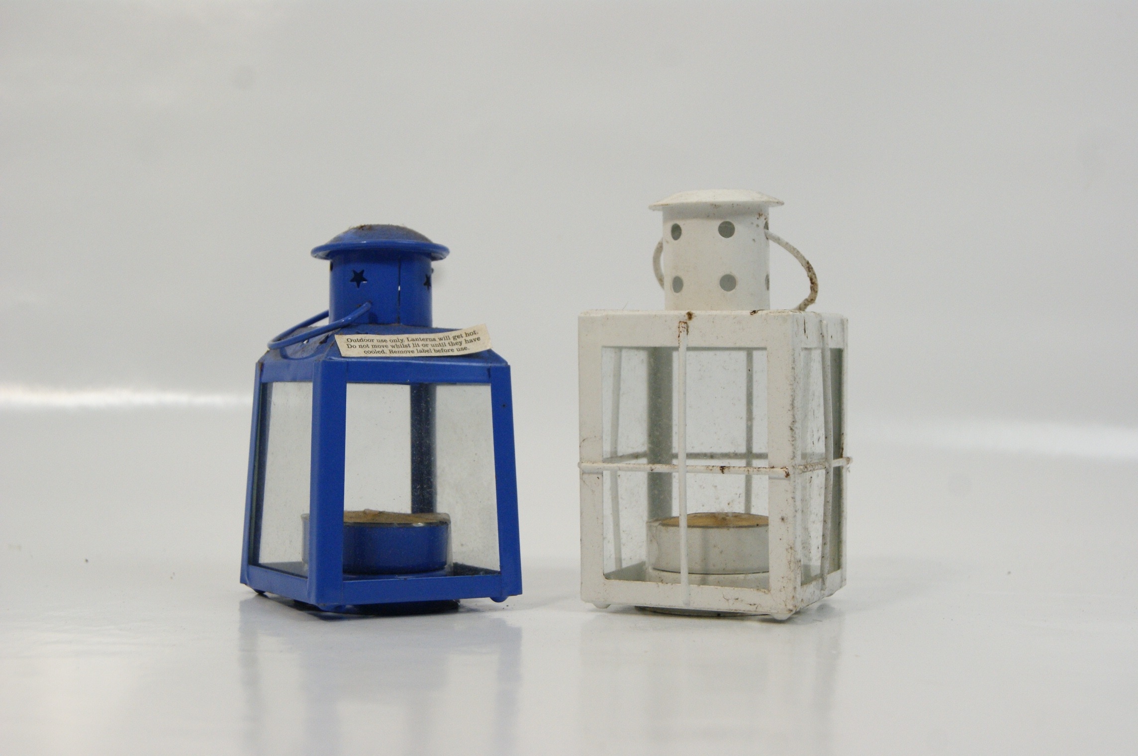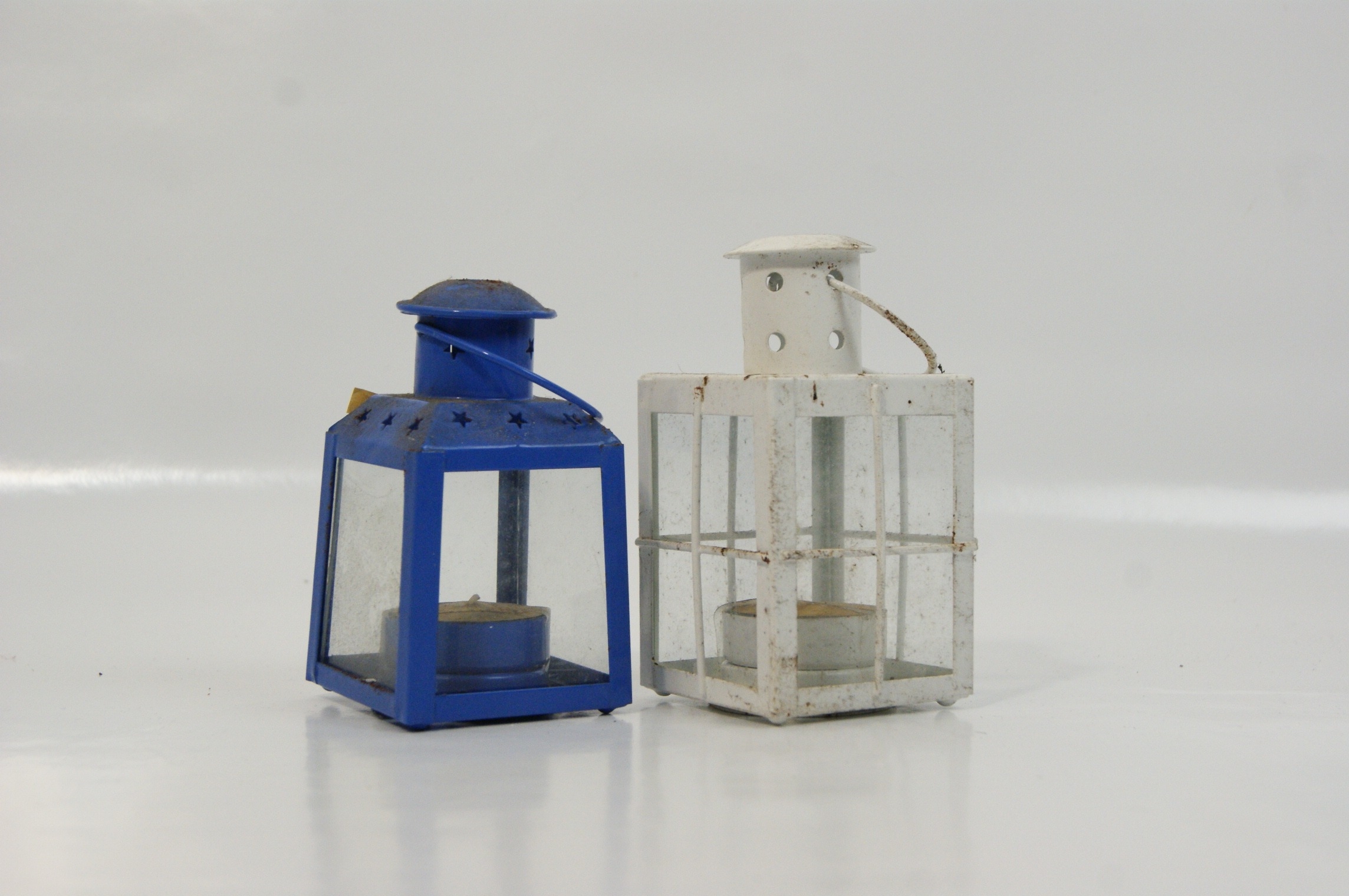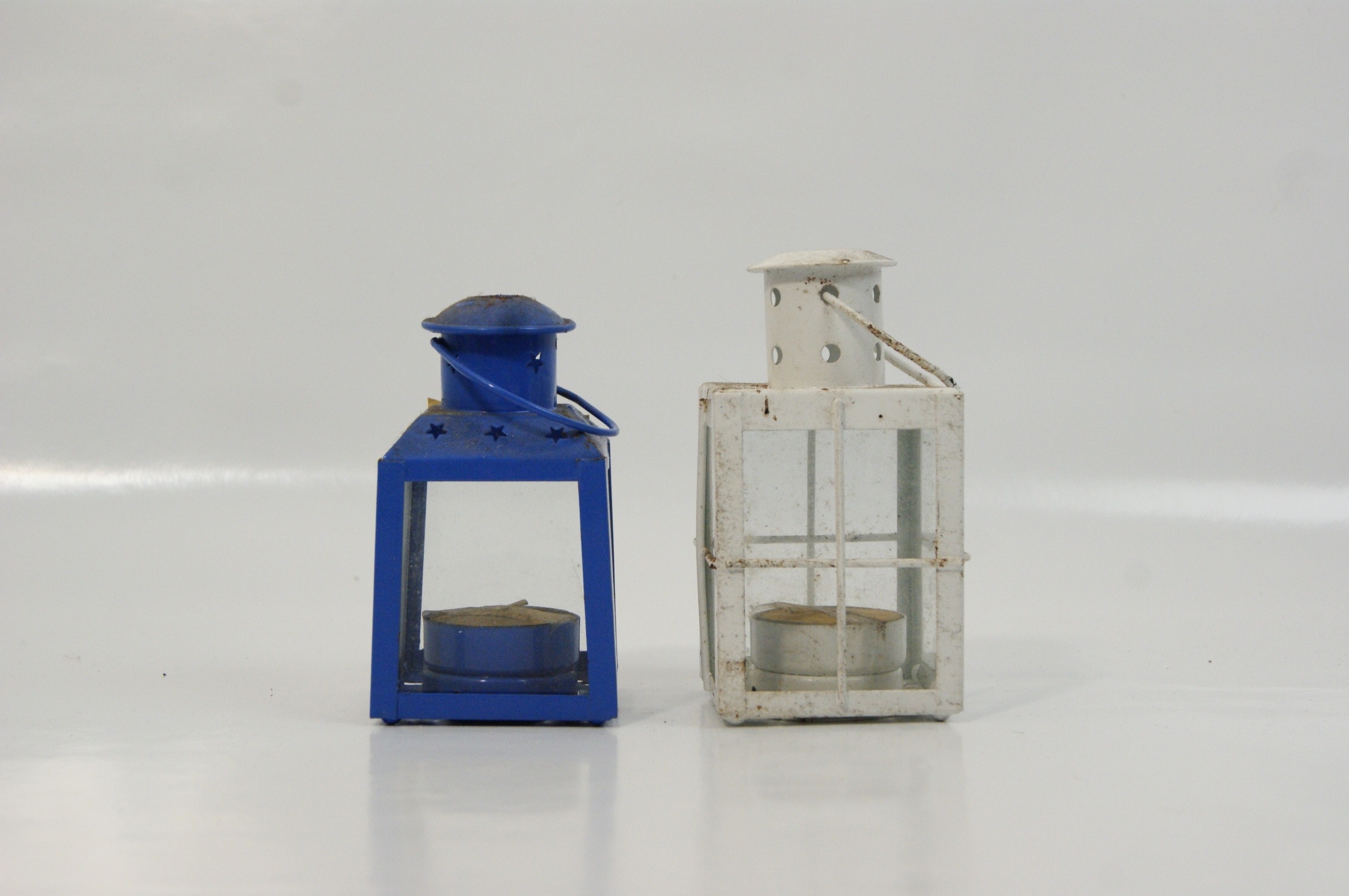 A pair of contemporary decorative tea light lanterns of differing designs. The first is constructed from blue-painted metal, featuring four clear glass panes and a top venting flange with star-shaped decorative cutouts. The second is finished in white-painted metal with a cross-bar cage design over four glass panes and a cylindrical venting flange with circular cutouts. Both lanterns are equipped with wire carrying handles and are designed for non-electric use with tea light candles. Unidentified maker. Dimensions approximately 4.5" H x 3" W.