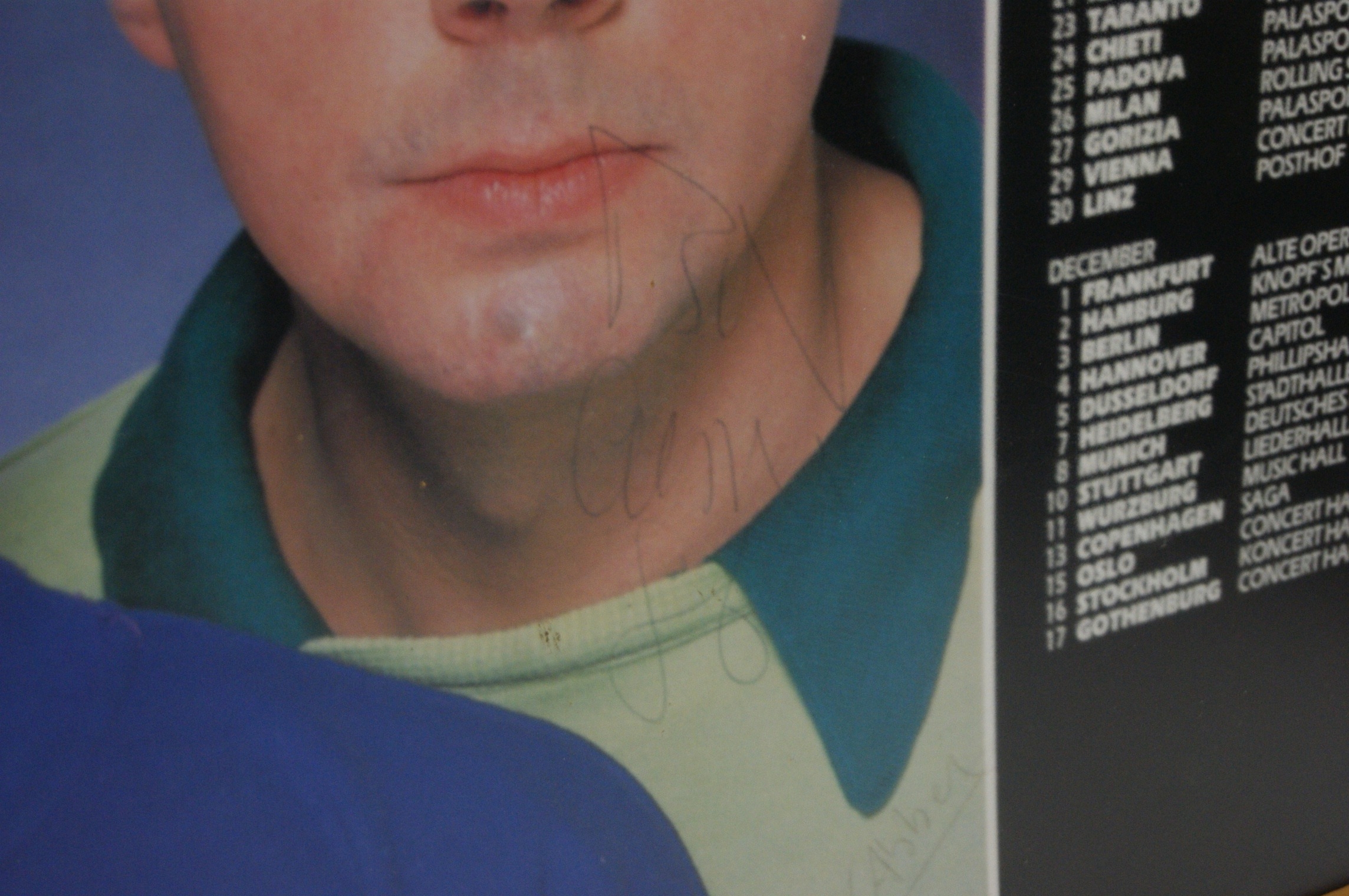 An original promotional music poster for the Ultravox U-VOX World Tour of 1986/87. The poster features a large colour portrait of the band’s lineup at the time, including Billy Currie, Midge Ure, and Chris Cross. To the right, a comprehensive list of tour dates from October to December 1986 is displayed, covering various UK and European venues. The item is hand-signed in ink by three core band members: Midge Ure (centre), Billy Currie (left), and Chris Cross (right). A fourth signature, belonging to touring musician Max Abbe, is present in the lower right corner. This piece represents a significant era in synth-pop history, marking one of the final major tours for the band’s classic-era core members. Please note that while the signatures are consistent with known examples from the period, no formal Certificate of Authenticity (COA) or provenance documentation is included with this lot.