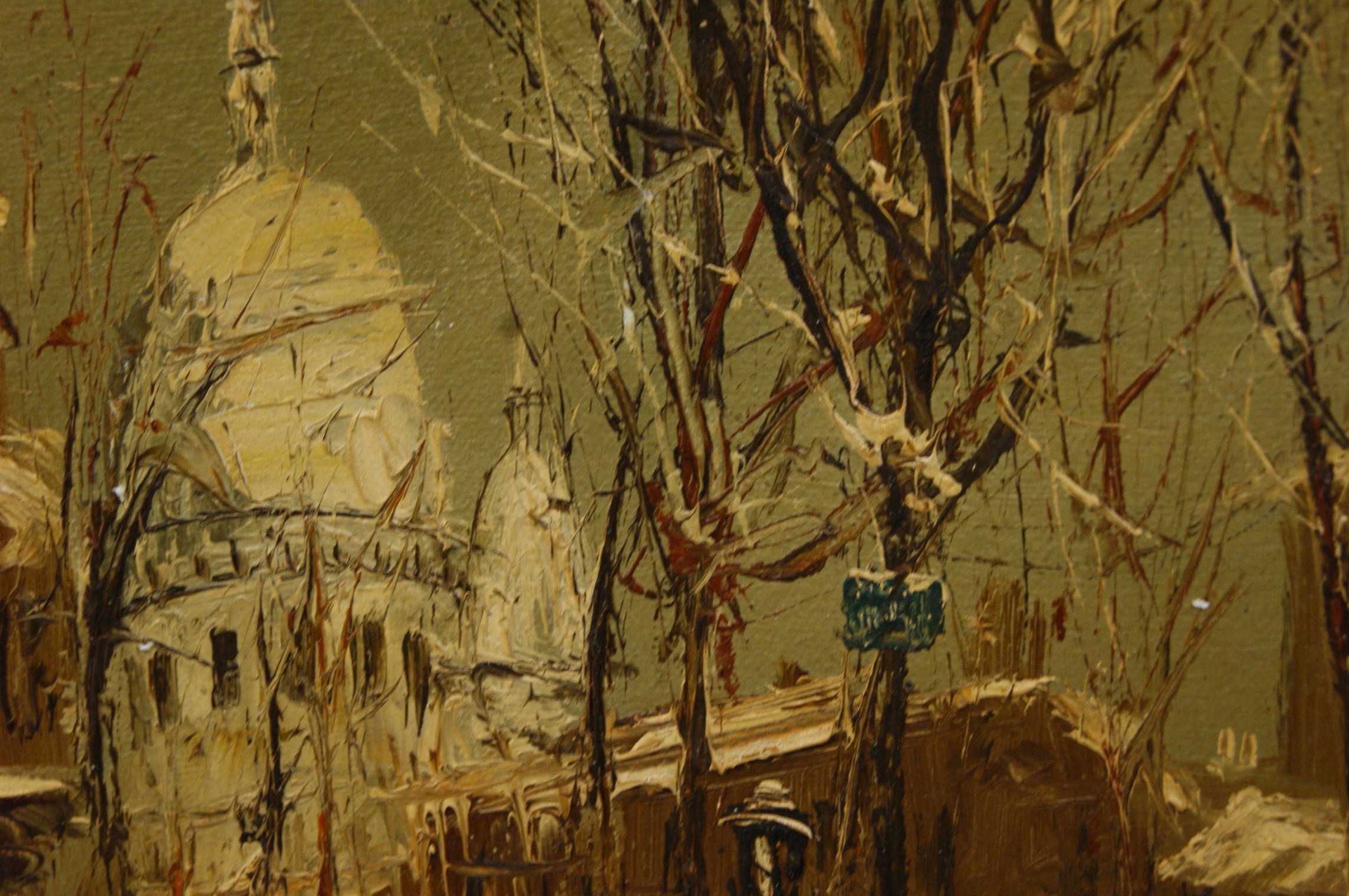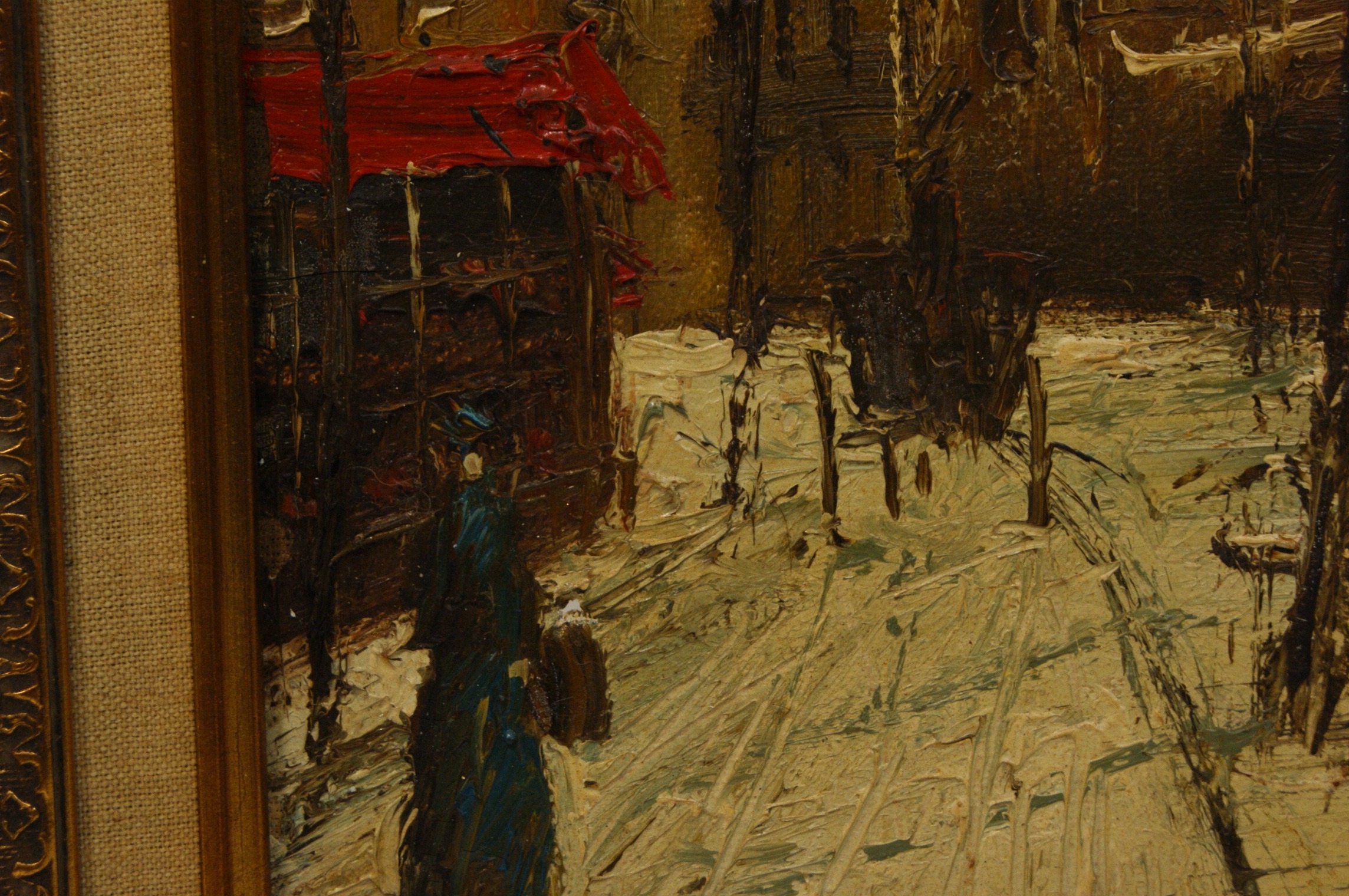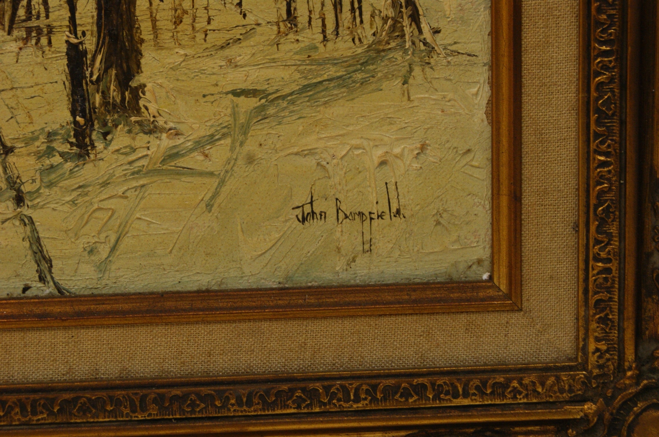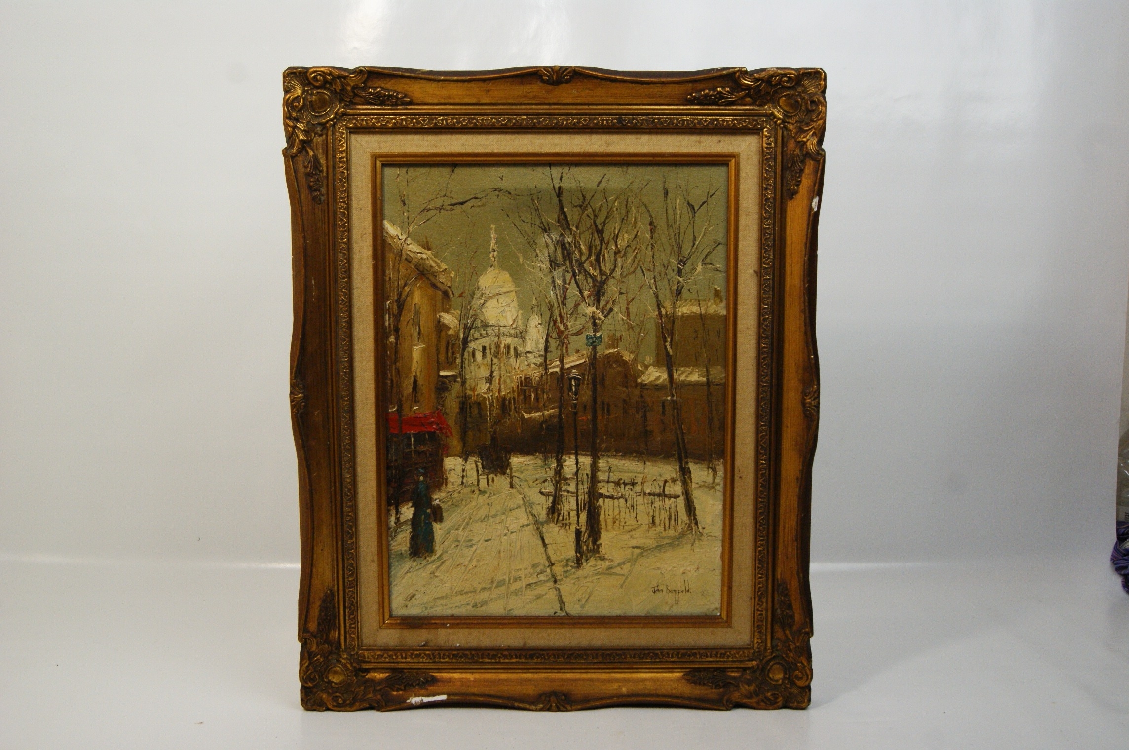 John Bampfield (British, b. 1947), oil on stretched canvas. This mid-20th-century impressionistic work depicts a snow-covered Parisian street, likely in the Montmartre district, with the iconic dome of the Sacré-Cœur Basilica visible in the background. The artist employs a heavy impasto technique, using thick, expressive brushwork to render the snowy foreground, architectural details, and bare winter trees. A solitary figure is depicted near a building with a vibrant red awning, adding a focal point to the muted wintry palette. Signed John Bampfield lower right. The canvas is secured to a wooden stretcher and bears a MADE IN ENGLAND stamp on the margin, alongside handwritten notations in red reading OIL and 3475 on the upper bar. Presented in a large, ornate gilded composite swept frame with a light-coloured linen-covered inner slip. 60cm x 50cm.